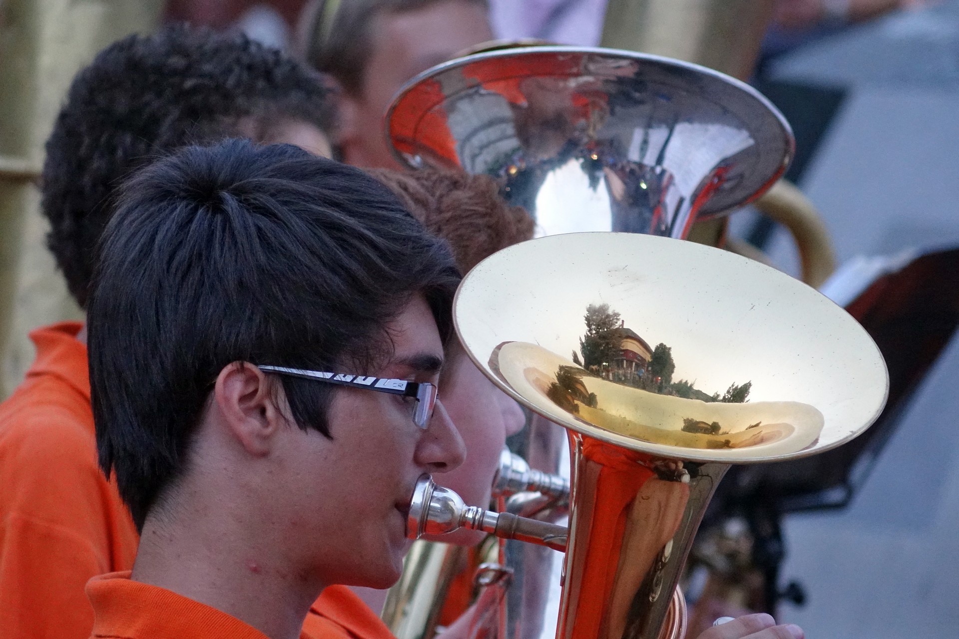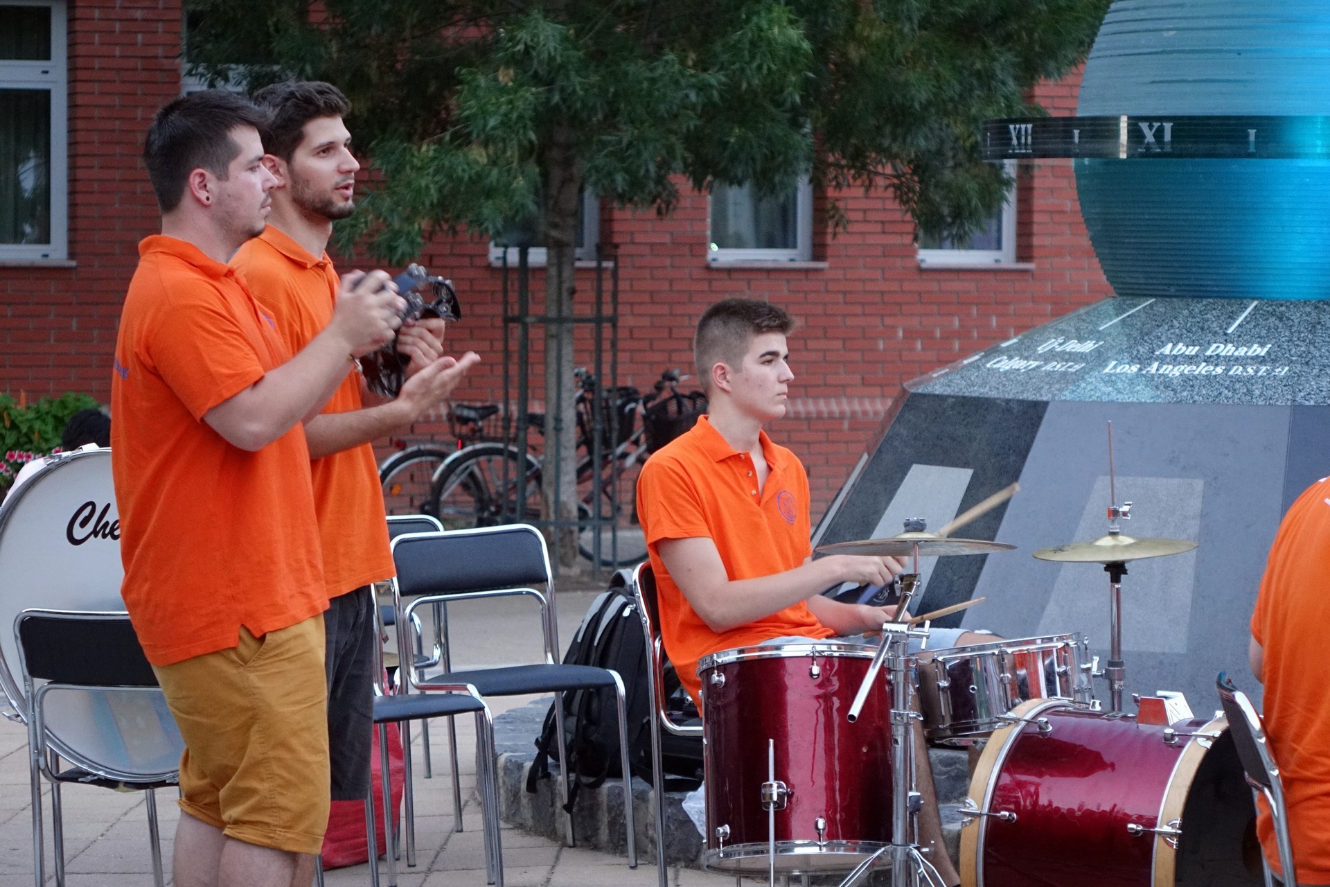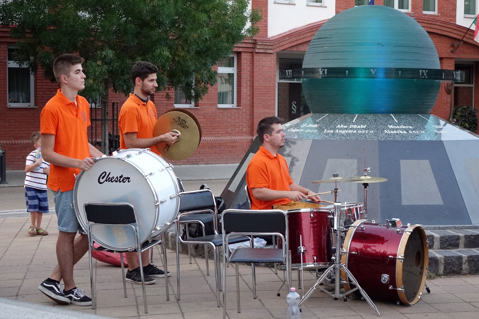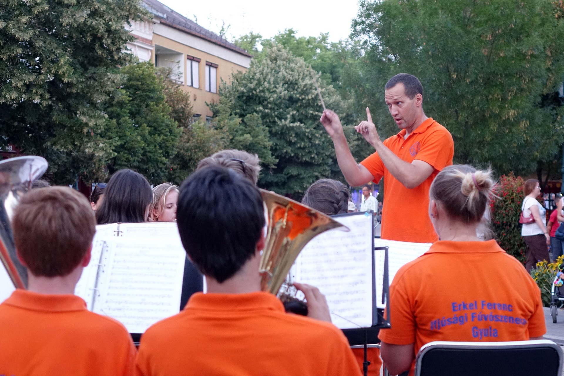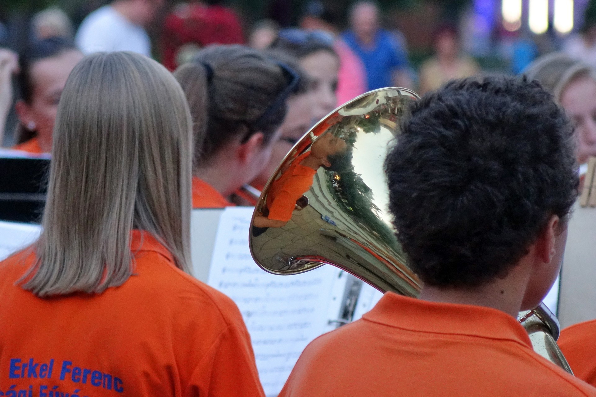Így történt ez augusztus 12-én alkonytájt is a Világóránál, ahol a 2006 óta működő Erkel Ferenc Ifjúsági Fúvószenekar lépett föl. A réz- és fafúvósokból, valamint egy háromtagú ütősszekcióból álló együttes több blokkból álló műsorát Bogdán Gábor karnagy vezényletével adta elő, akit már több formációban is láthatott fújni a publikum.