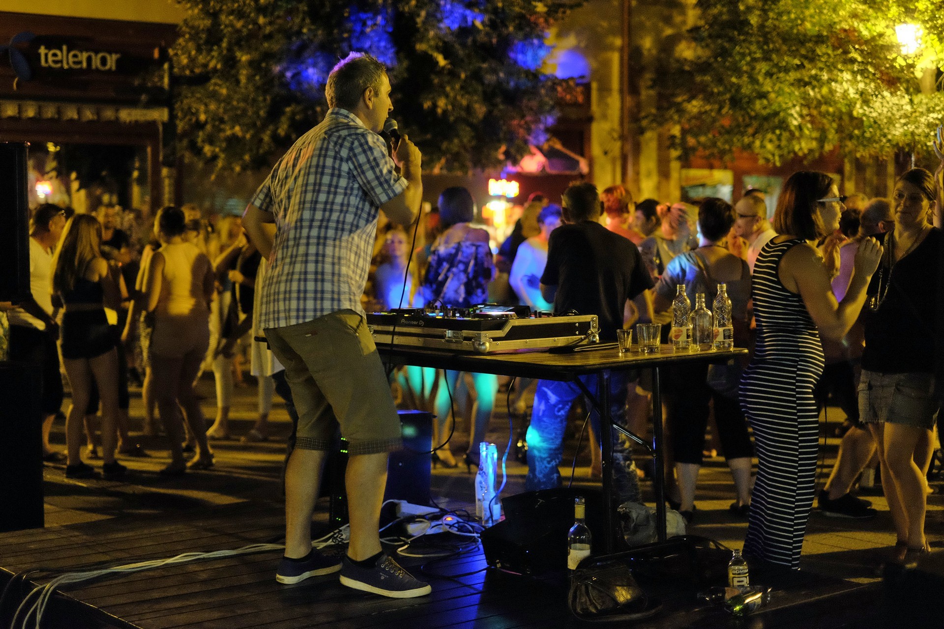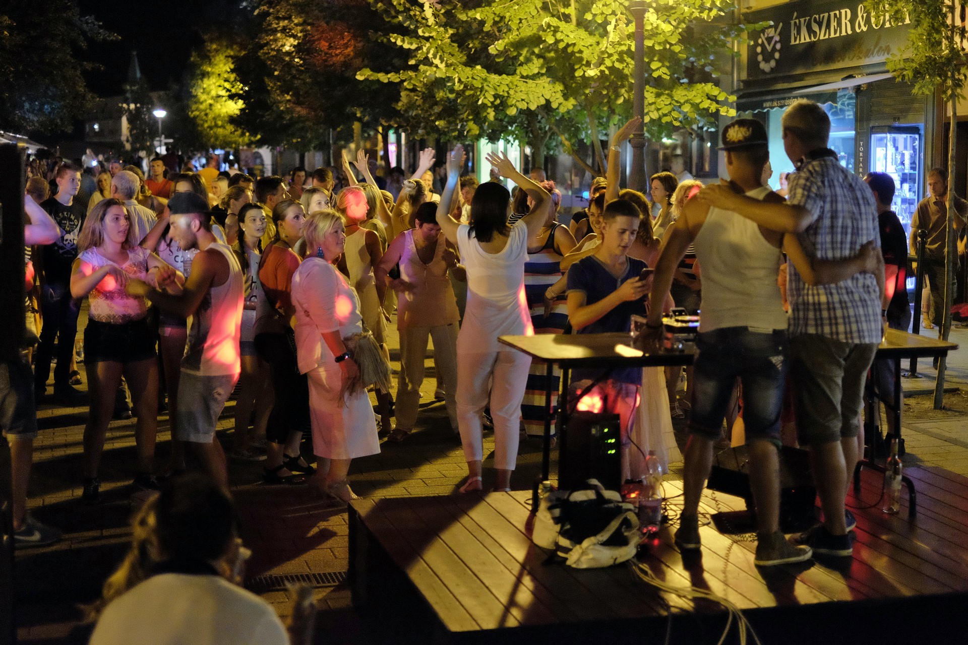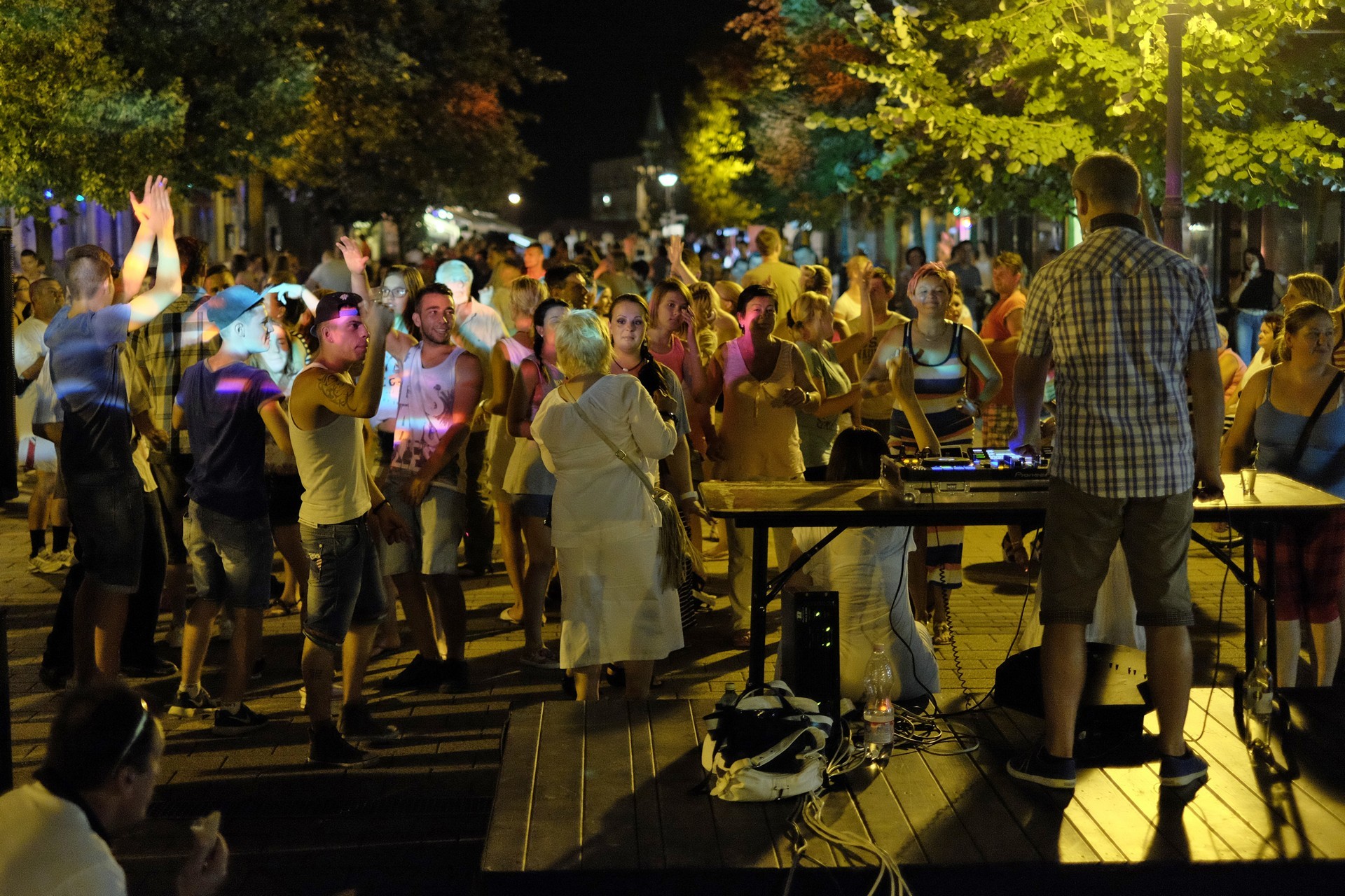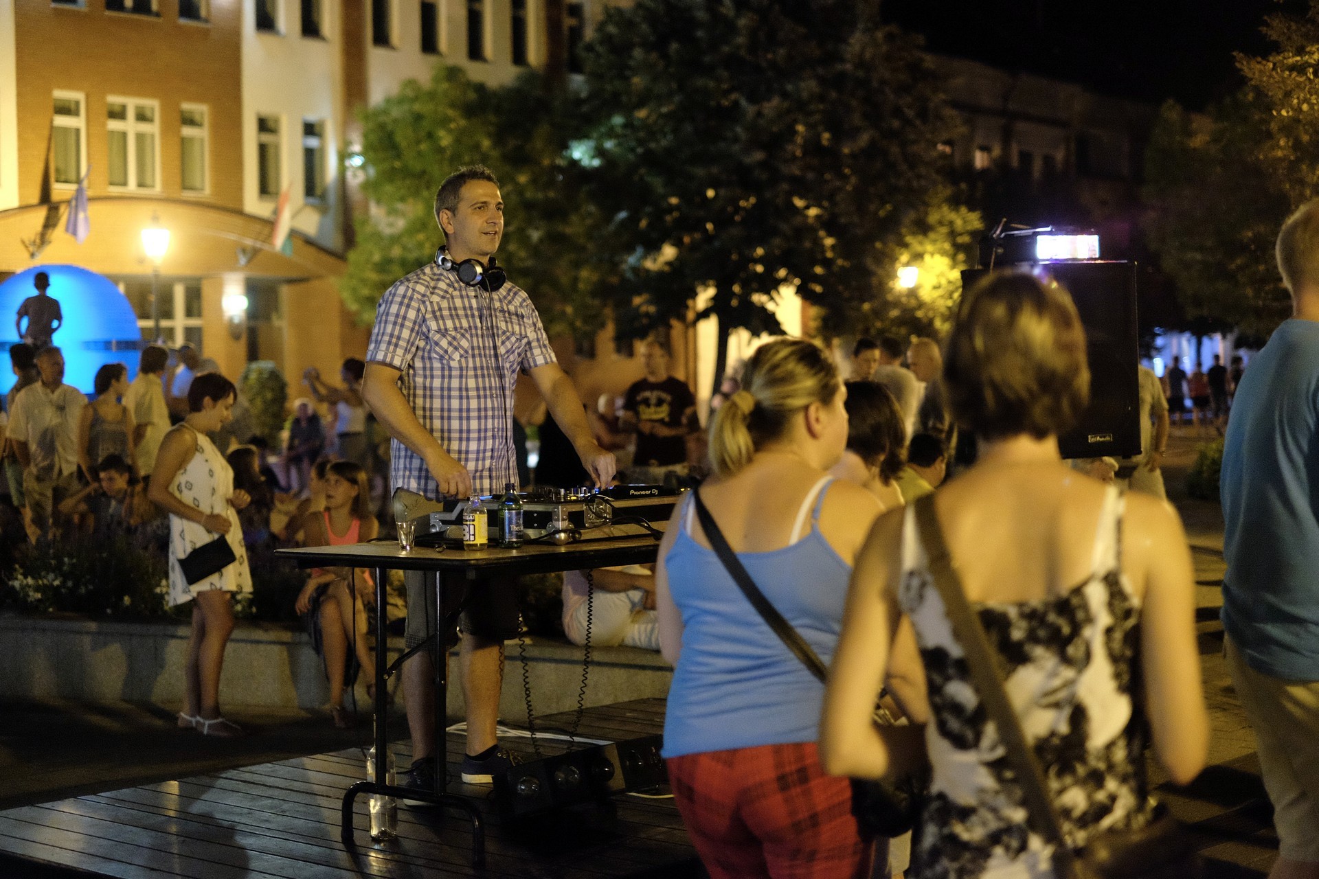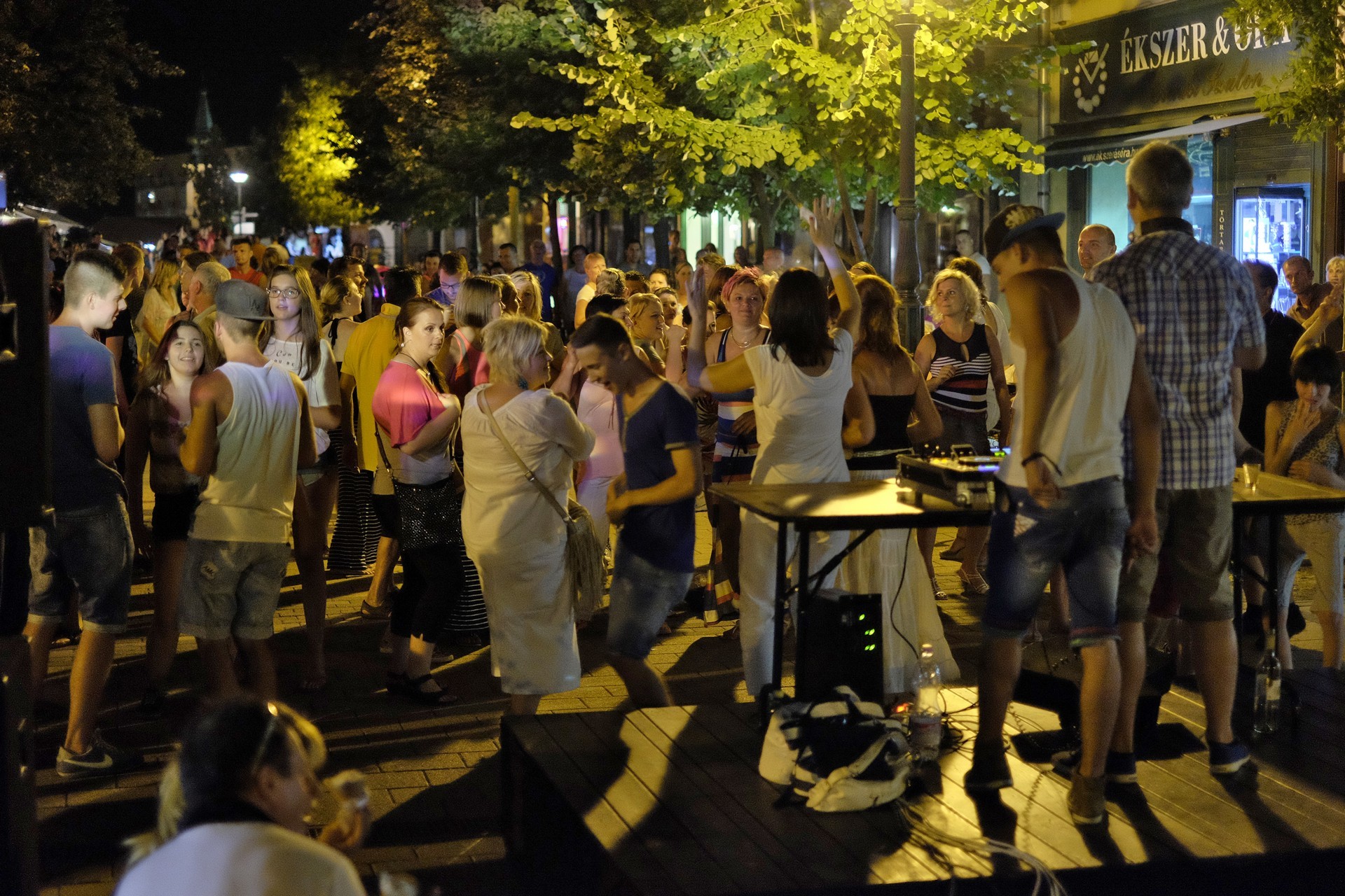 A Gyulai Korzó programsorozatában szinte mindenféle szórakoztató zenének helye van, amelyik tapsolásra, vagy táncra bírja a népeket. Augusztus 15-én este a Világóránál az utóbbi volt a cél, slágerparti invitálta mozgásra a táncos lábakat. A sétáló utcán DJ Ravasz, vagyis Ravasz Attila pörgette a lemezeket – vagy pontosabban szólva keverte az MP3-akat –, hogy a ’70-es, ’80-as és ’90-es évek örökzöld slágereivel bírja ugra-bugrára a jelenlévőket. Bár aznap még tartott a harmadfokú hőségriasztás, a kánikula kicsit csendesedett, és egy-két távoli villámlás is riogatta a népeket, de hiába. Aki már belevetette magát a táncba, nem tágított, és ménkűvel sem lehetett elijeszteni a jó hangulatú, „trópusi” utcabuliról.