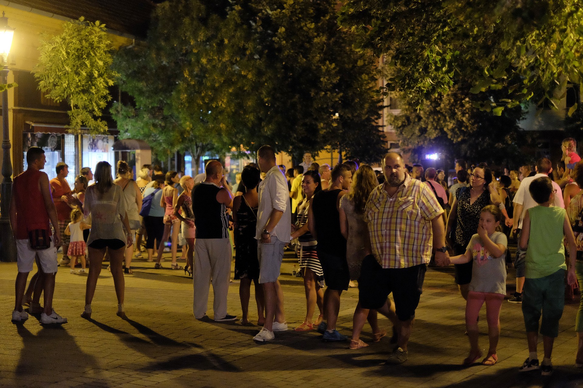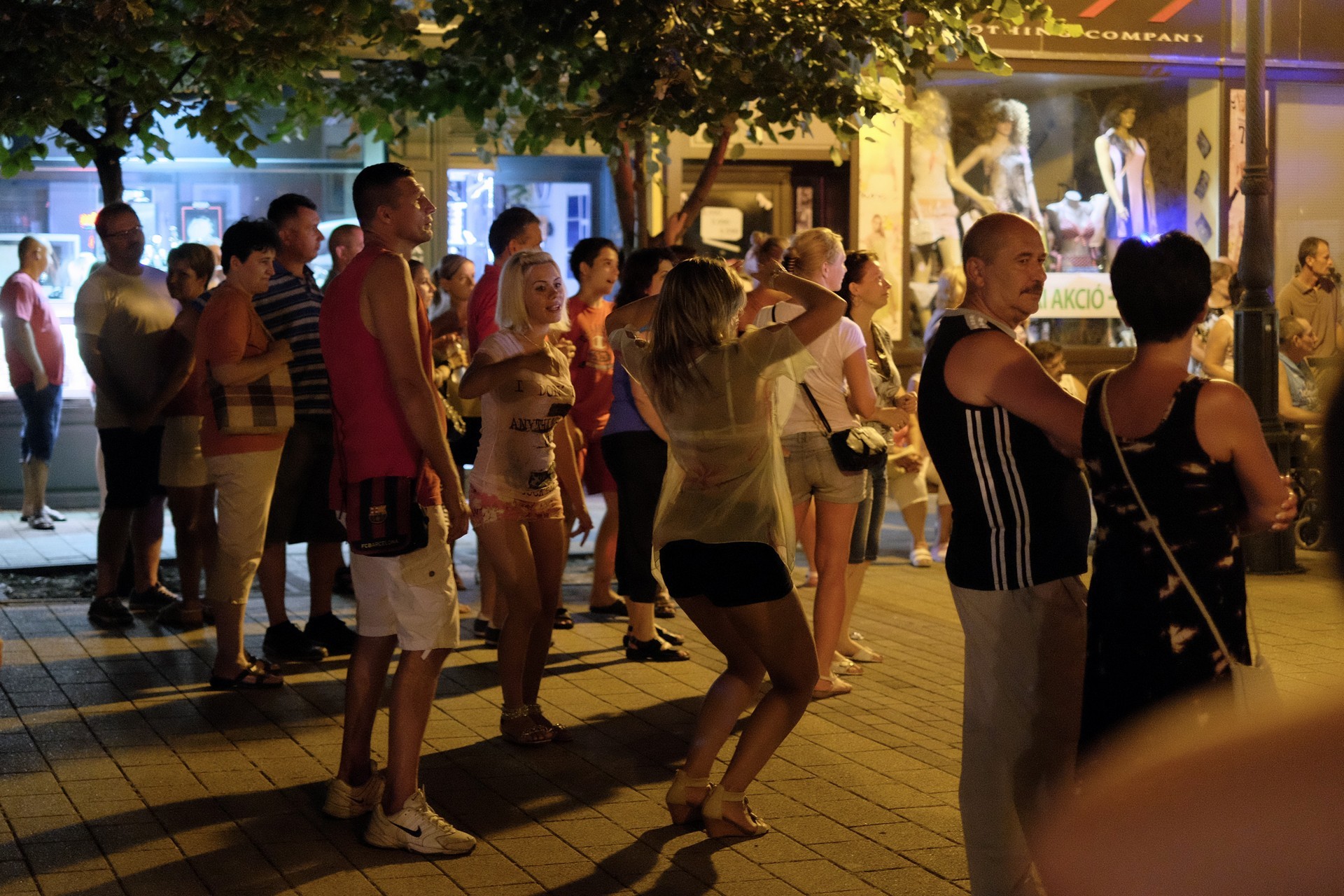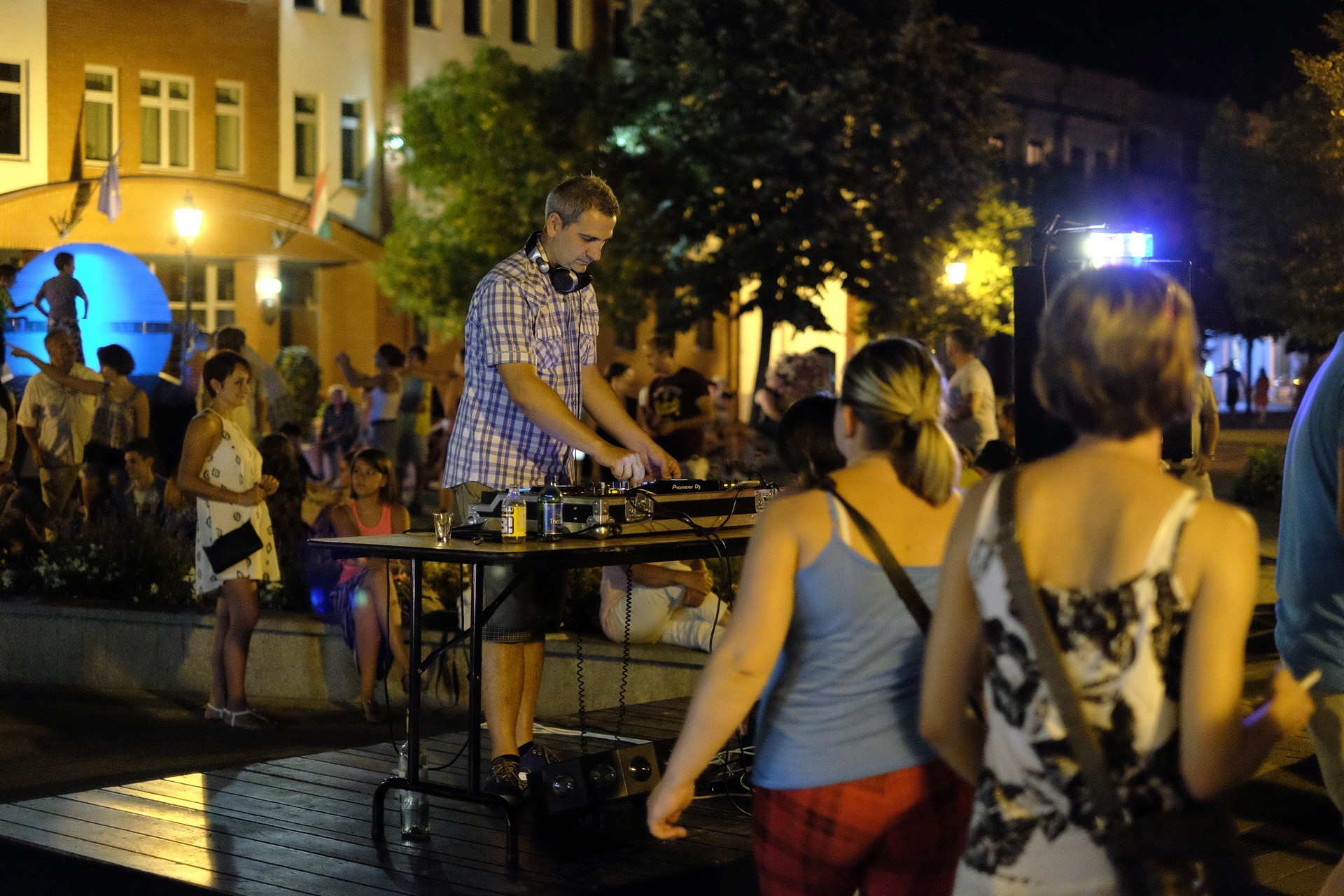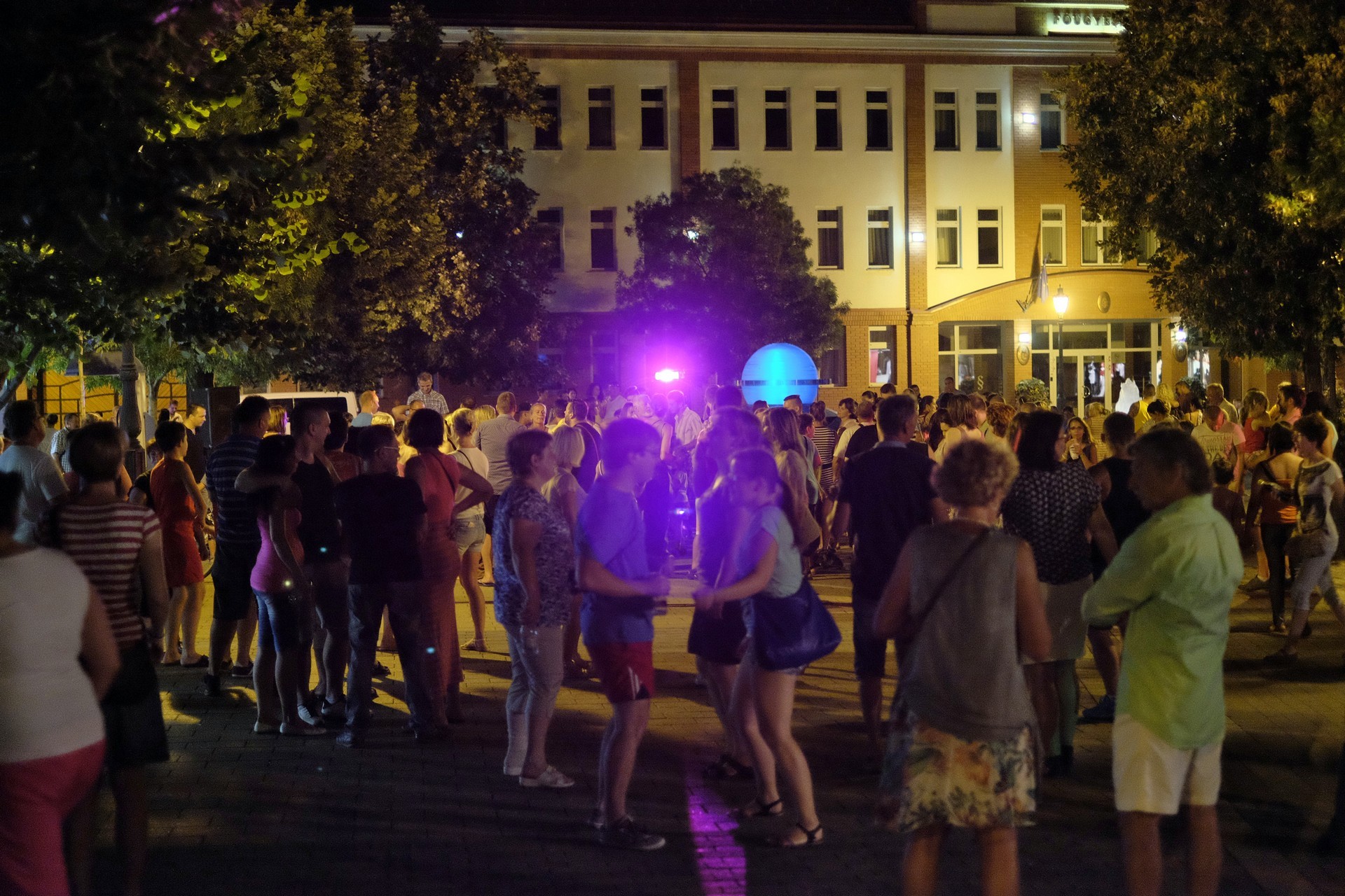 A Gyulai Korzó programsorozatában szinte mindenféle szórakoztató zenének helye van, amelyik tapsolásra, vagy táncra bírja a népeket. Augusztus 15-én este a Világóránál az utóbbi volt a cél, slágerparti invitálta mozgásra a táncos lábakat. A sétáló utcán DJ Ravasz, vagyis Ravasz Attila pörgette a lemezeket – vagy pontosabban szólva keverte az MP3-akat –, hogy a ’70-es, ’80-as és ’90-es évek örökzöld slágereivel bírja ugra-bugrára a jelenlévőket. Bár aznap még tartott a harmadfokú hőségriasztás, a kánikula kicsit csendesedett, és egy-két távoli villámlás is riogatta a népeket, de hiába. Aki már belevetette magát a táncba, nem tágított, és ménkűvel sem lehetett elijeszteni a jó hangulatú, „trópusi” utcabuliról.