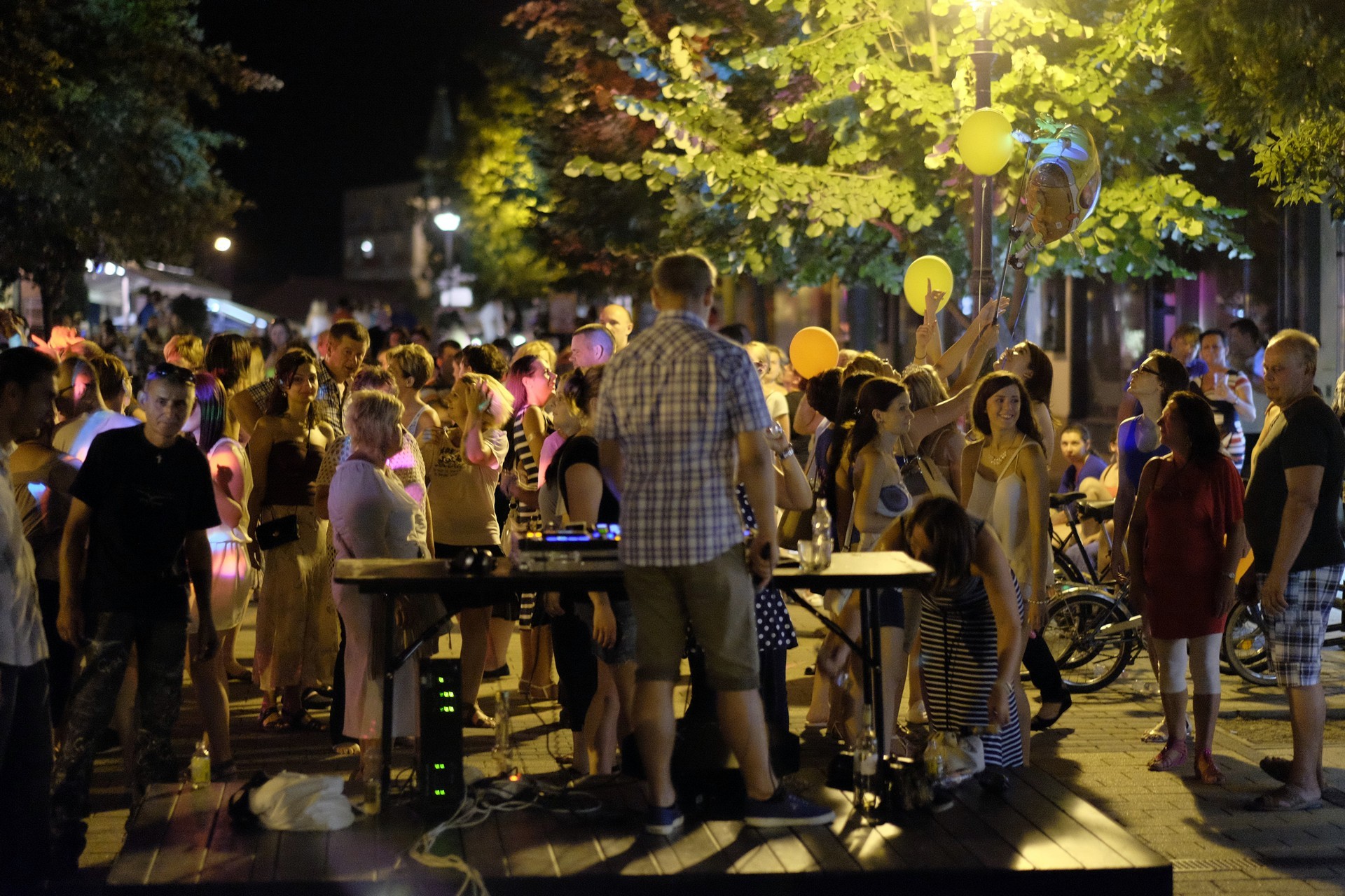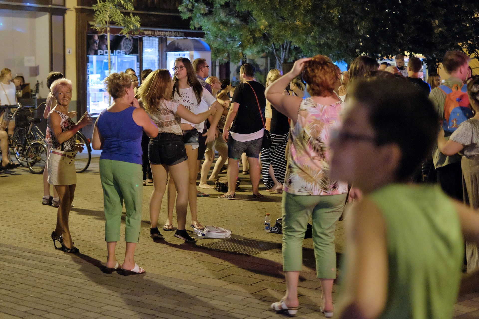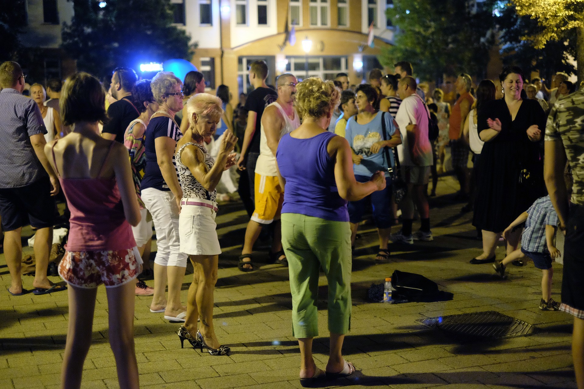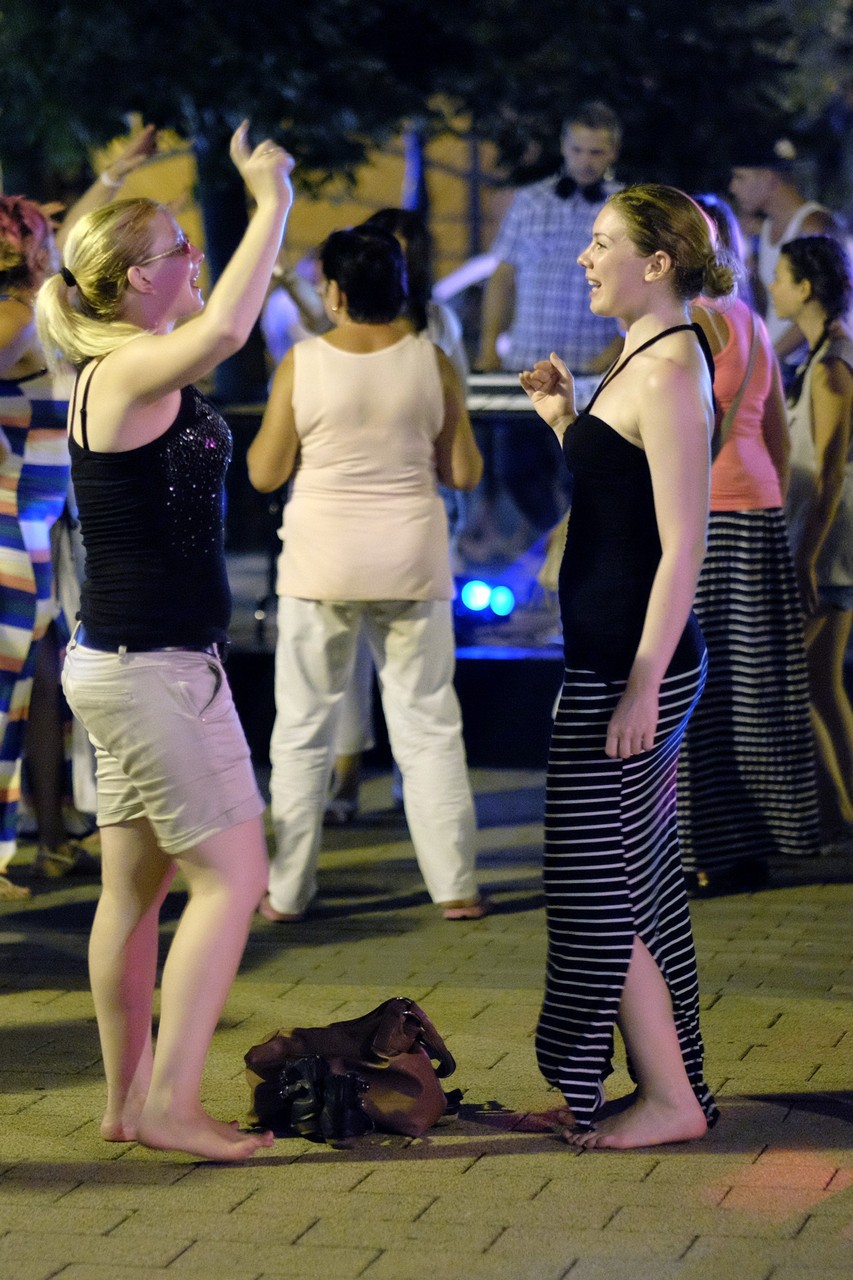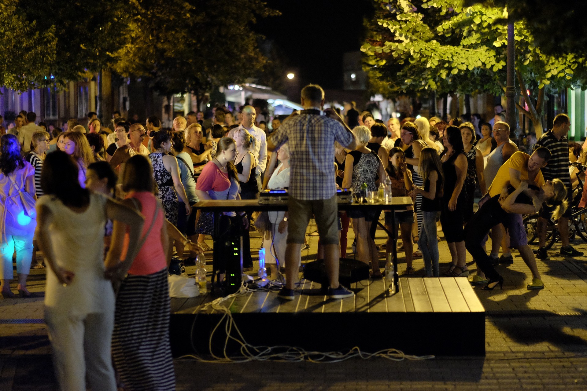 A Gyulai Korzó programsorozatában szinte mindenféle szórakoztató zenének helye van, amelyik tapsolásra, vagy táncra bírja a népeket. Augusztus 15-én este a Világóránál az utóbbi volt a cél, slágerparti invitálta mozgásra a táncos lábakat. A sétáló utcán DJ Ravasz, vagyis Ravasz Attila pörgette a lemezeket – vagy pontosabban szólva keverte az MP3-akat –, hogy a ’70-es, ’80-as és ’90-es évek örökzöld slágereivel bírja ugra-bugrára a jelenlévőket. Bár aznap még tartott a harmadfokú hőségriasztás, a kánikula kicsit csendesedett, és egy-két távoli villámlás is riogatta a népeket, de hiába. Aki már belevetette magát a táncba, nem tágított, és ménkűvel sem lehetett elijeszteni a jó hangulatú, „trópusi” utcabuliról.