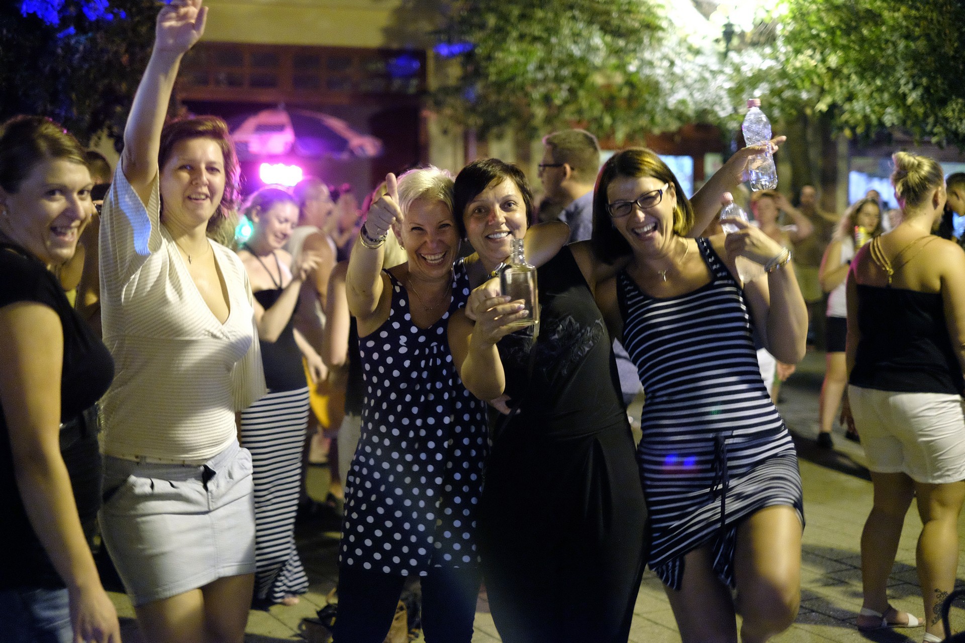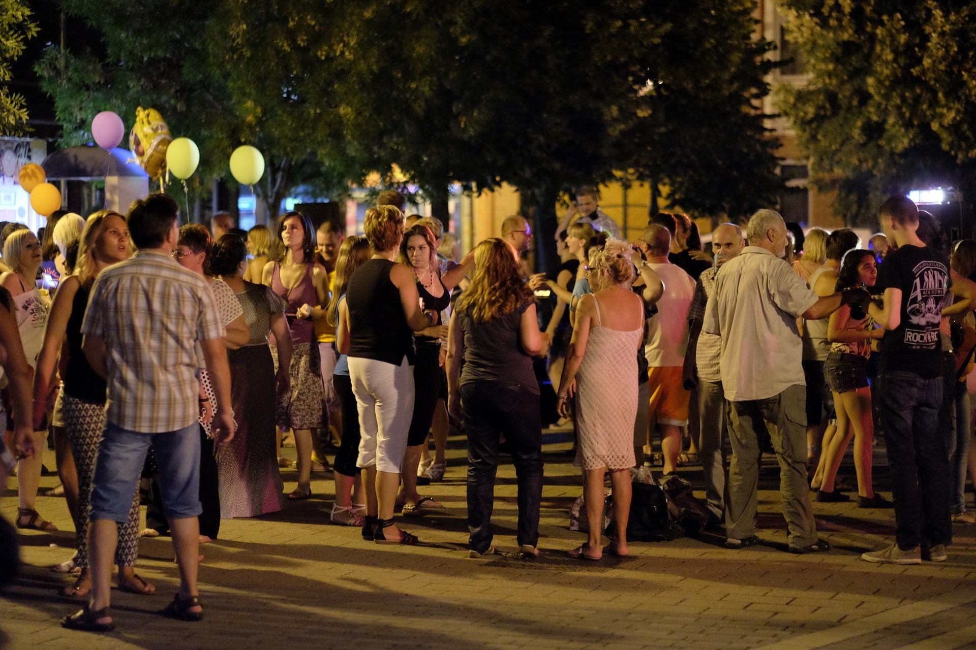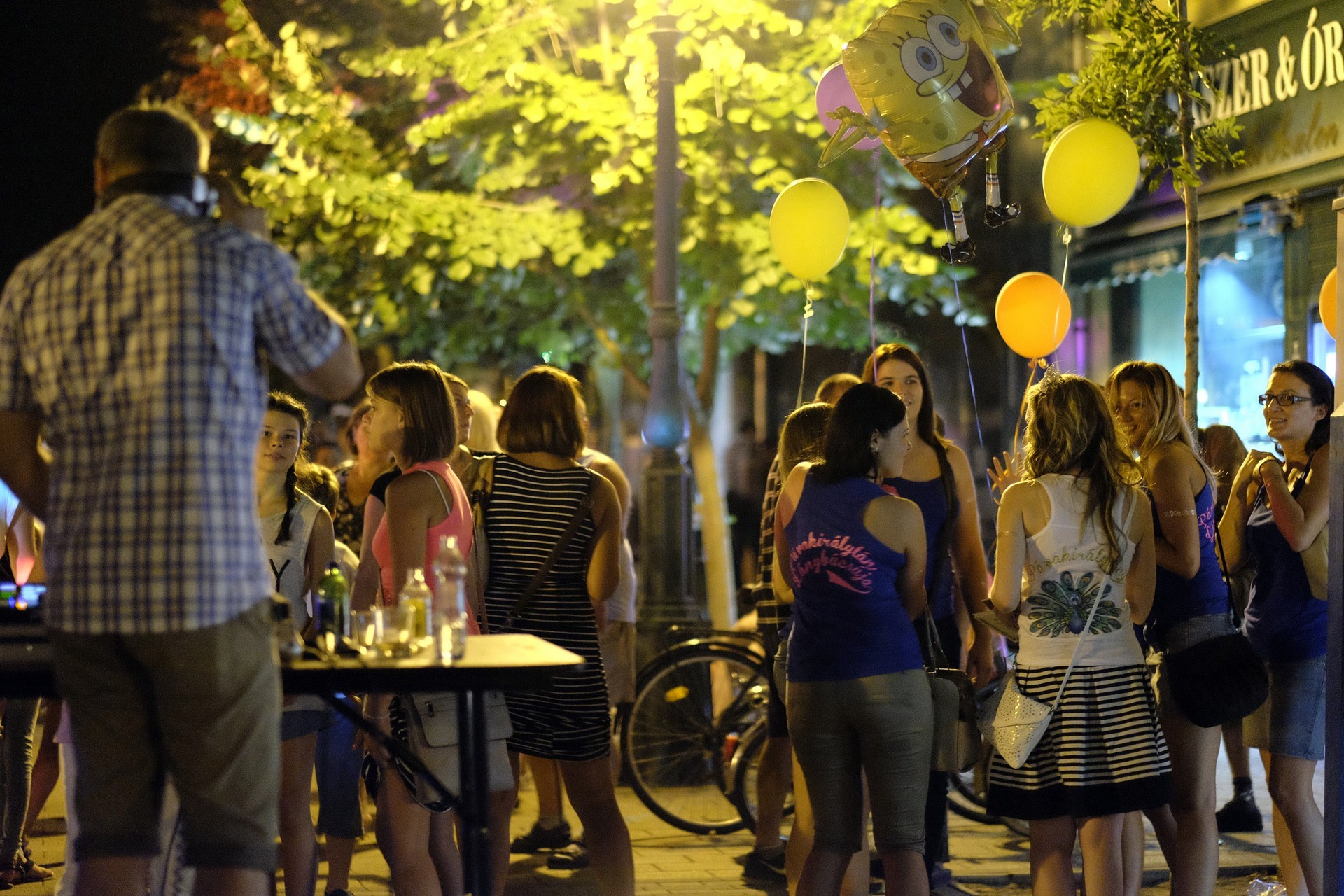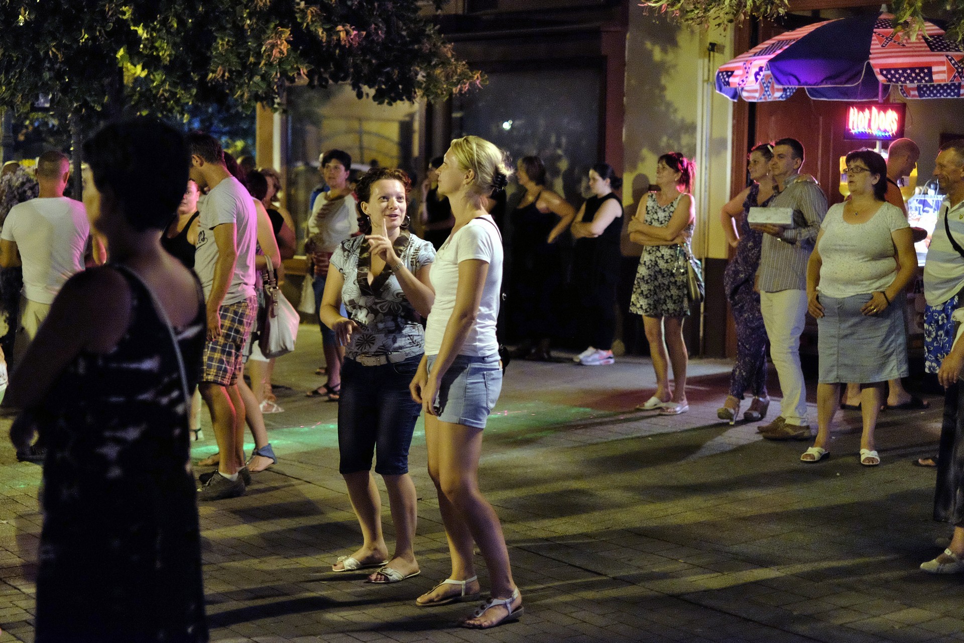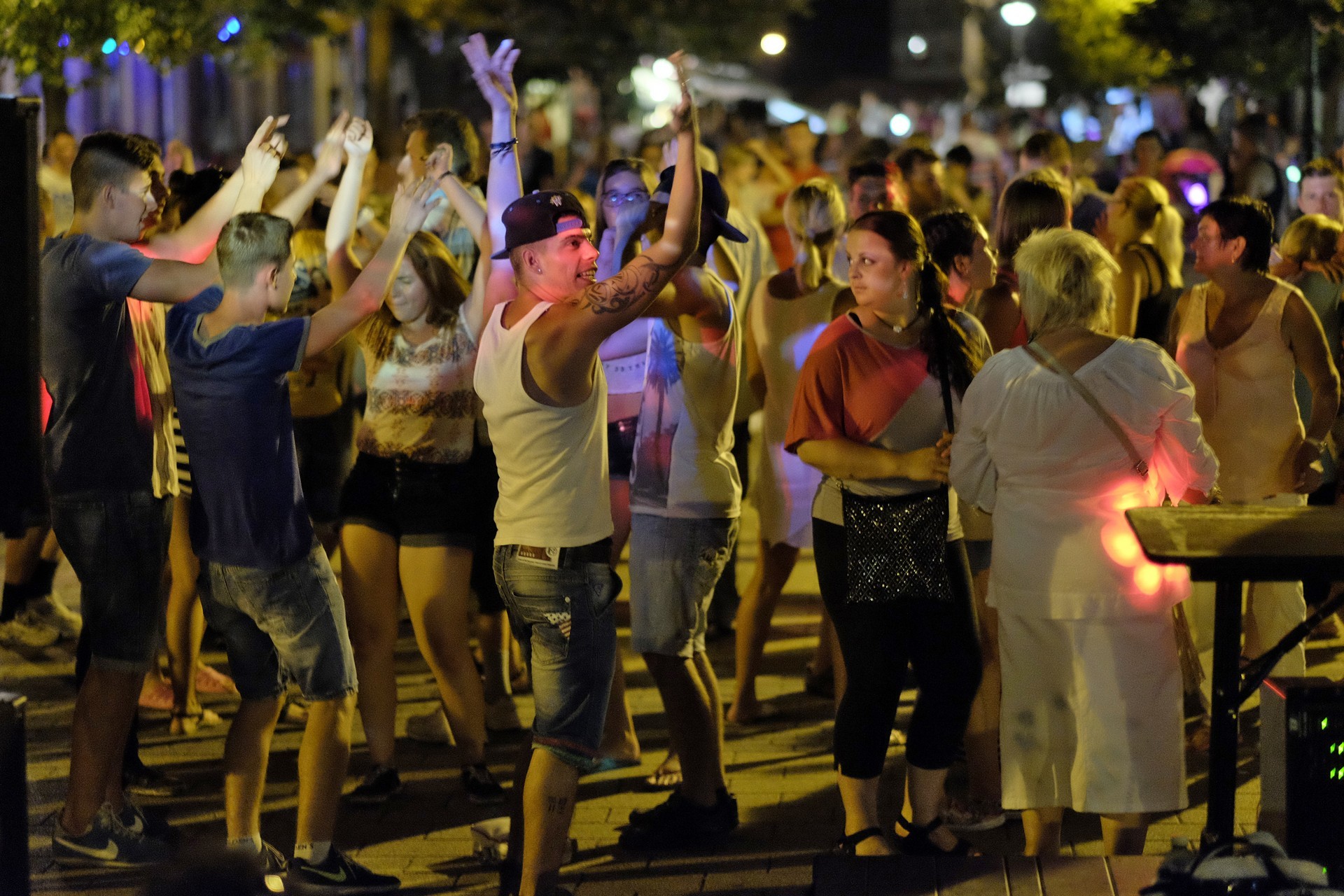 A Gyulai Korzó programsorozatában szinte mindenféle szórakoztató zenének helye van, amelyik tapsolásra, vagy táncra bírja a népeket. Augusztus 15-én este a Világóránál az utóbbi volt a cél, slágerparti invitálta mozgásra a táncos lábakat. A sétáló utcán DJ Ravasz, vagyis Ravasz Attila pörgette a lemezeket – vagy pontosabban szólva keverte az MP3-akat –, hogy a ’70-es, ’80-as és ’90-es évek örökzöld slágereivel bírja ugra-bugrára a jelenlévőket. Bár aznap még tartott a harmadfokú hőségriasztás, a kánikula kicsit csendesedett, és egy-két távoli villámlás is riogatta a népeket, de hiába. Aki már belevetette magát a táncba, nem tágított, és ménkűvel sem lehetett elijeszteni a jó hangulatú, „trópusi” utcabuliról.