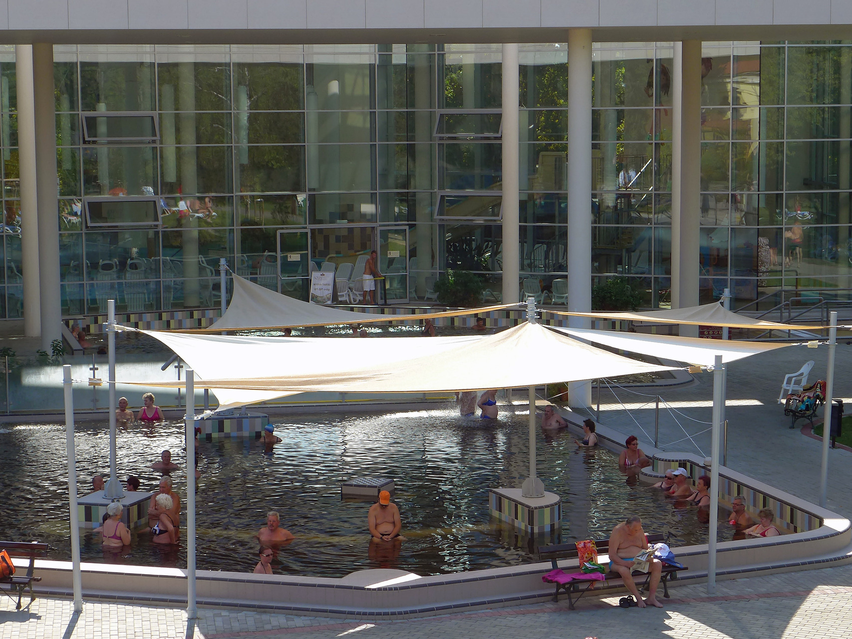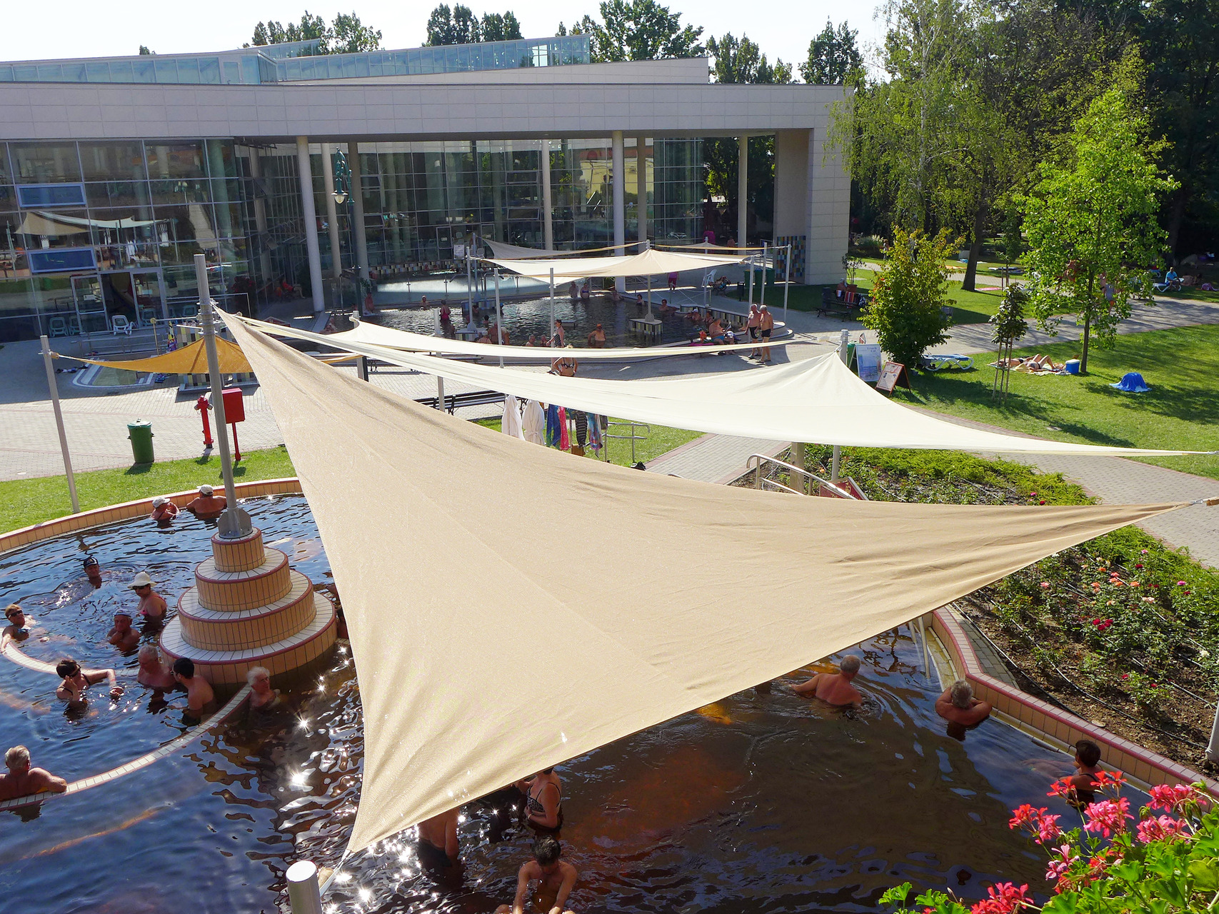 A várfürdőben további beruházások is történtek: napvitorlákat szereltek fel a az egyik gyógymedence és a polipmedence fölé. Boros László Attila kifejtette: a kihelyezett árnyékolók szín- és anyaghasználatukban is illeszkednek az AquaPalota és a fürdő belső tereinek természetes harmóniát árasztó stílusához.