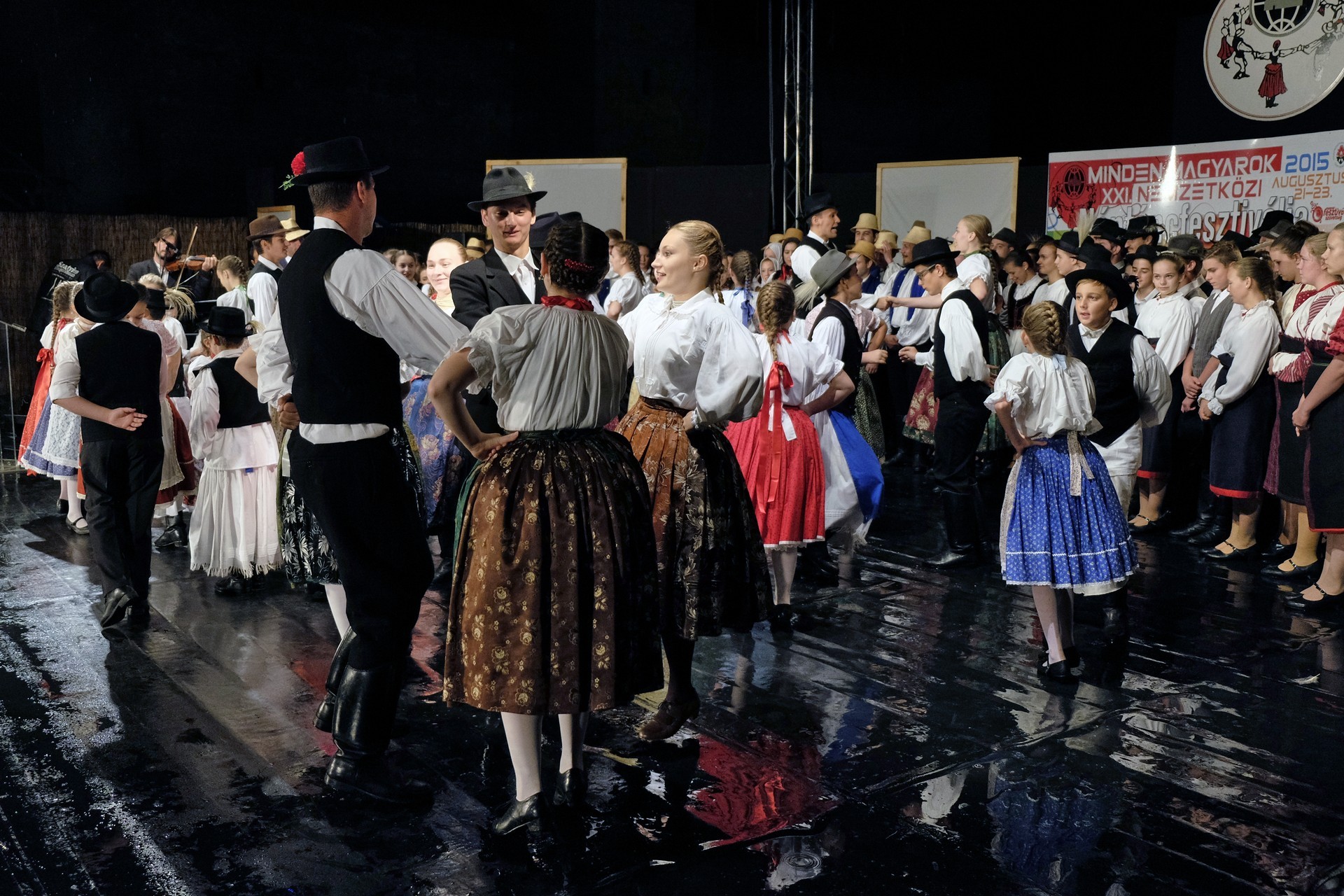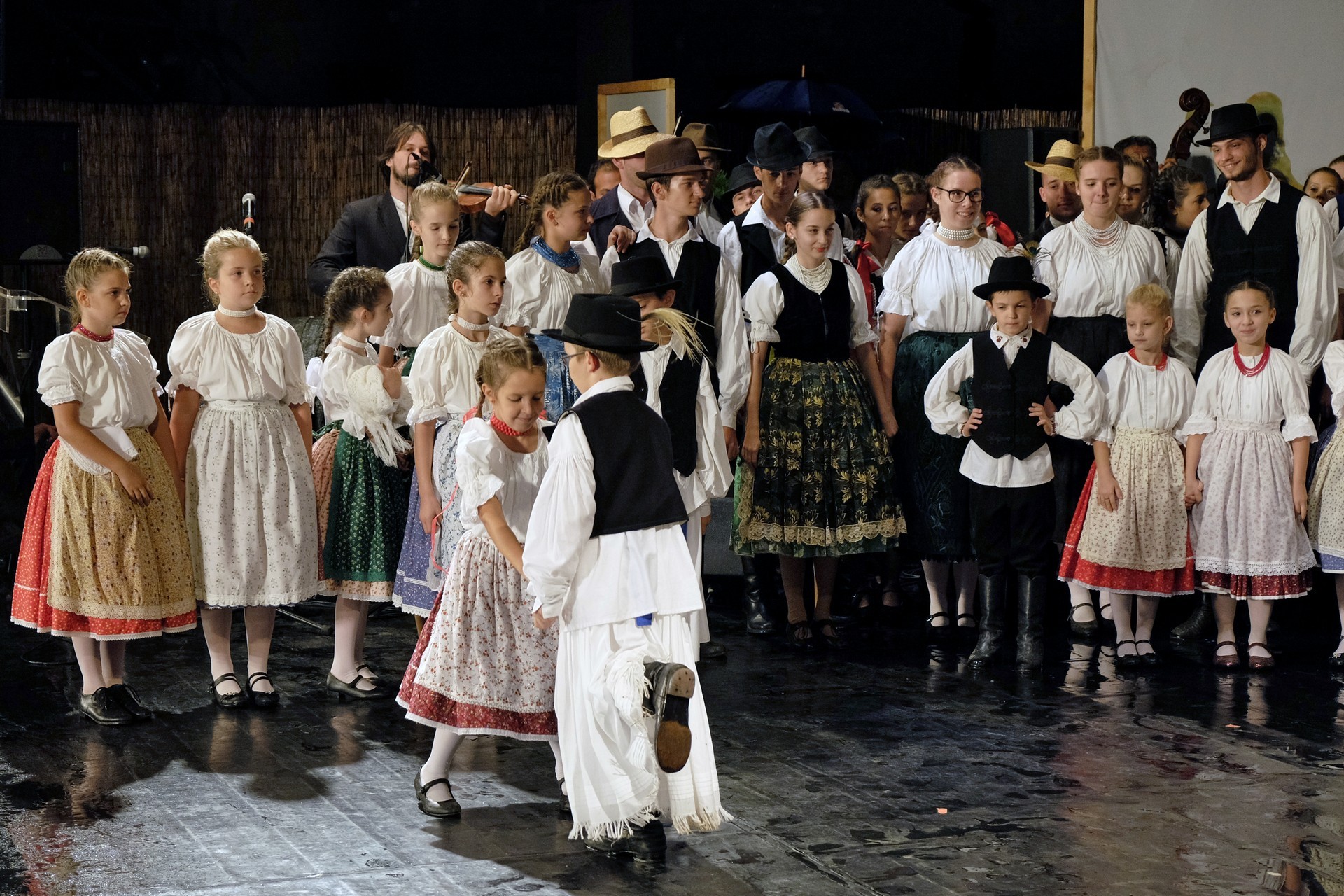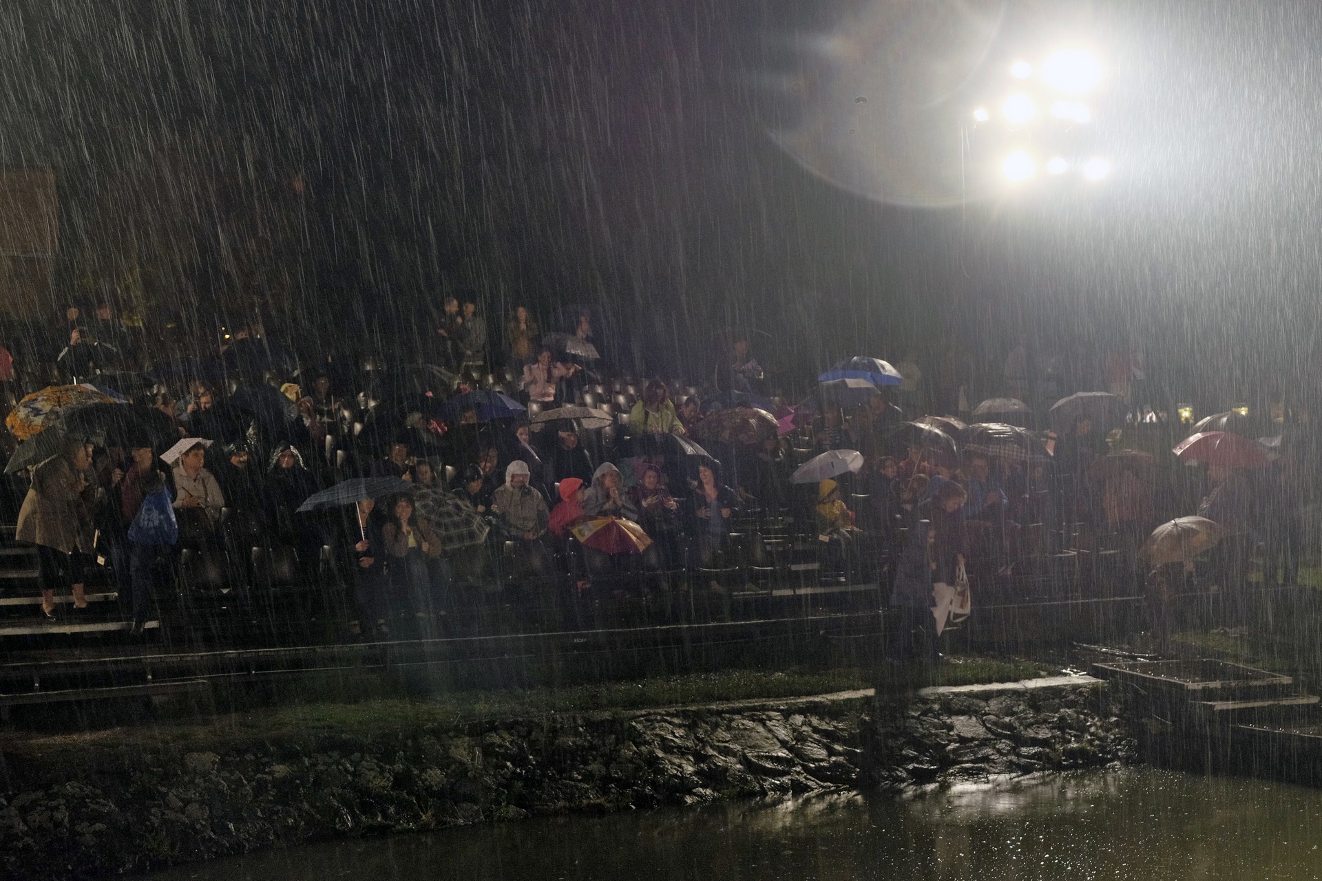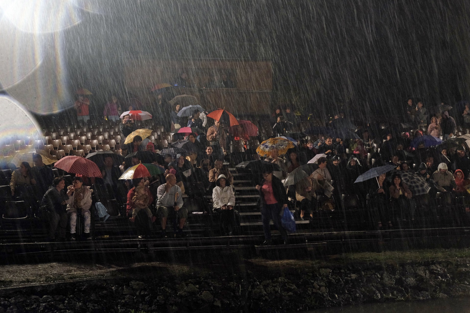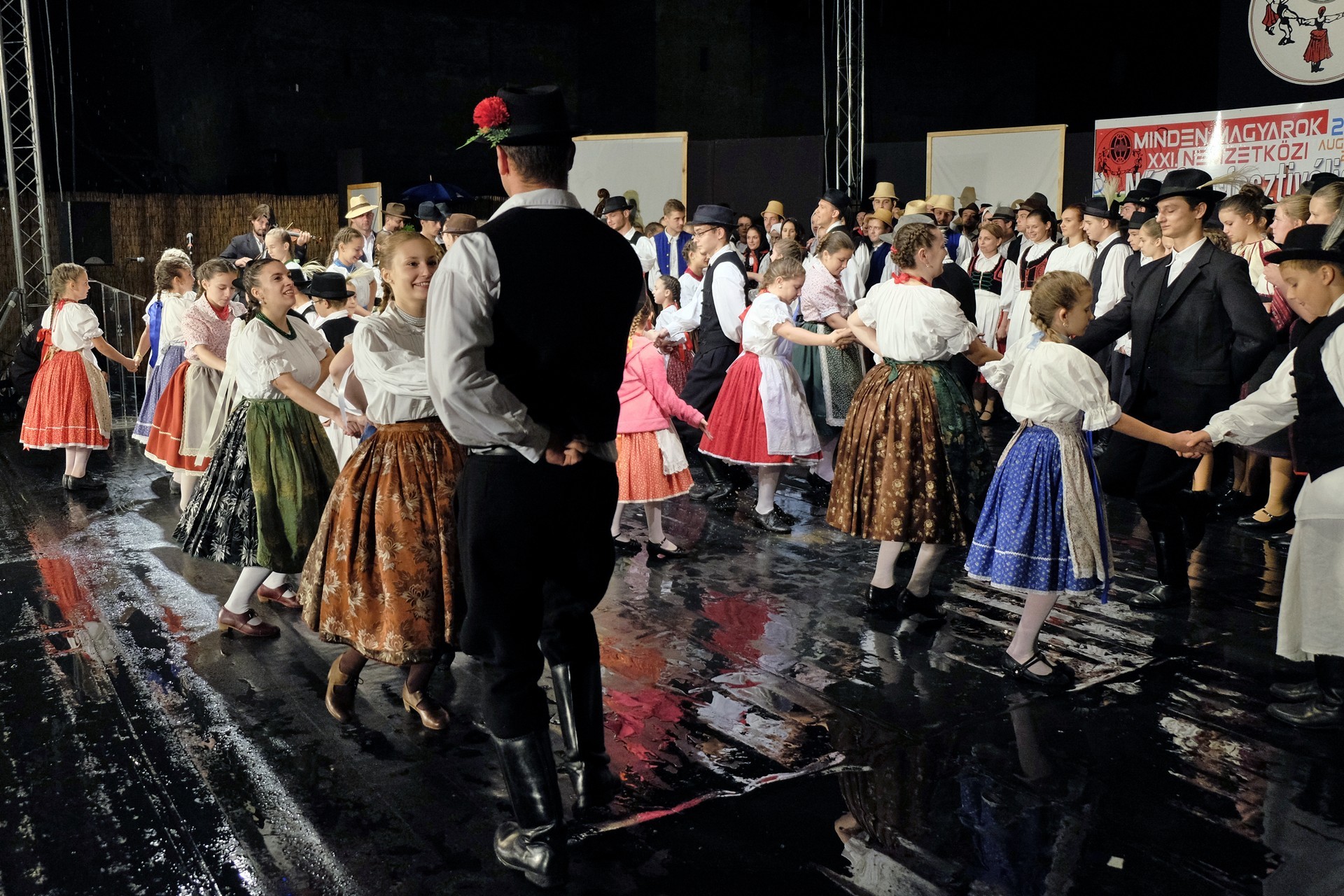 A tószínpadon zajló hivatalos megnyitó alatt sűrűn szemerkélő eső erős szitálásra váltott át, de a nézőtéren ülő és a partoldalban álldogáló, esernyőkkel és esőkabátokkal felszerelt több száznyi érdeklődő nem tágított, várta a táncokat. A színpad azonban hiába volt fedett, a zápor oldalról is támadott, és egyre több csordogáló patak és tócsa alakult ki a színteret betöltő, népviseletbe öltözött táncoshad lába alatt.