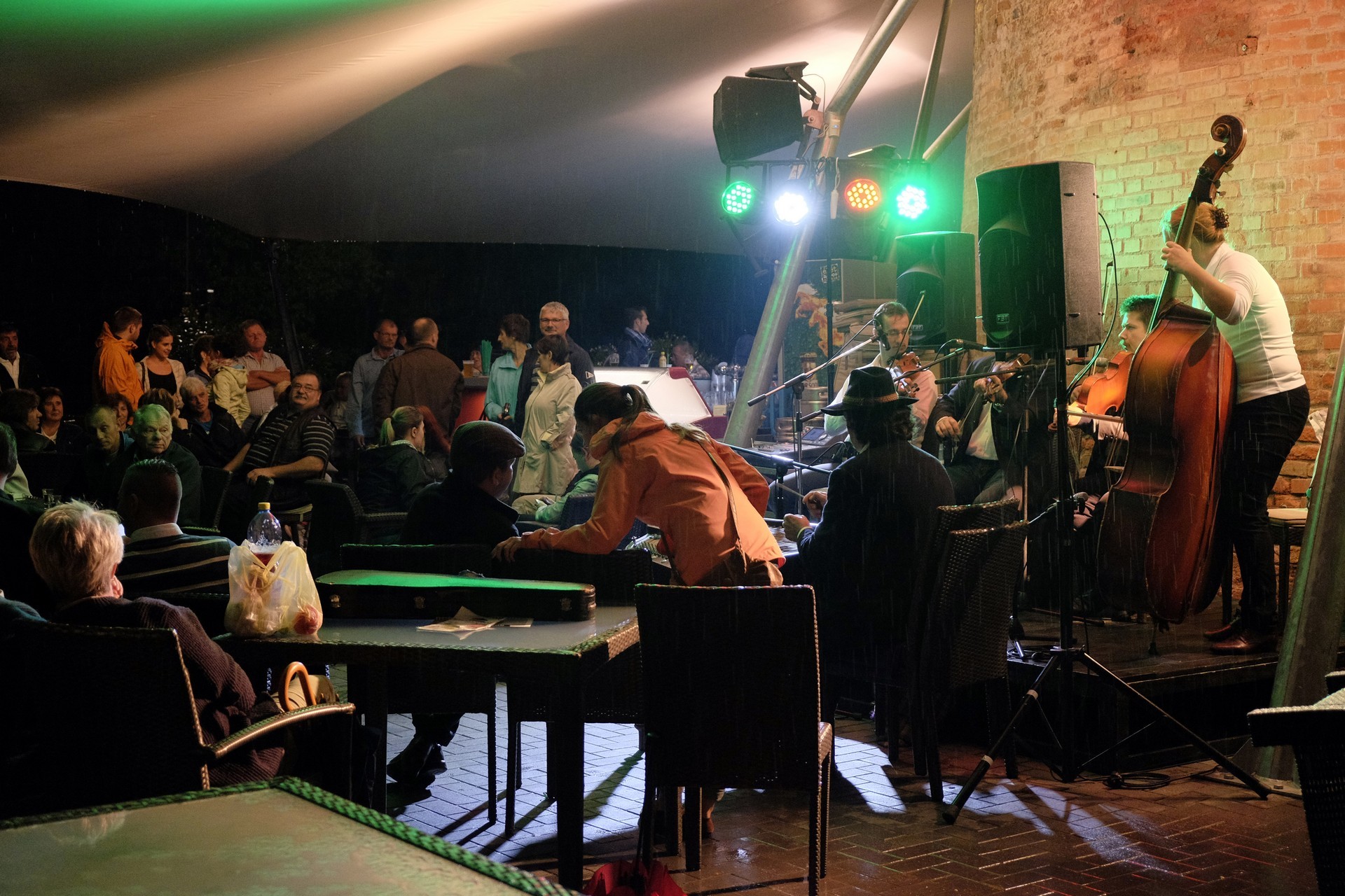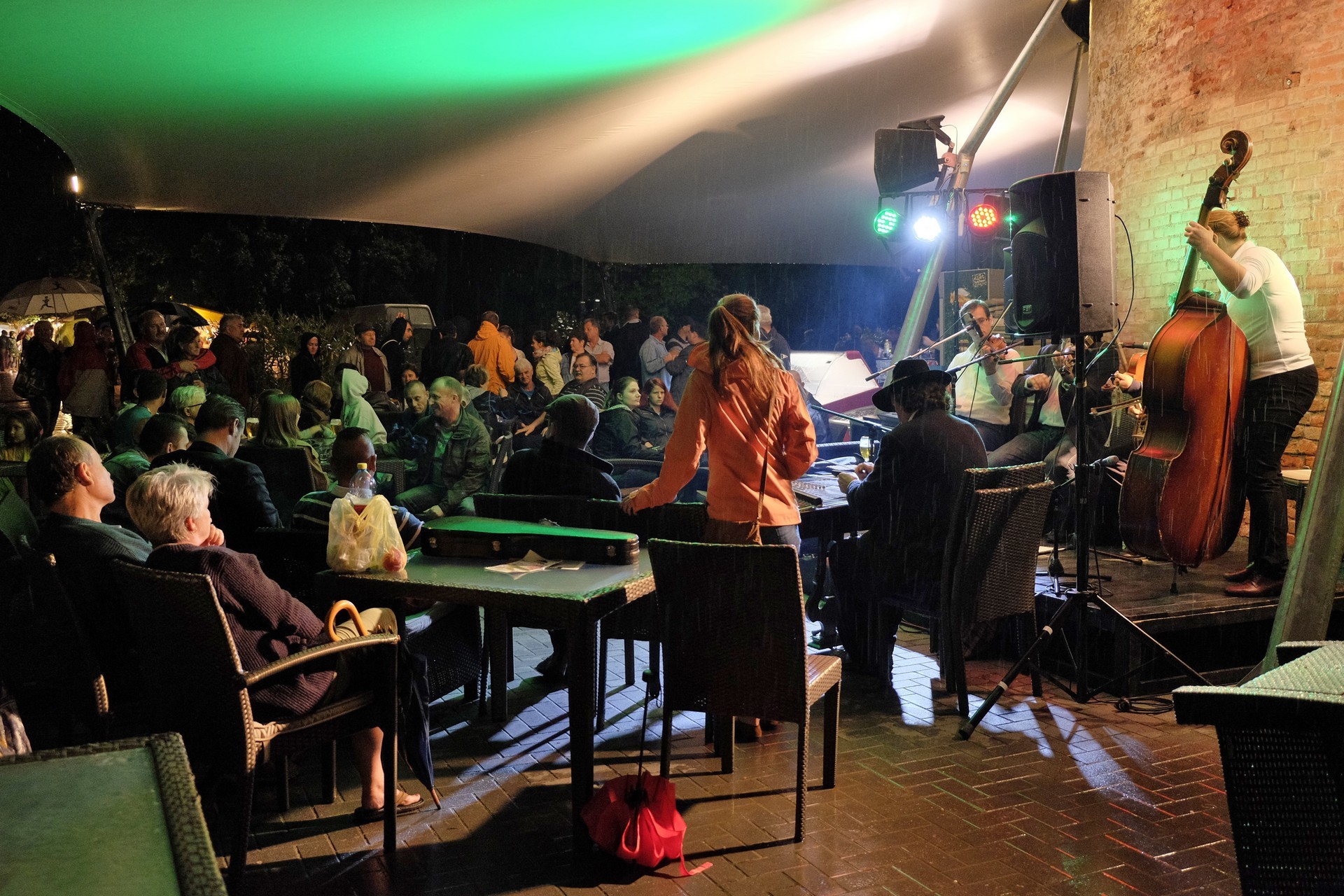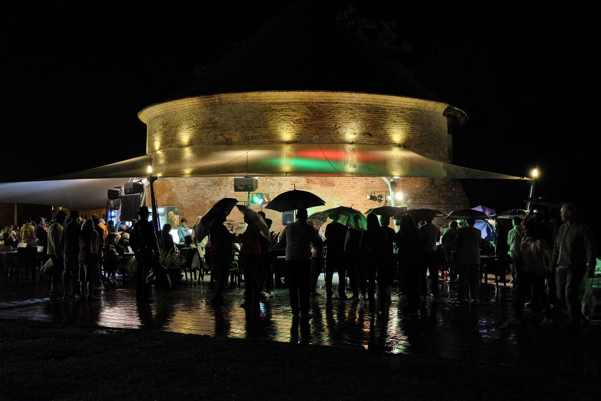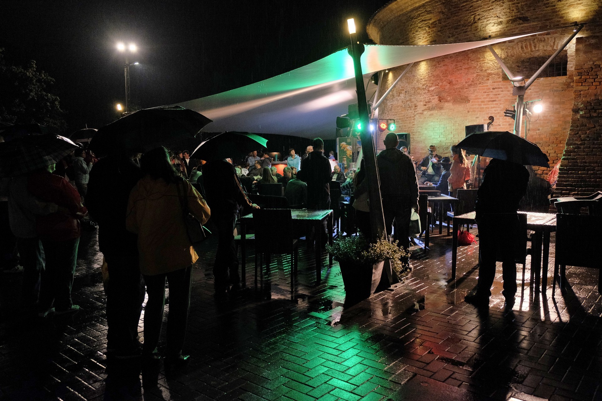 A fesztiválzenekar azonban nem hagyta, hogy népzene nélkül teljen az est, a muzsikusok a Rondella teraszon kialakított emelvényen húzták a talpalávalót a szünet nélkül. A kedvnek és az átázott cipőnek nem ártott egy kis pályinka vagy jó bor belsőleg, végül a tervezett ismerkedős táncház helyett jó hangulatú közös nótázás kerekedett, amelyben együtt danoltak a zenészek, a táncosok és közönség – amíg csak úri kedvük tartotta.