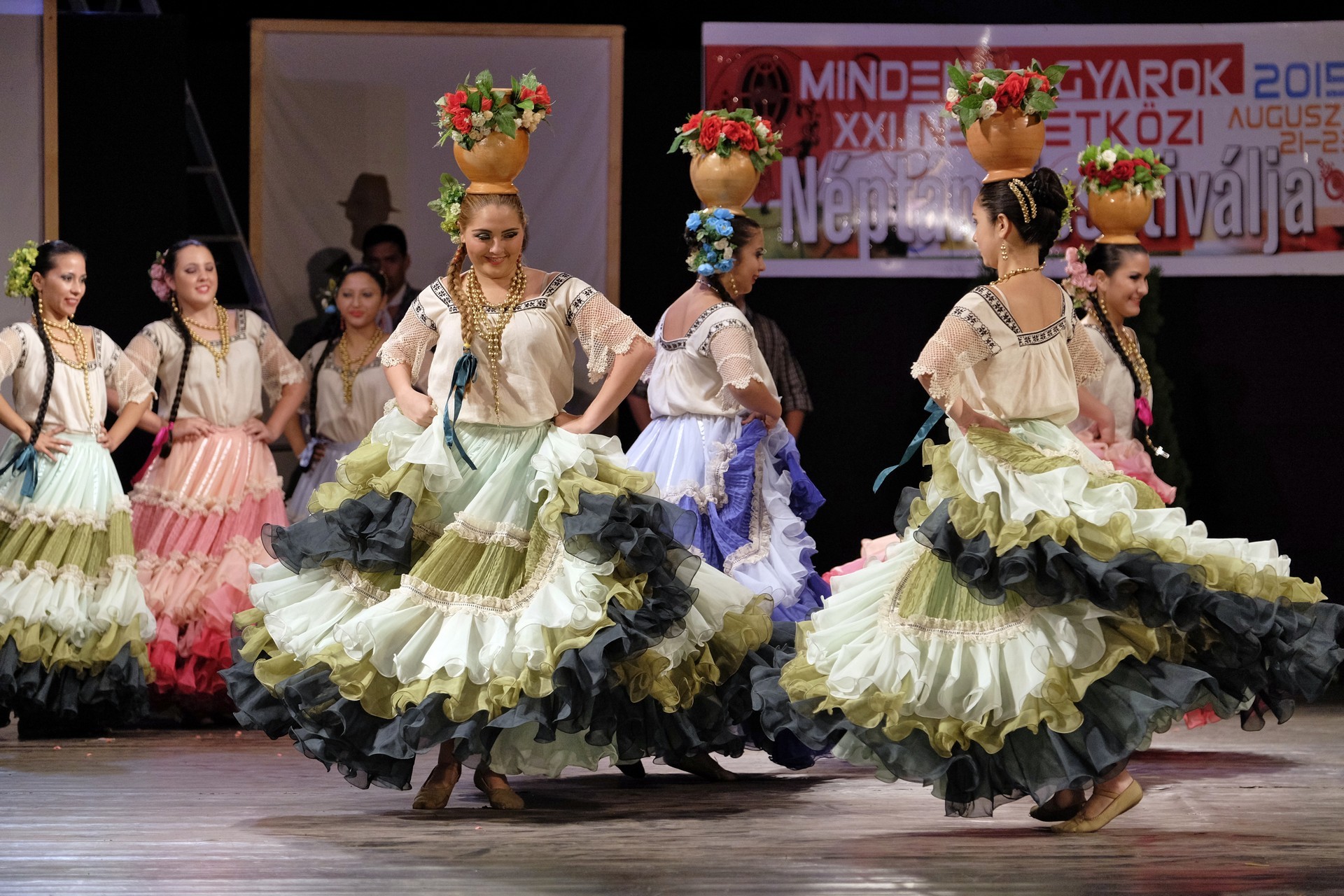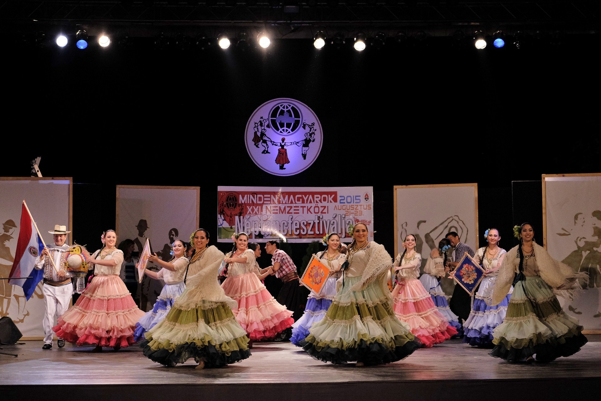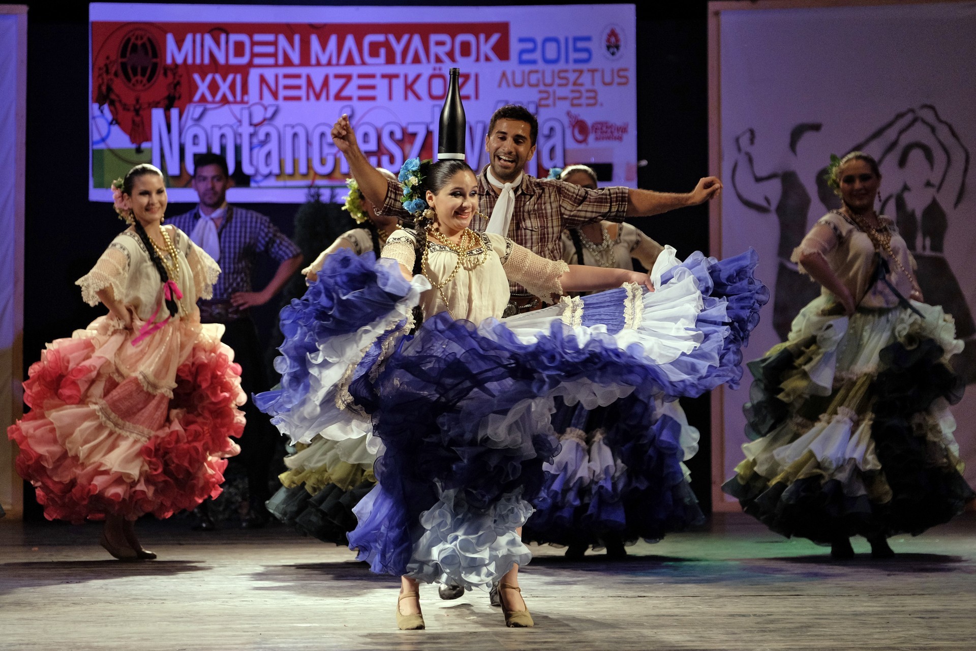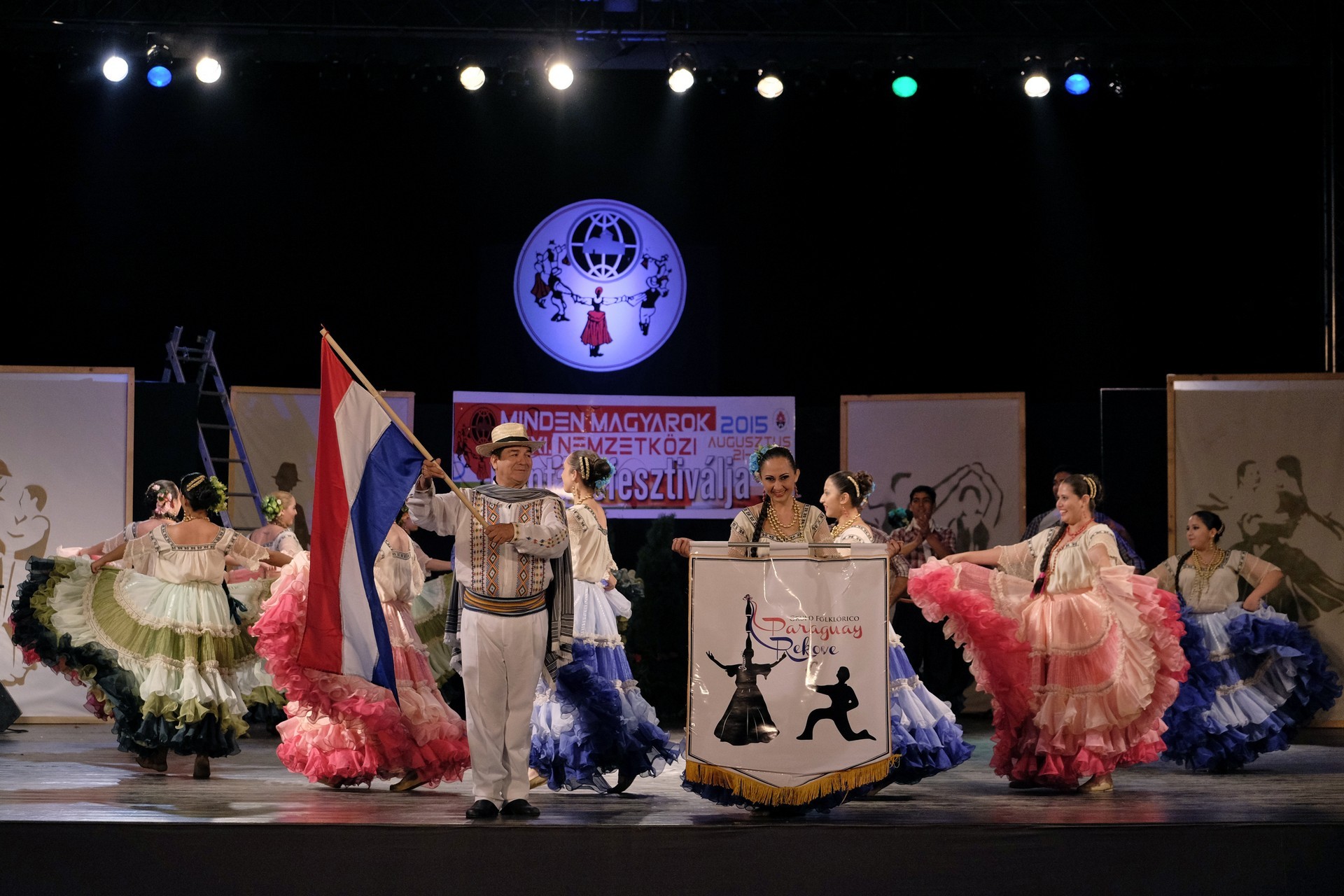 A Paraguay Rekové Folklore Group színpompás ruhájú táncosai szinte elárasztották a tószínpadot, a lányok akkor is légies könnyedséggel suhantak, amikor gyümölcsös kosárral vagy épp egy nyolc üvegből álló emelvénnyel egyensúlyoztak a fejükön.
