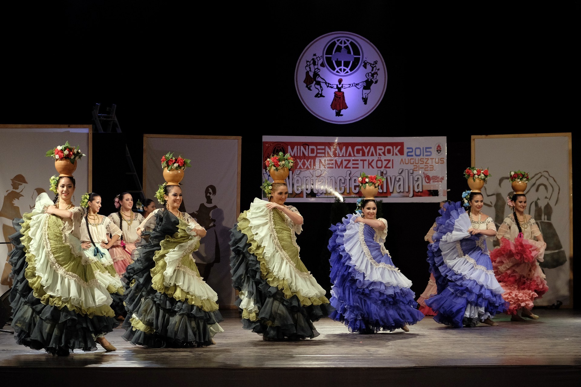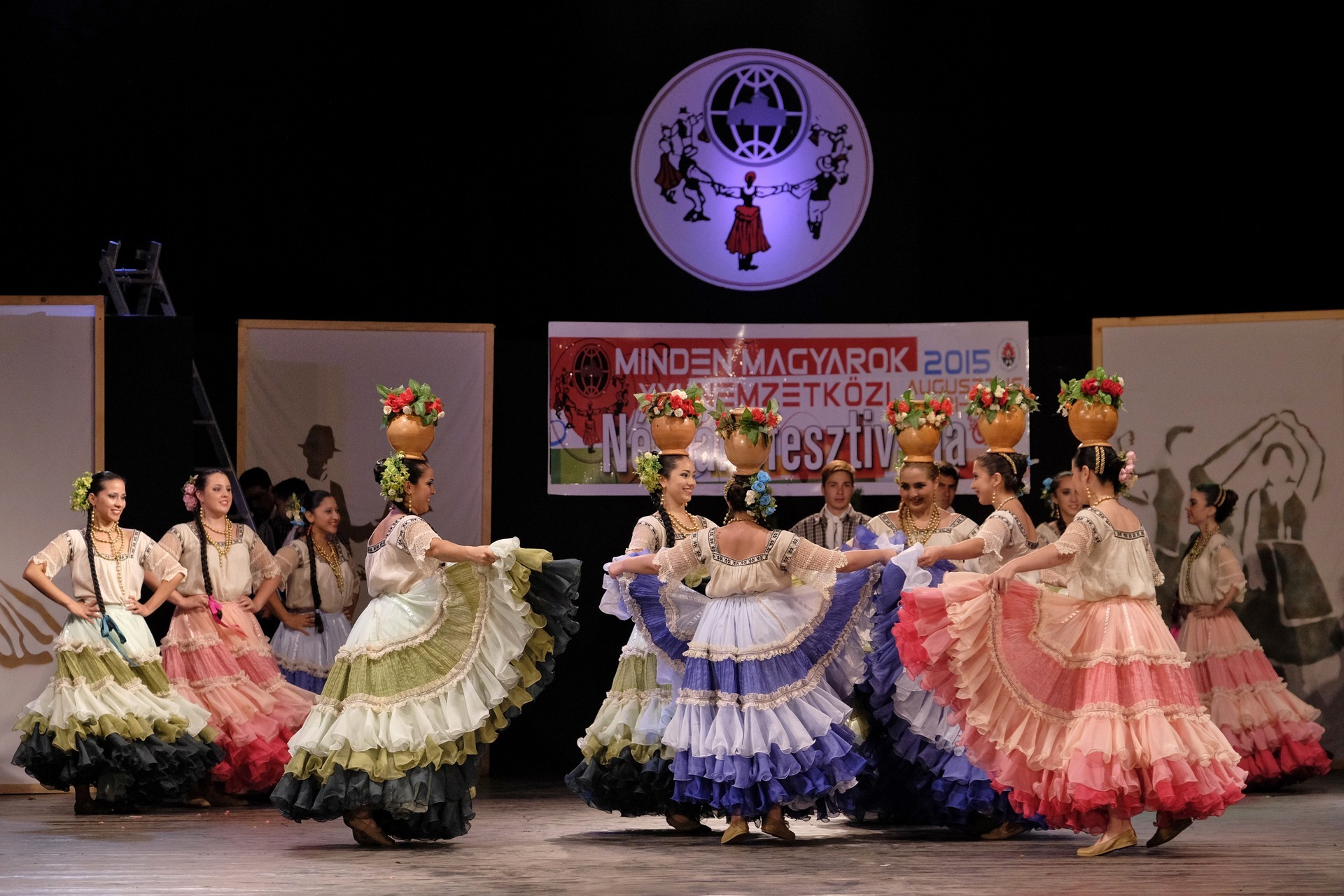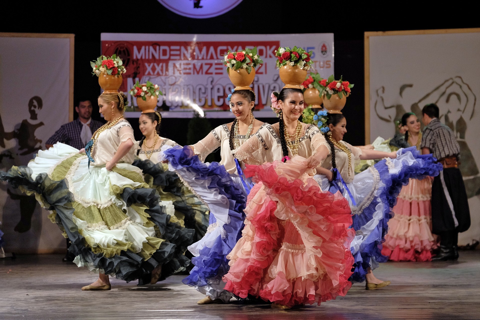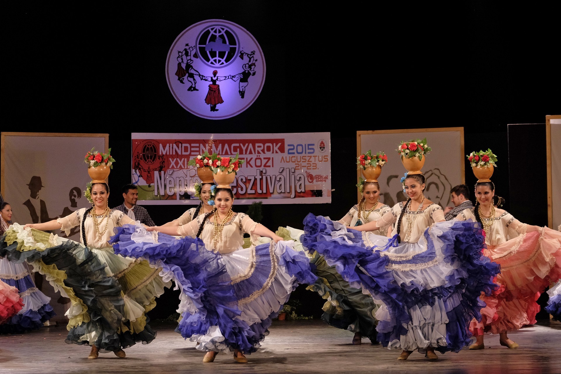 A Paraguay Rekové Folklore Group színpompás ruhájú táncosai szinte elárasztották a tószínpadot, a lányok akkor is légies könnyedséggel suhantak, amikor gyümölcsös kosárral vagy épp egy nyolc üvegből álló emelvénnyel egyensúlyoztak a fejükön.