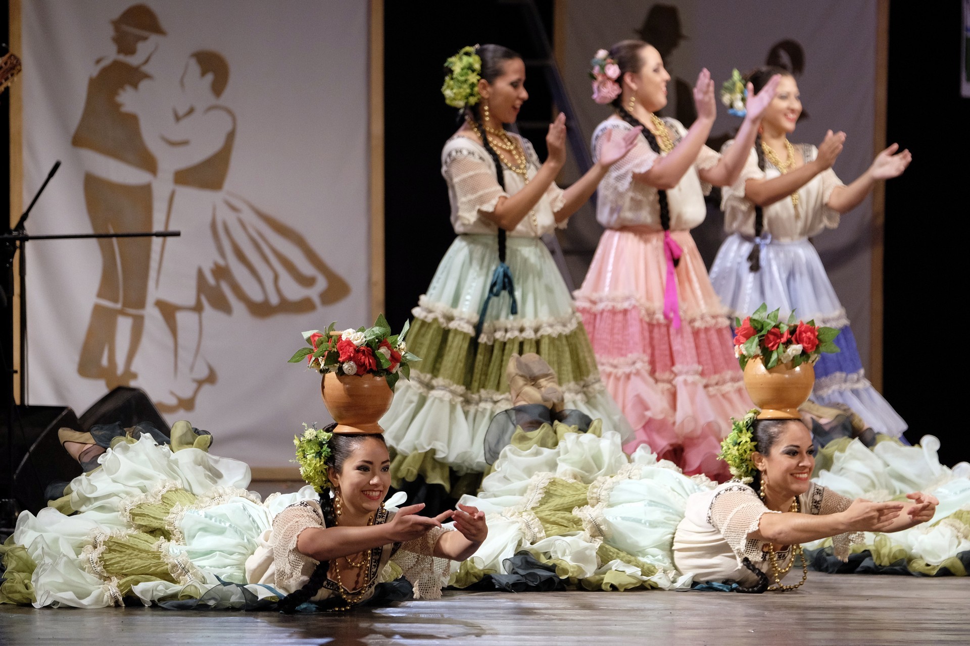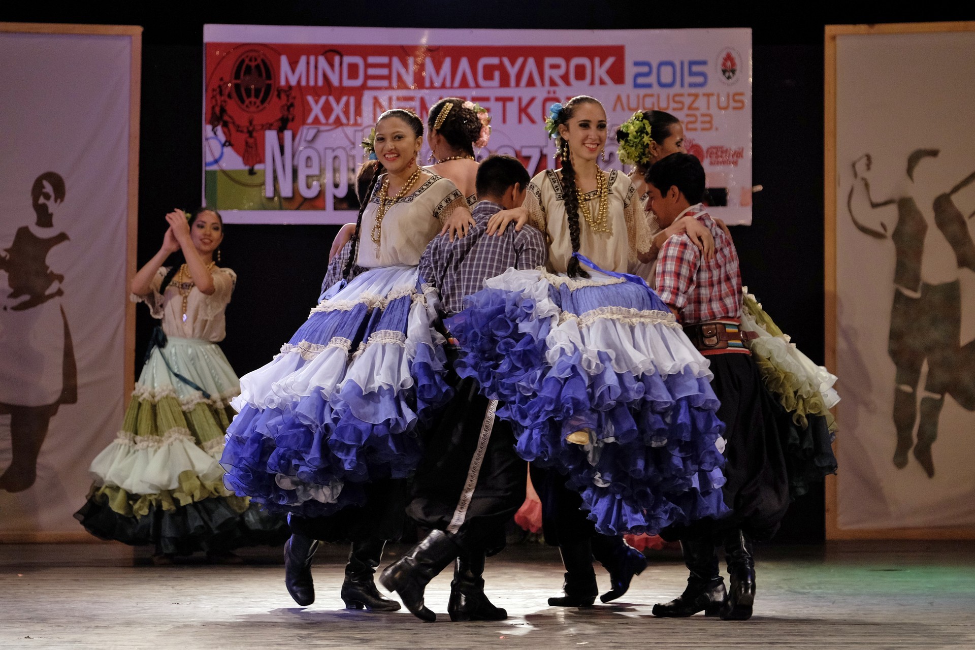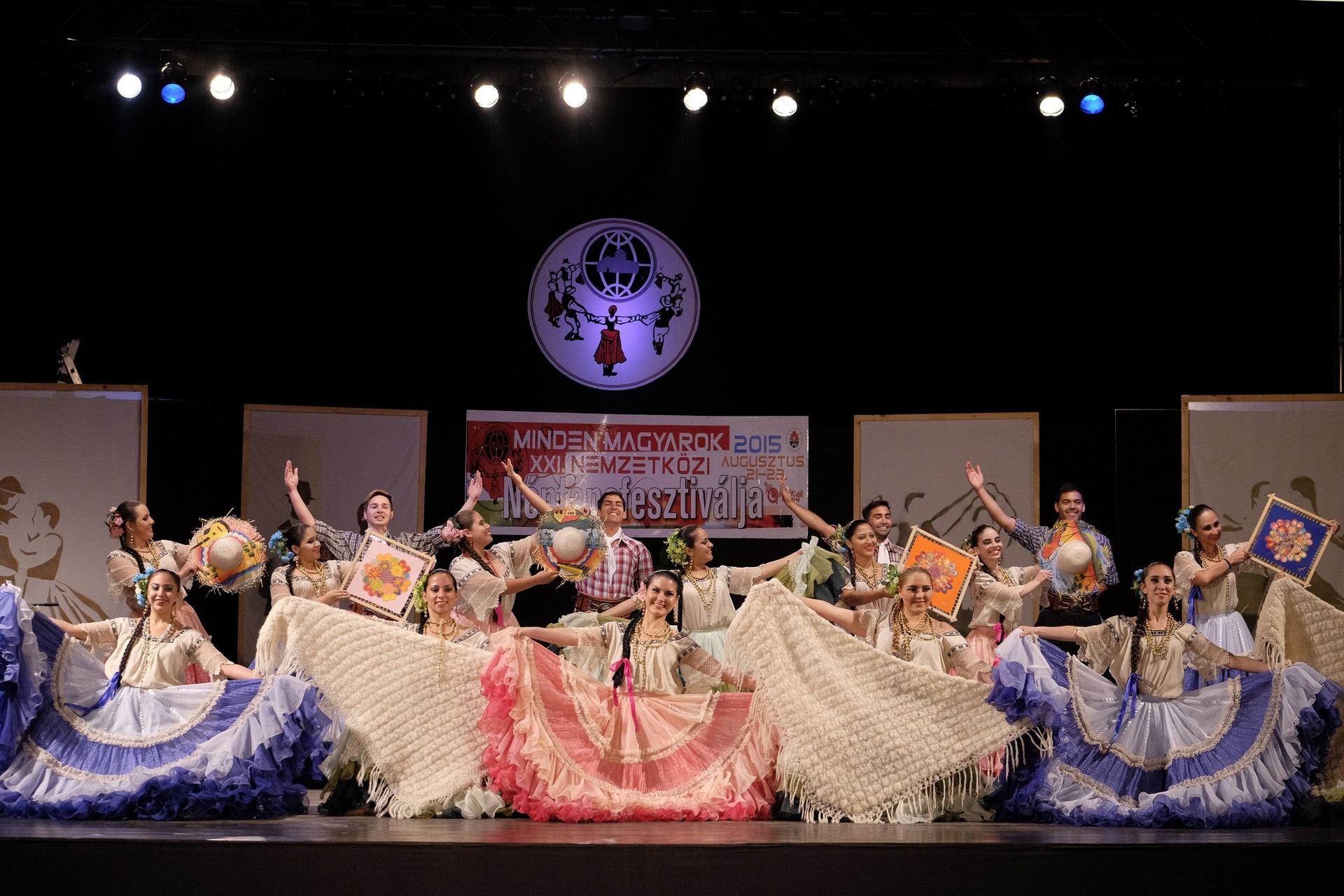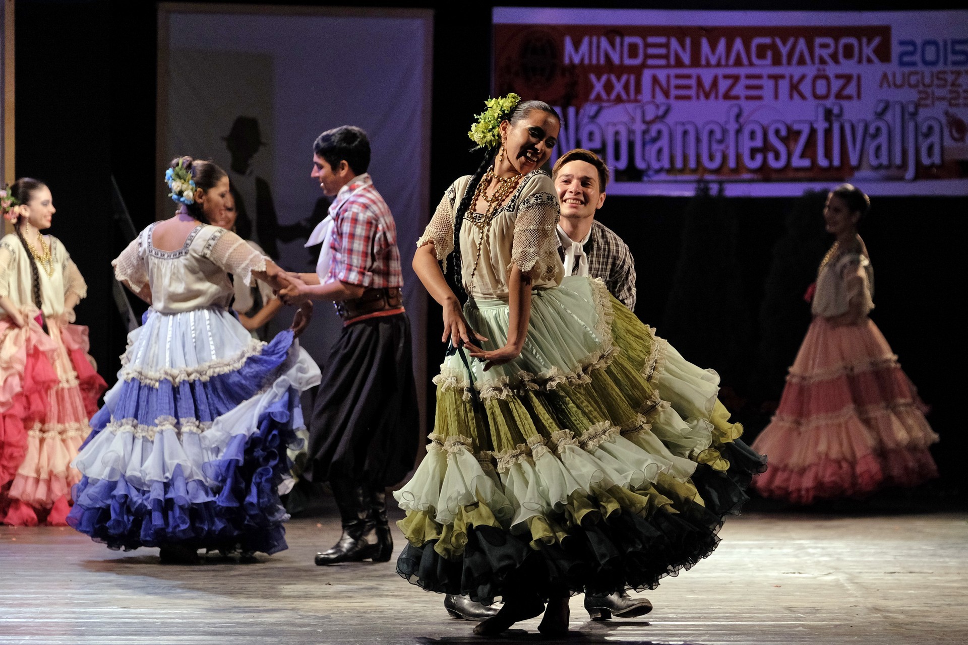 A Paraguay Rekové Folklore Group színpompás ruhájú táncosai szinte elárasztották a tószínpadot, a lányok akkor is légies könnyedséggel suhantak, amikor gyümölcsös kosárral vagy épp egy nyolc üvegből álló emelvénnyel egyensúlyoztak a fejükön.