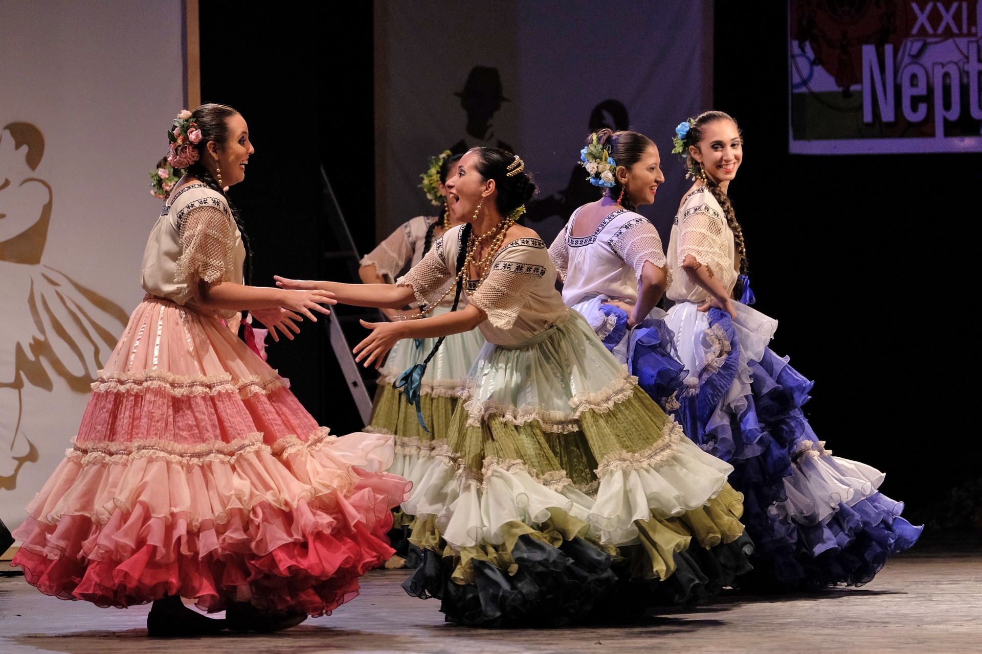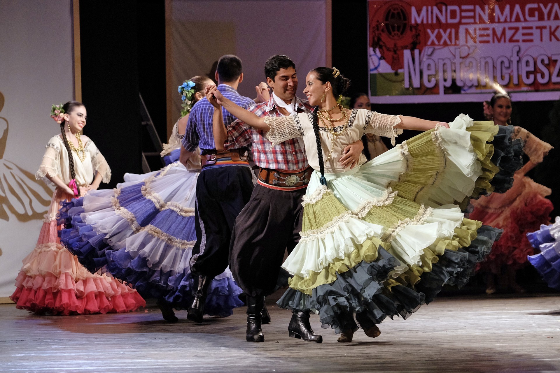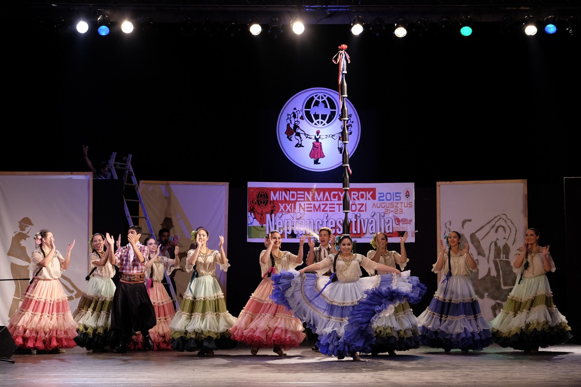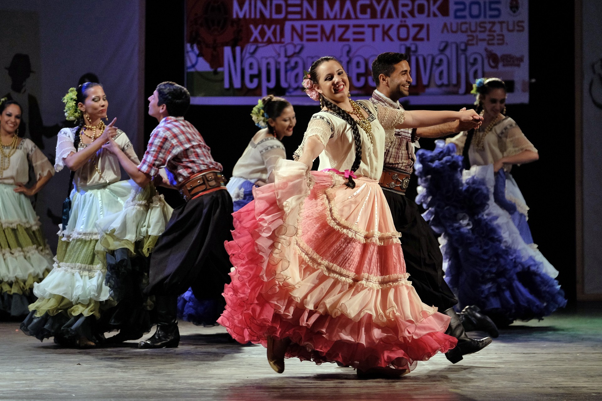 A Paraguay Rekové Folklore Group színpompás ruhájú táncosai szinte elárasztották a tószínpadot, a lányok akkor is légies könnyedséggel suhantak, amikor gyümölcsös kosárral vagy épp egy nyolc üvegből álló emelvénnyel egyensúlyoztak a fejükön.