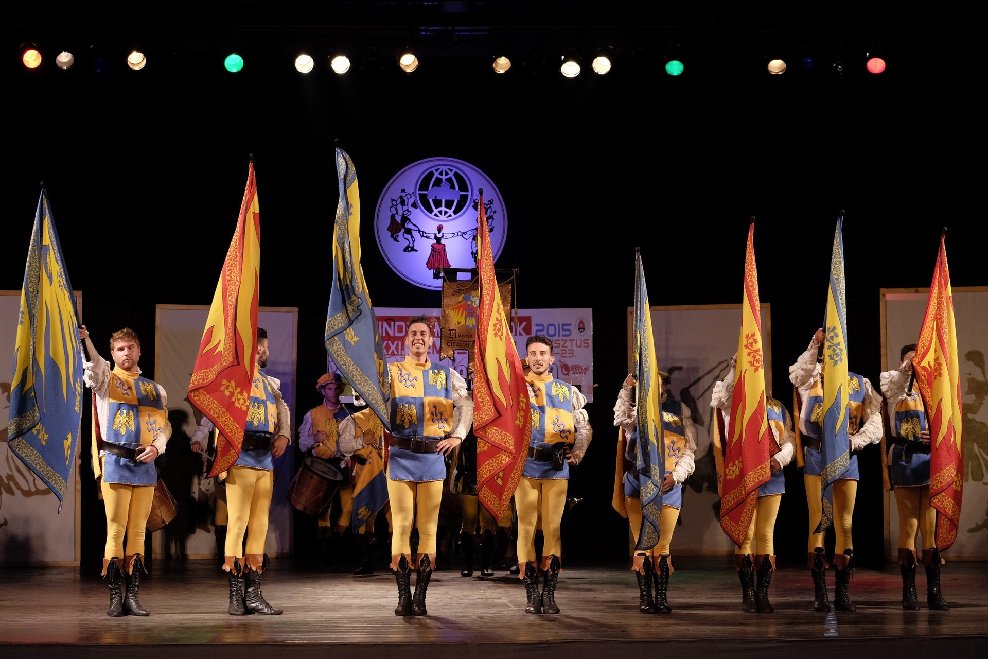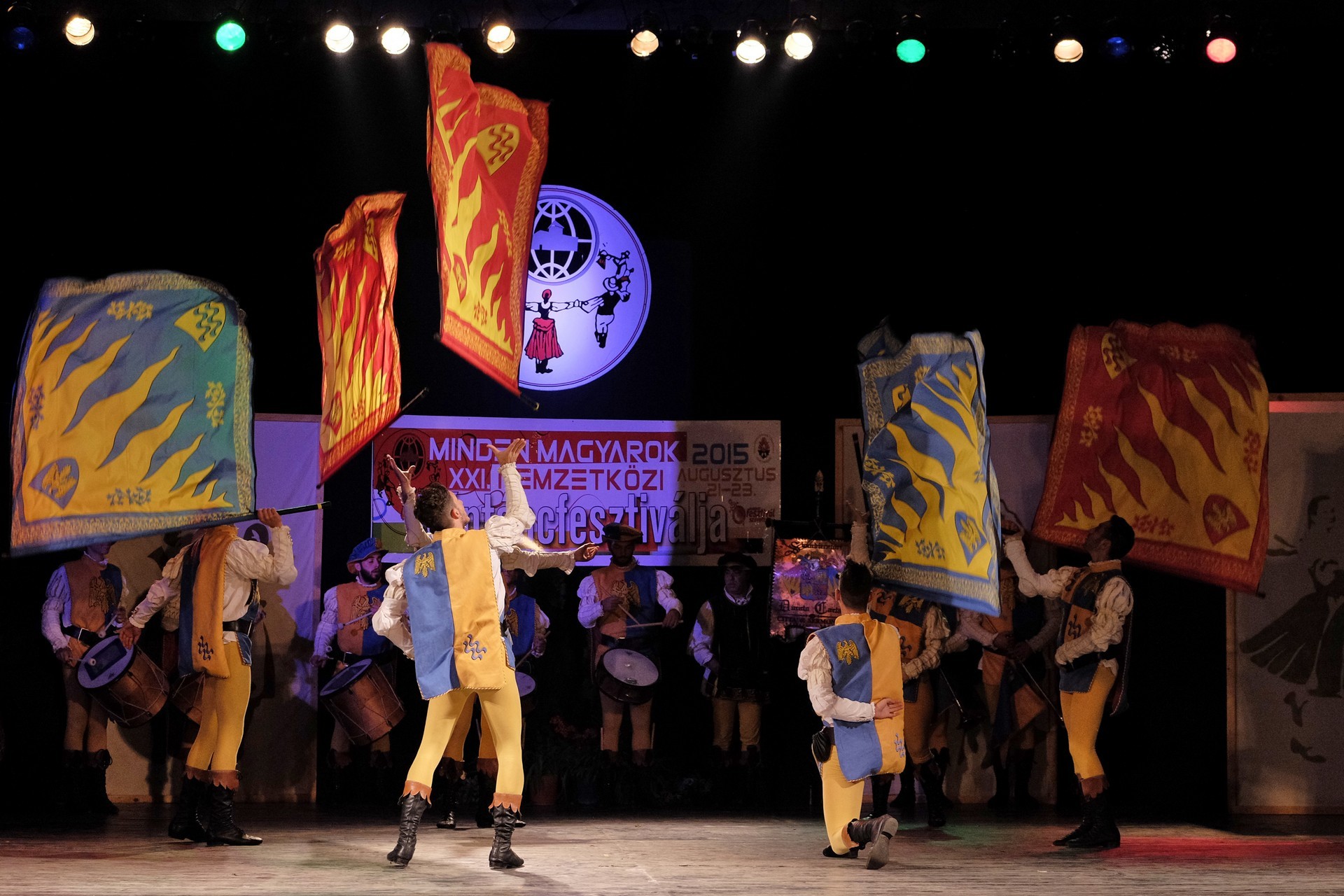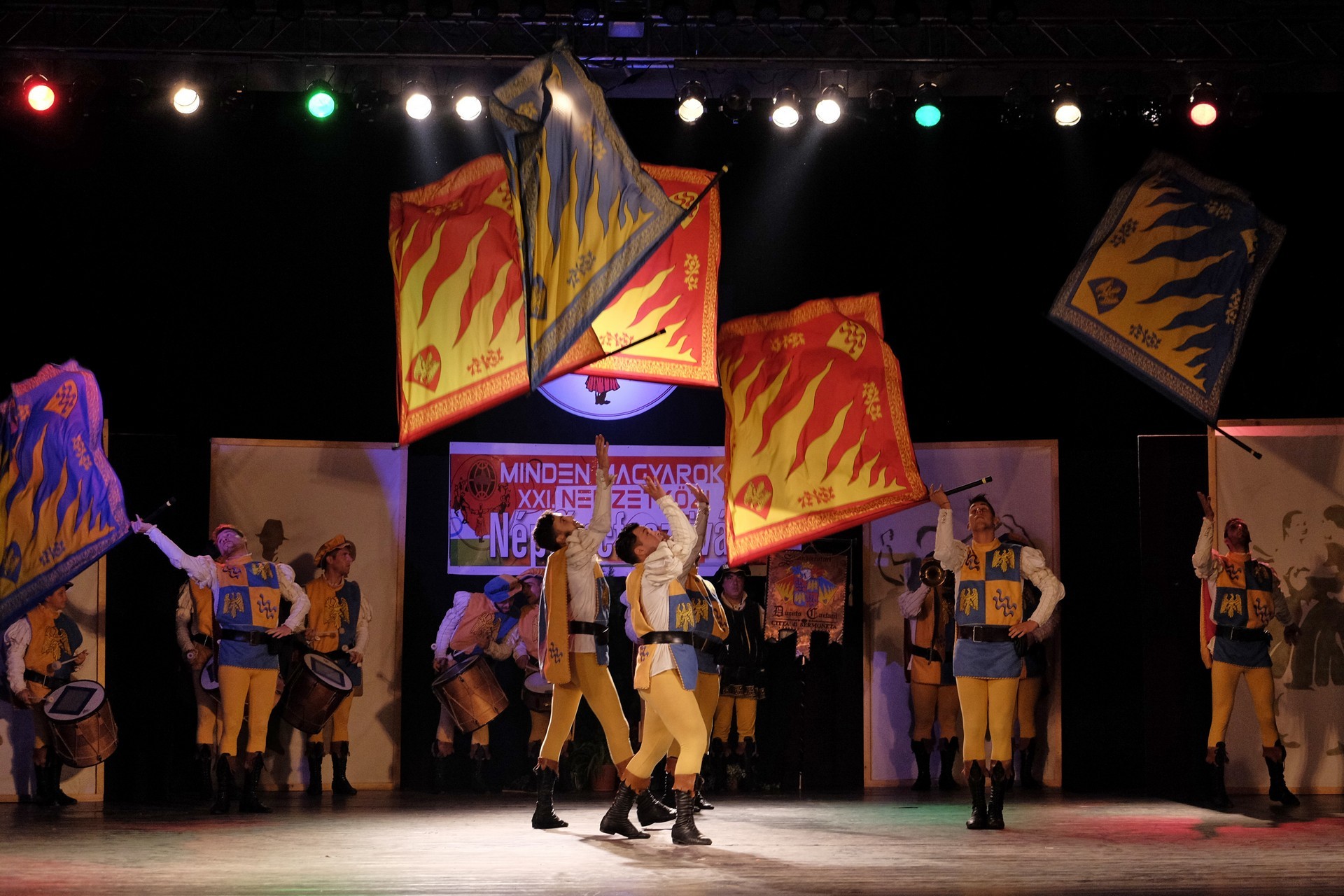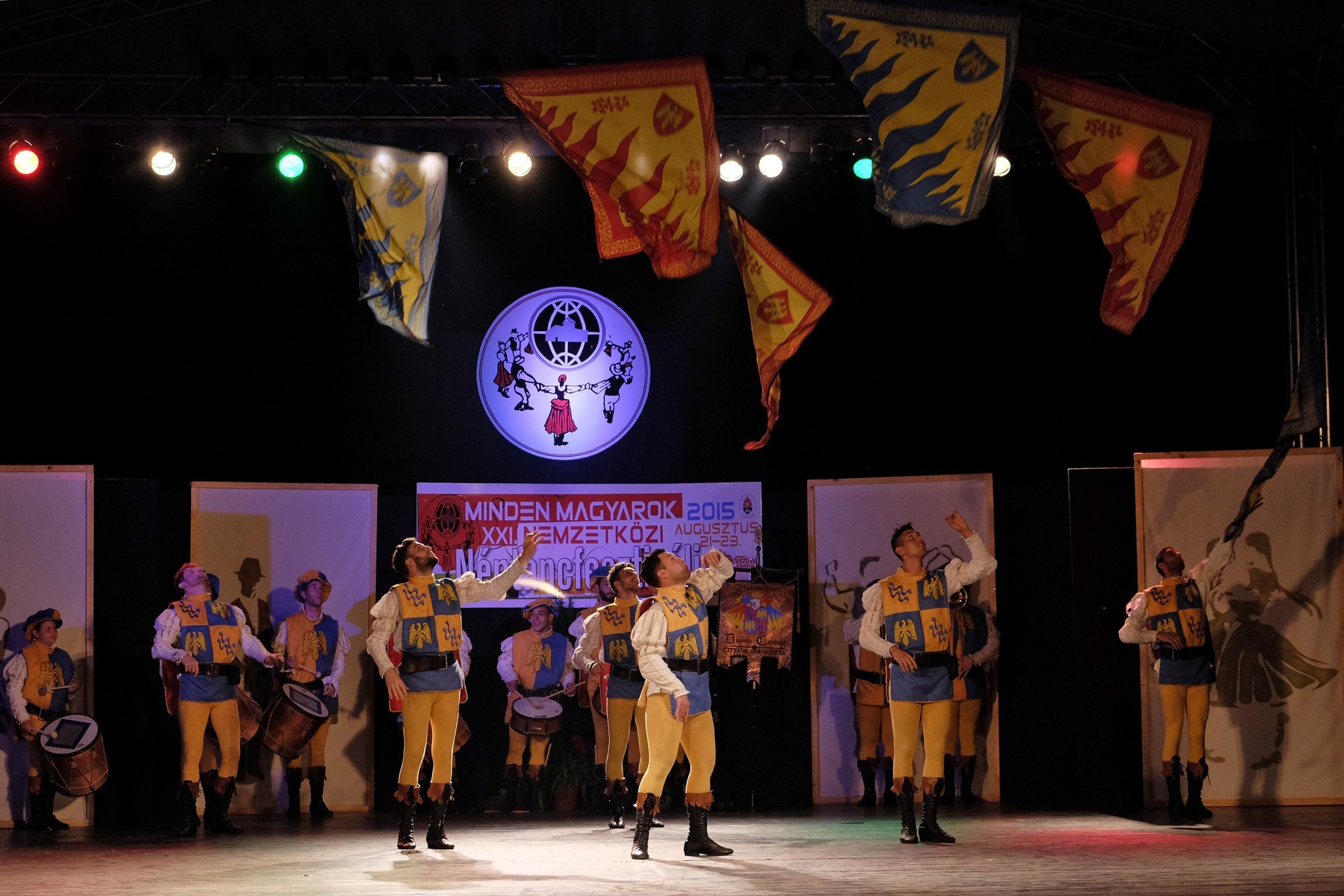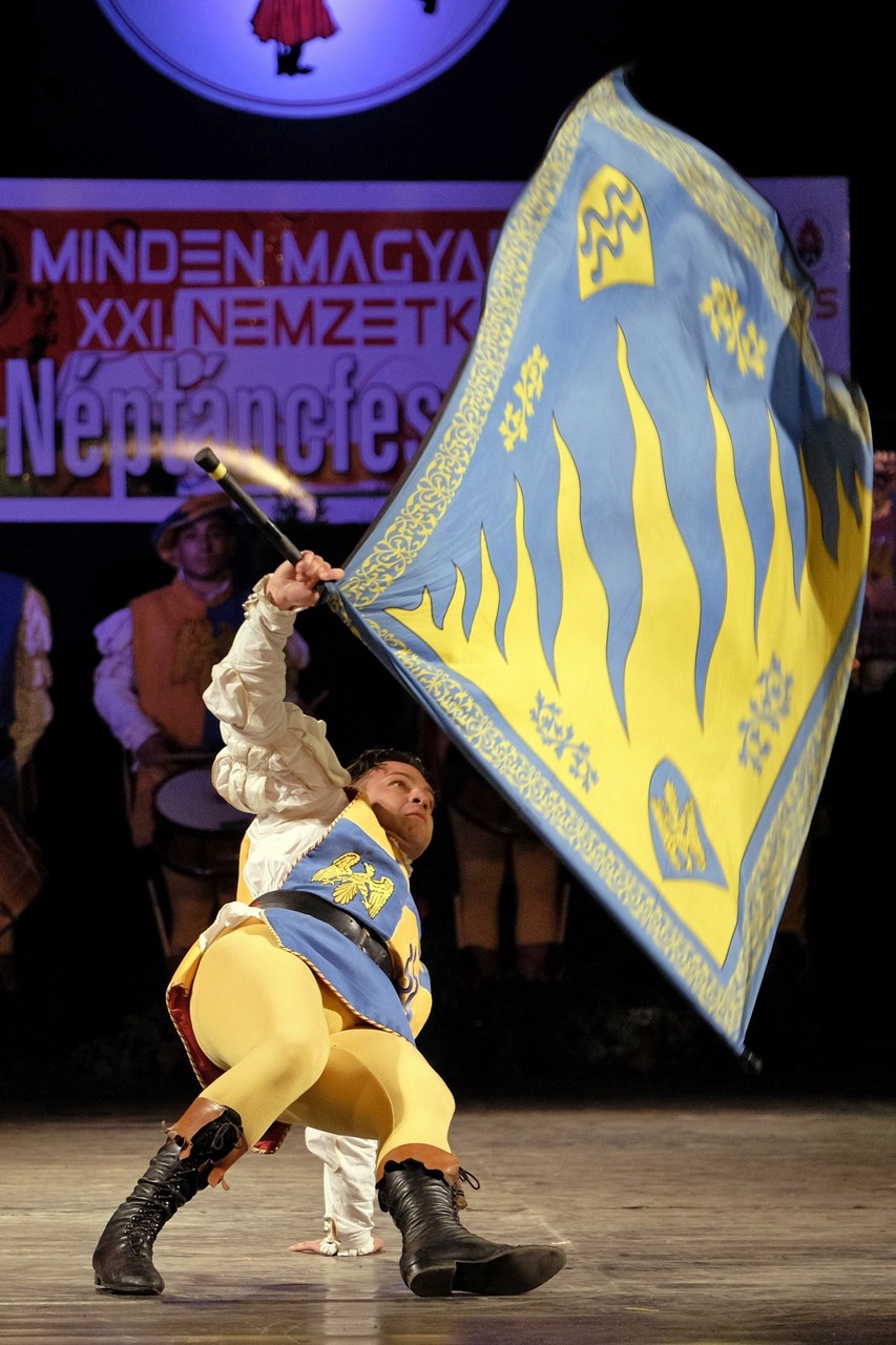 A történelmi atmoszférát sugalló dobpergés és trombitaszó alatt zászlóikat dobáló olaszországi Sbandieratori Ducato Caetani műsora pedig időutazásra vitte a háttérben a várban gyönyörködő nézőket.