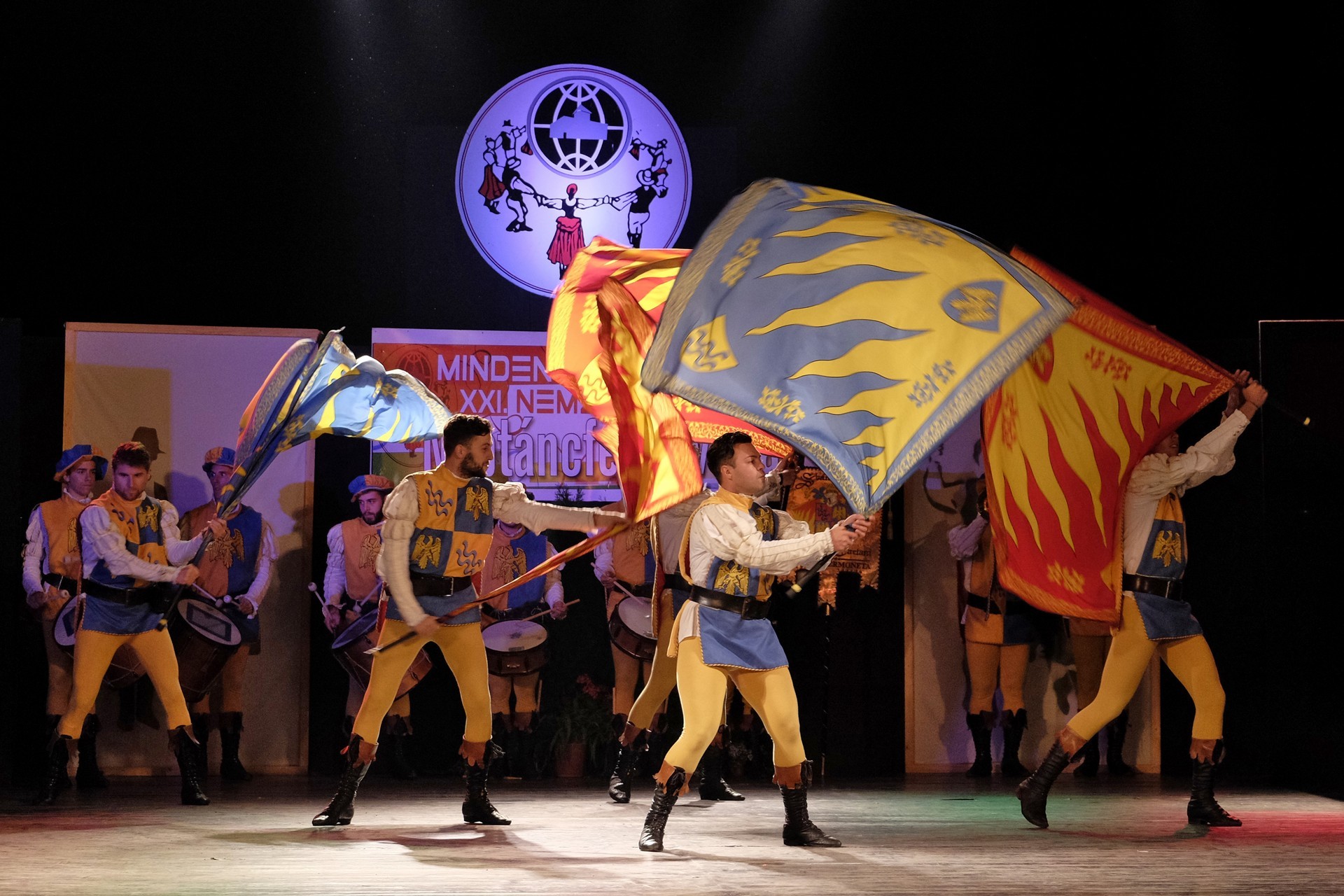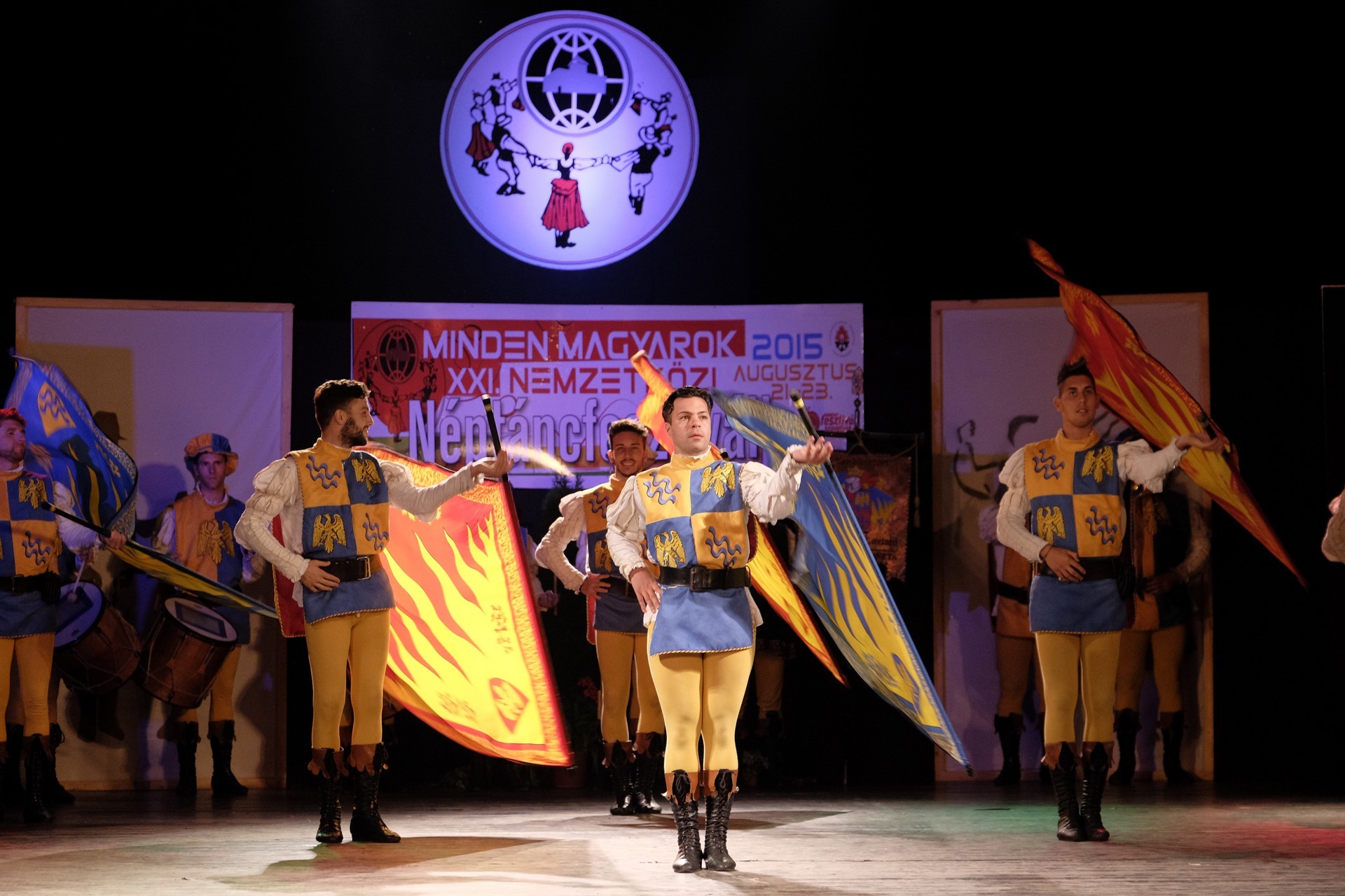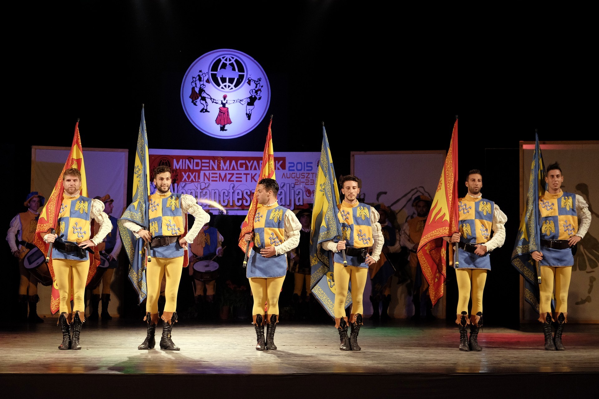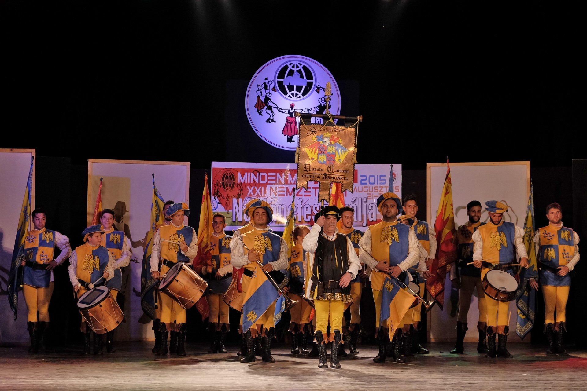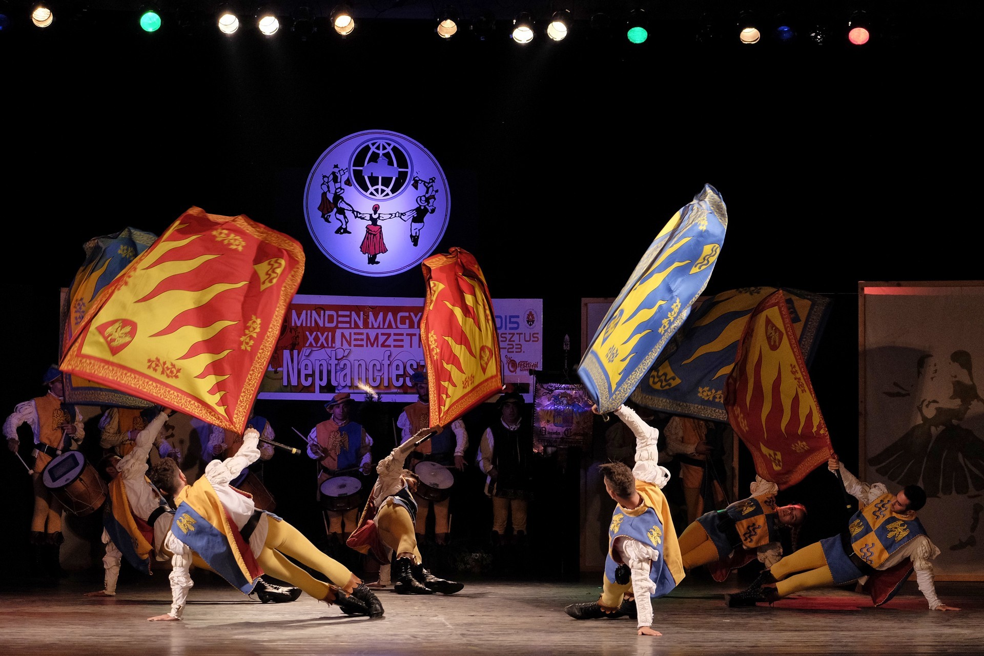 A történelmi atmoszférát sugalló dobpergés és trombitaszó alatt zászlóikat dobáló olaszországi Sbandieratori Ducato Caetani műsora pedig időutazásra vitte a háttérben a várban gyönyörködő nézőket.