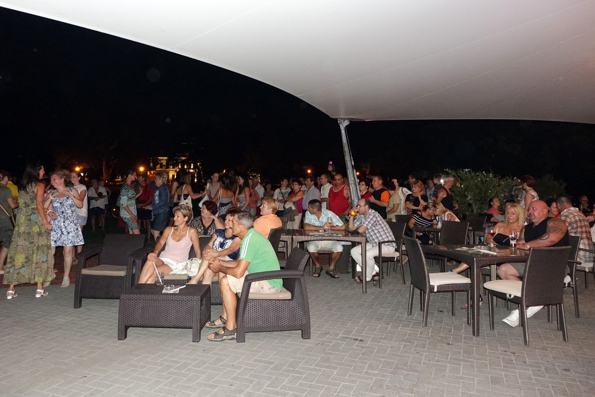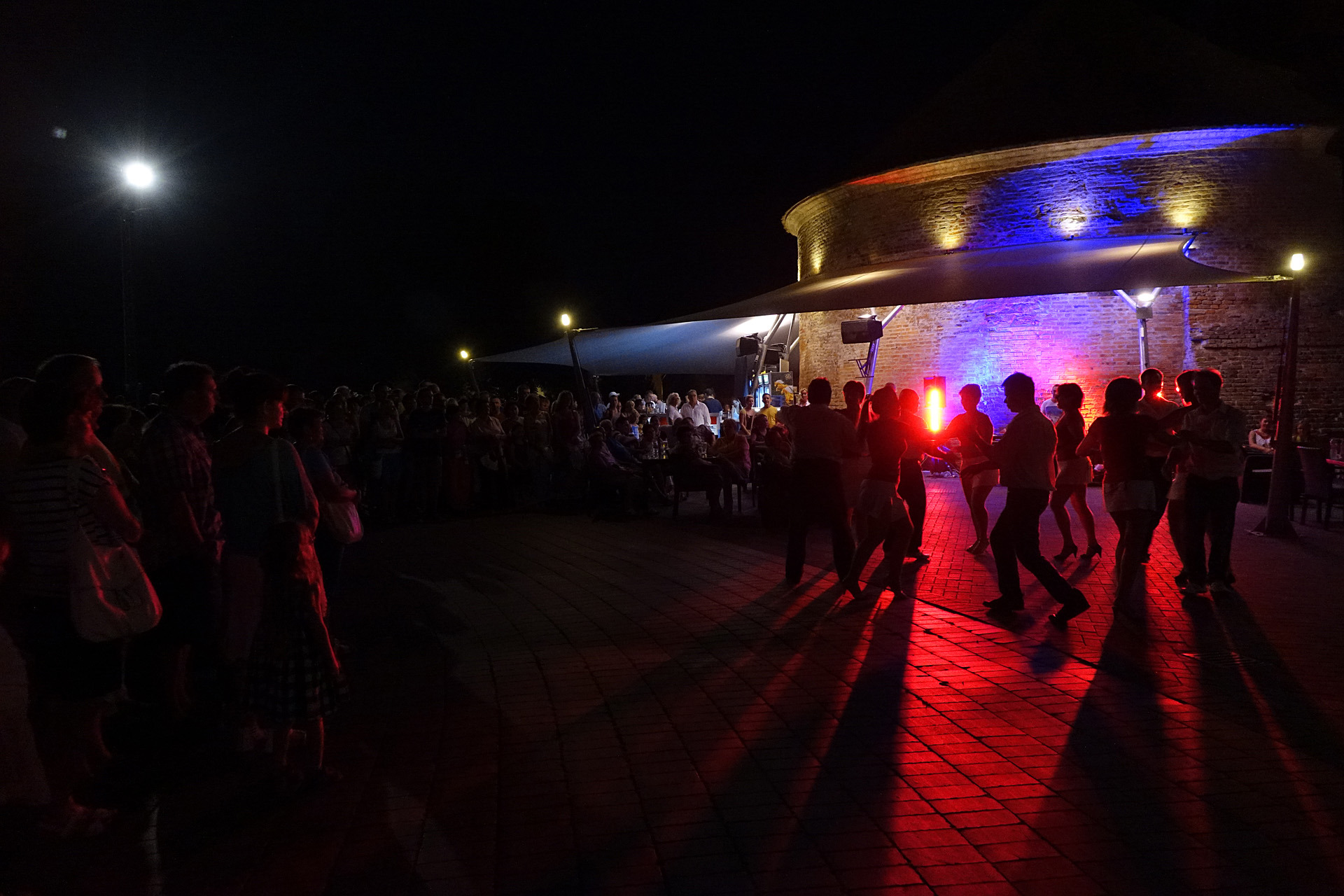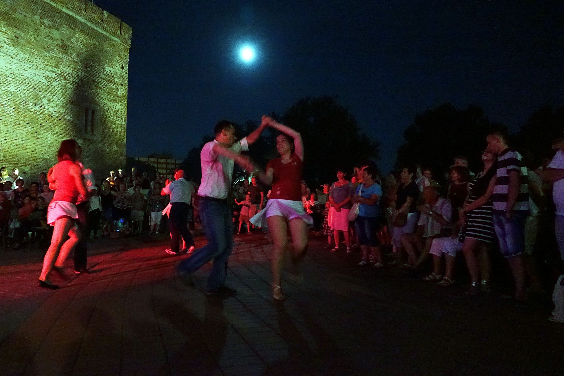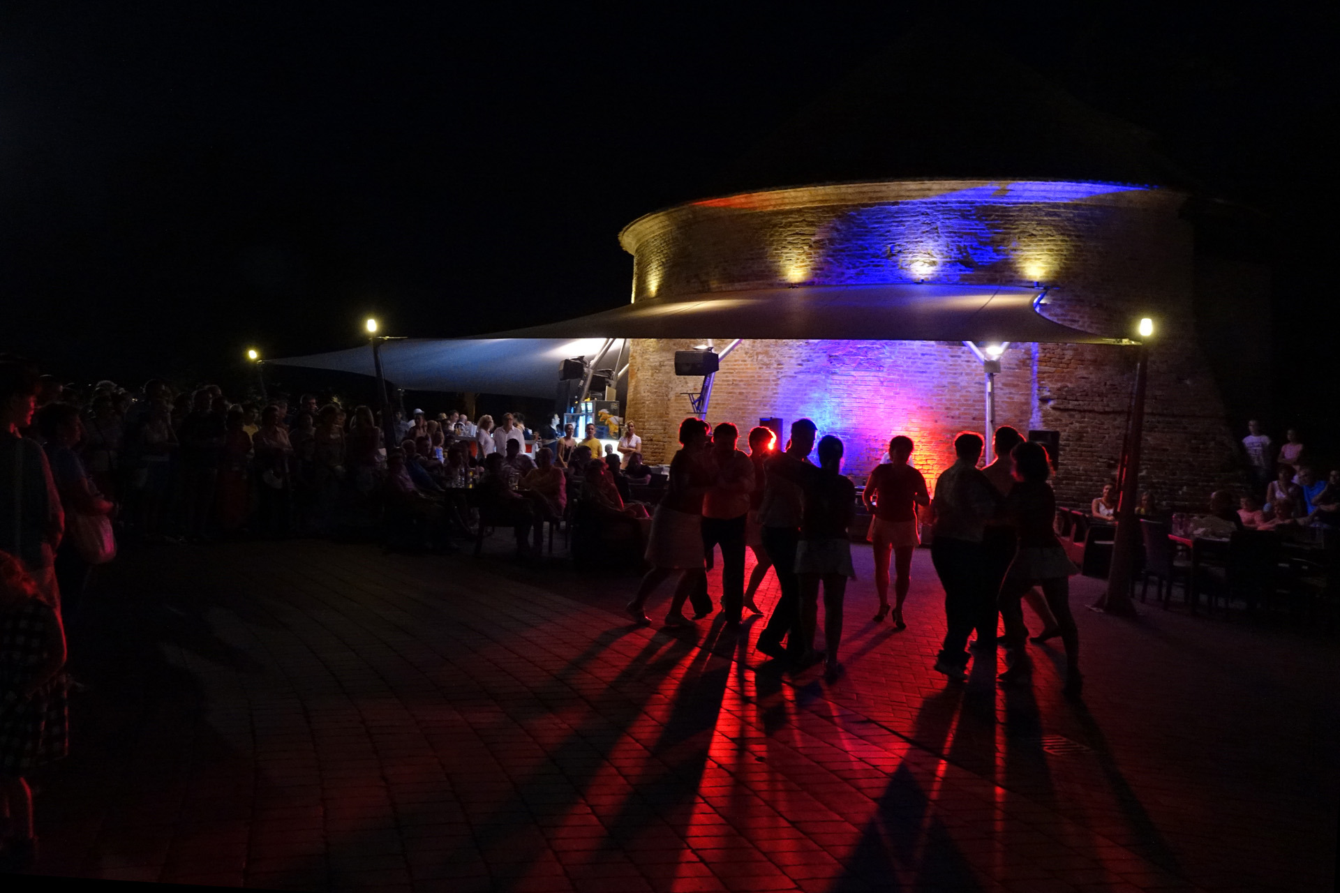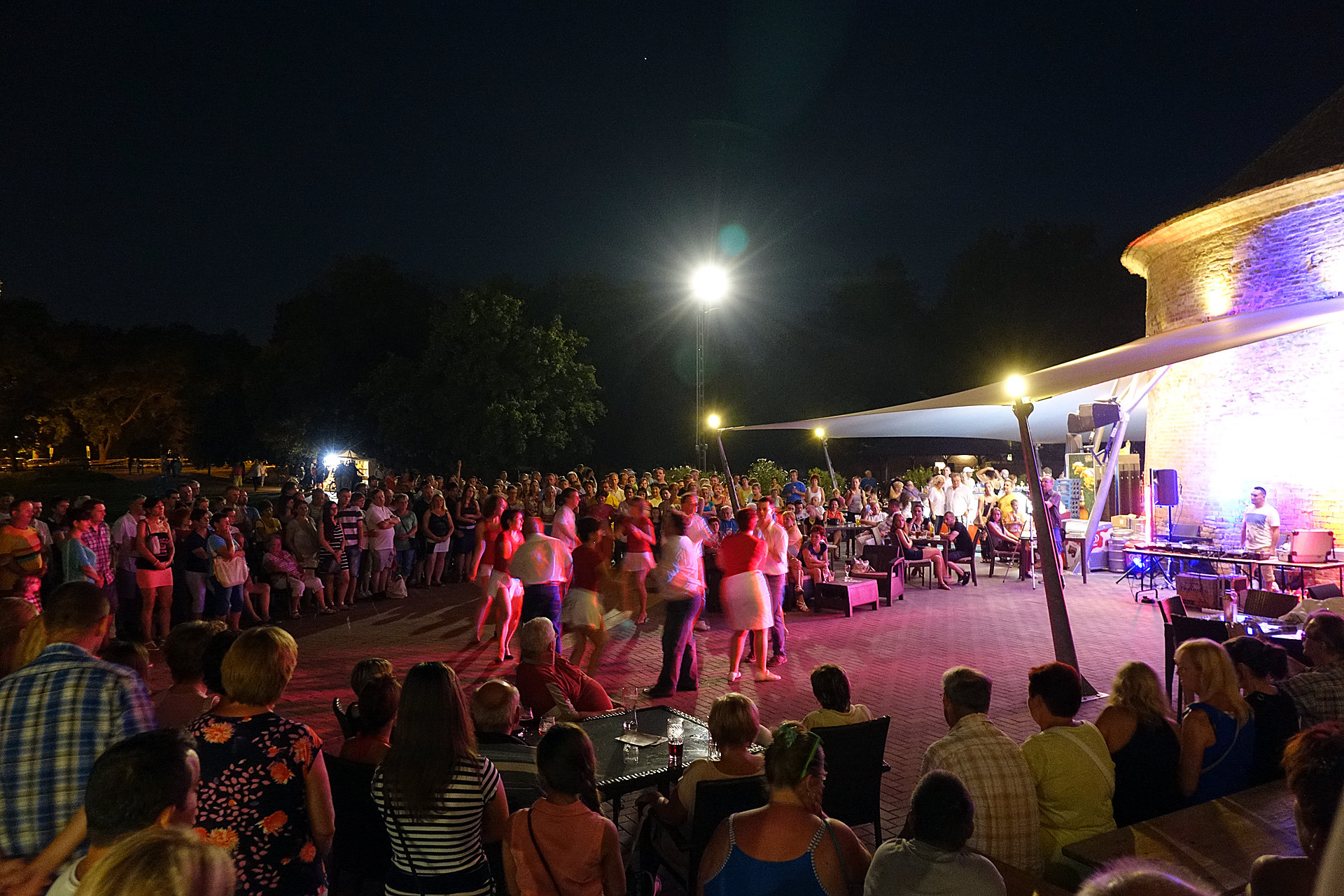 Már a kezdés előtti percekben fokozatosan gyarapodott az érdeklődőkből összegyűlt embercsoport a vár térfelőli oldalánál, hogy nézzék, vagy hogy épp maguk is bekapcsolódjanak a táncforgatagba. Ez utóbbihoz a Dolce Dance Nemzetközi Tánciskola növendékei adtak bátorítást, akik látványos bemutatójukkal olyan hangulatot teremtetettek, hogy még azok is közéjük penderültek, akik eredetileg beszélgetéssel, ácsorgással vagy épp kerékpárjuk oldalirányú támasztásának kitartó gyakorlásával tervezték eltölteni az estét a Rondellánál.