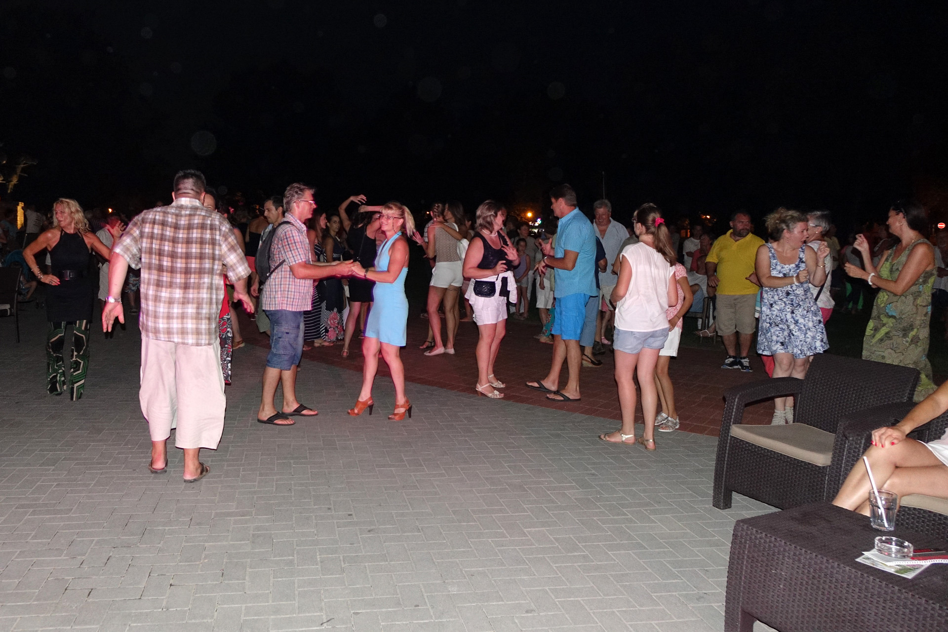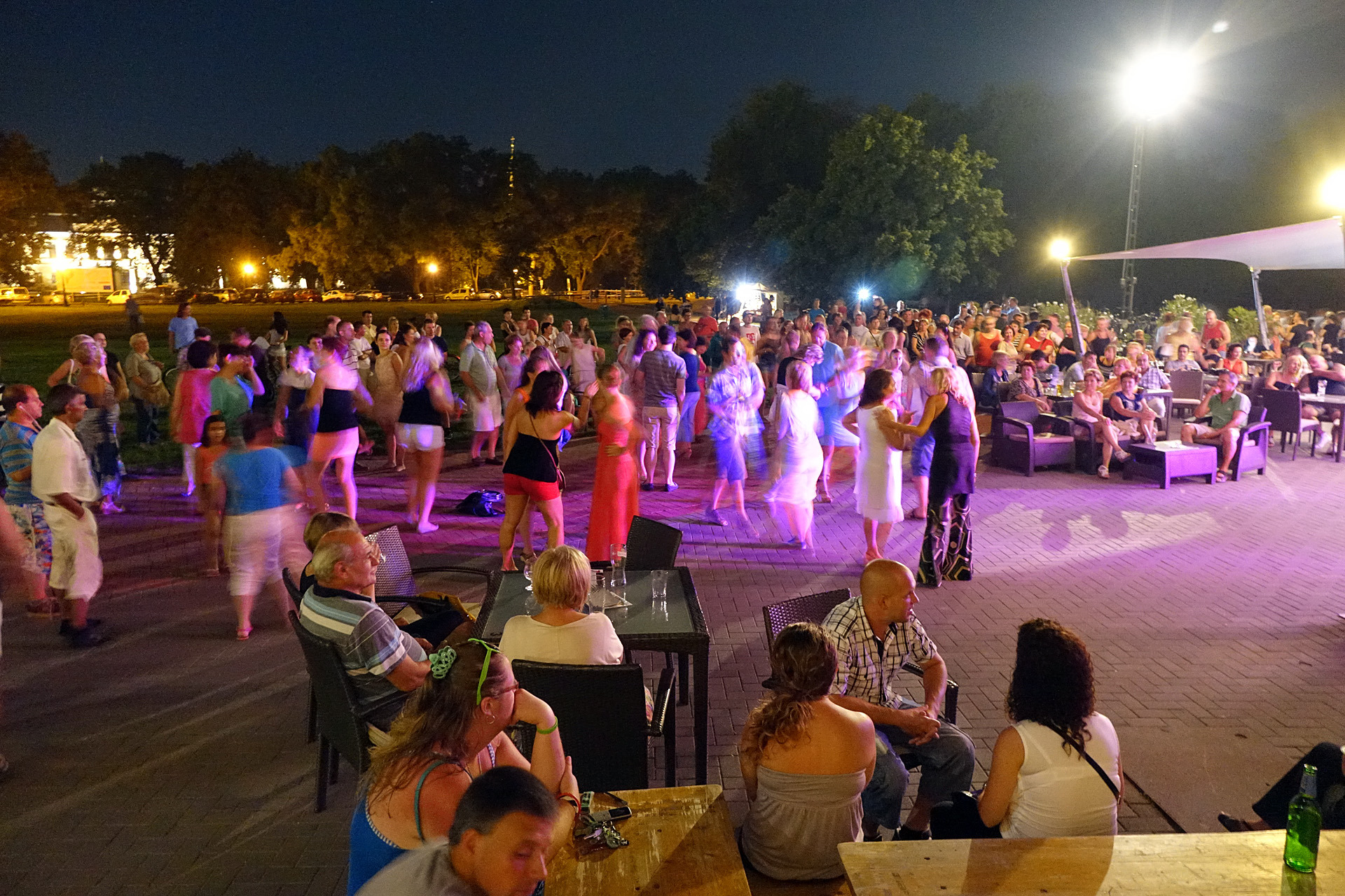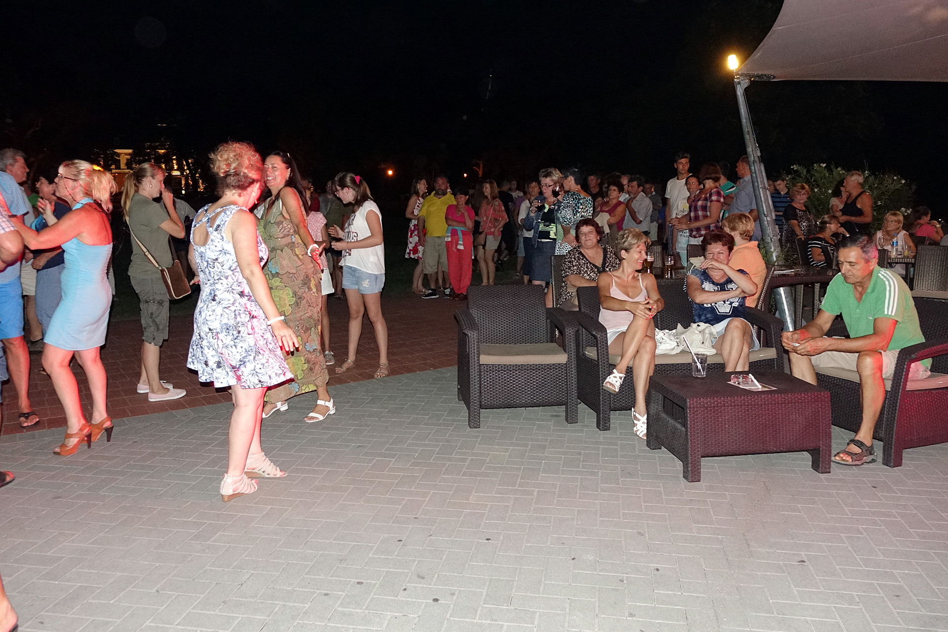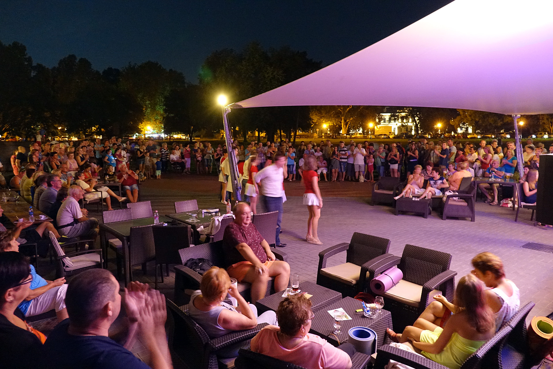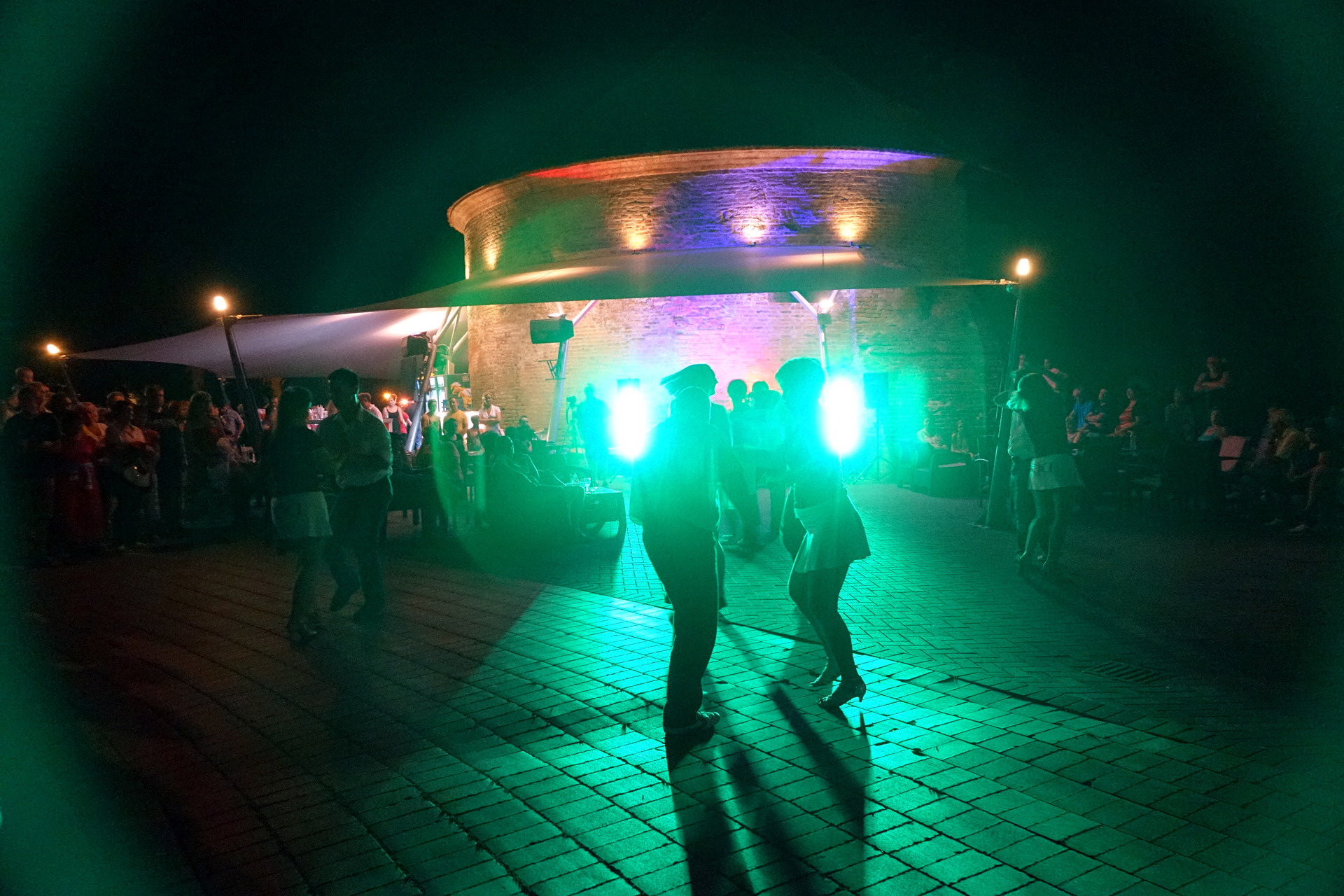 Már a kezdés előtti percekben fokozatosan gyarapodott az érdeklődőkből összegyűlt embercsoport a vár térfelőli oldalánál, hogy nézzék, vagy hogy épp maguk is bekapcsolódjanak a táncforgatagba. Ez utóbbihoz a Dolce Dance Nemzetközi Tánciskola növendékei adtak bátorítást, akik látványos bemutatójukkal olyan hangulatot teremtetettek, hogy még azok is közéjük penderültek, akik eredetileg beszélgetéssel, ácsorgással vagy épp kerékpárjuk oldalirányú támasztásának kitartó gyakorlásával tervezték eltölteni az estét a Rondellánál.