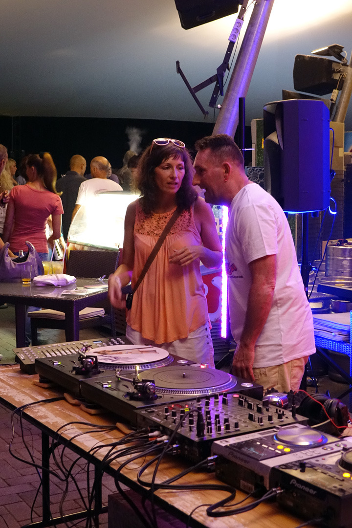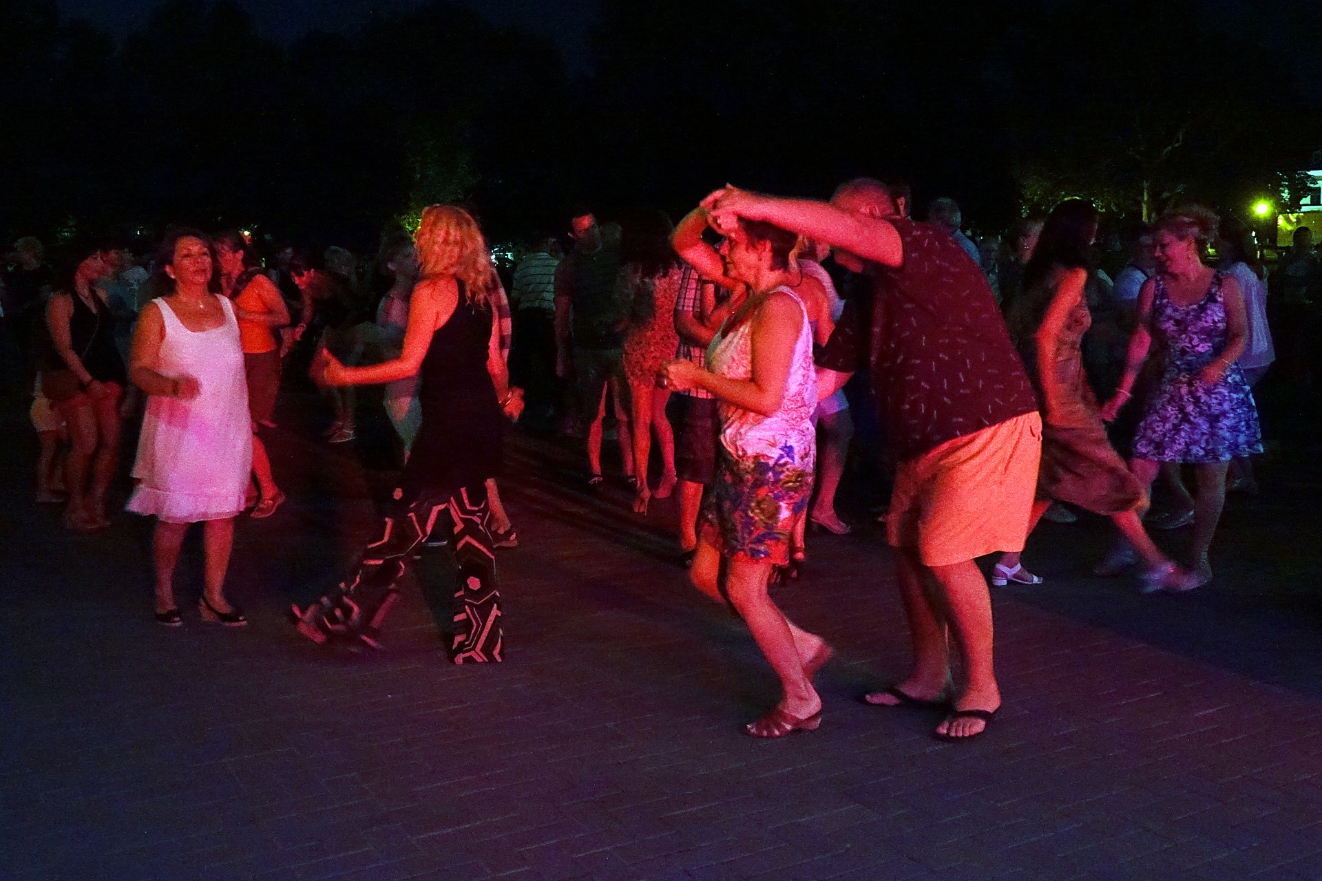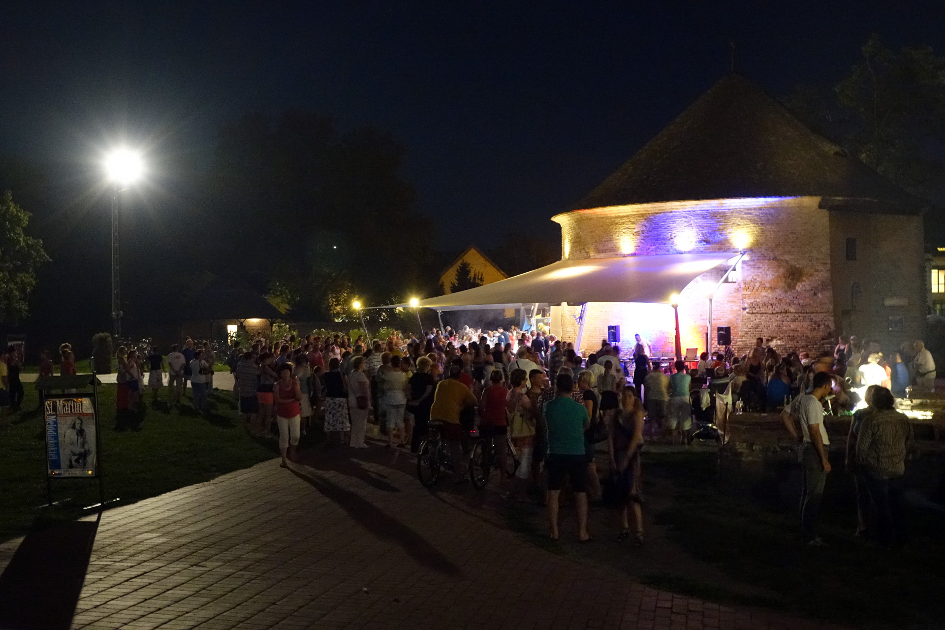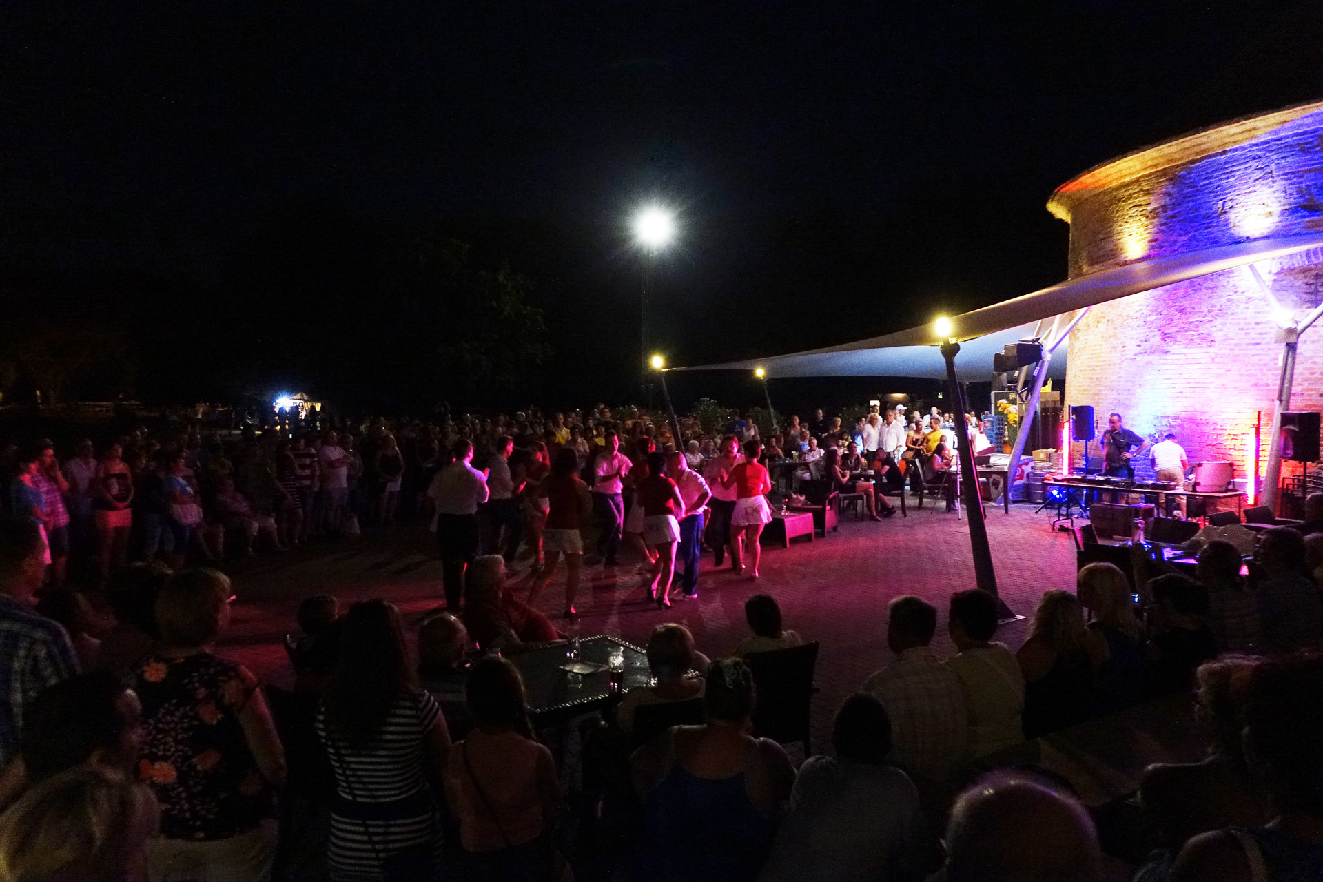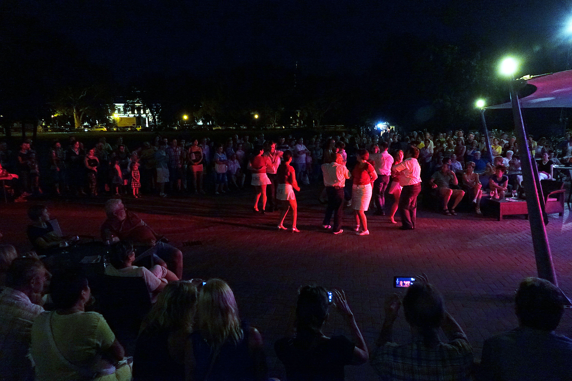 Már a kezdés előtti percekben fokozatosan gyarapodott az érdeklődőkből összegyűlt embercsoport a vár térfelőli oldalánál, hogy nézzék, vagy hogy épp maguk is bekapcsolódjanak a táncforgatagba. Ez utóbbihoz a Dolce Dance Nemzetközi Tánciskola növendékei adtak bátorítást, akik látványos bemutatójukkal olyan hangulatot teremtetettek, hogy még azok is közéjük penderültek, akik eredetileg beszélgetéssel, ácsorgással vagy épp kerékpárjuk oldalirányú támasztásának kitartó gyakorlásával tervezték eltölteni az estét a Rondellánál.