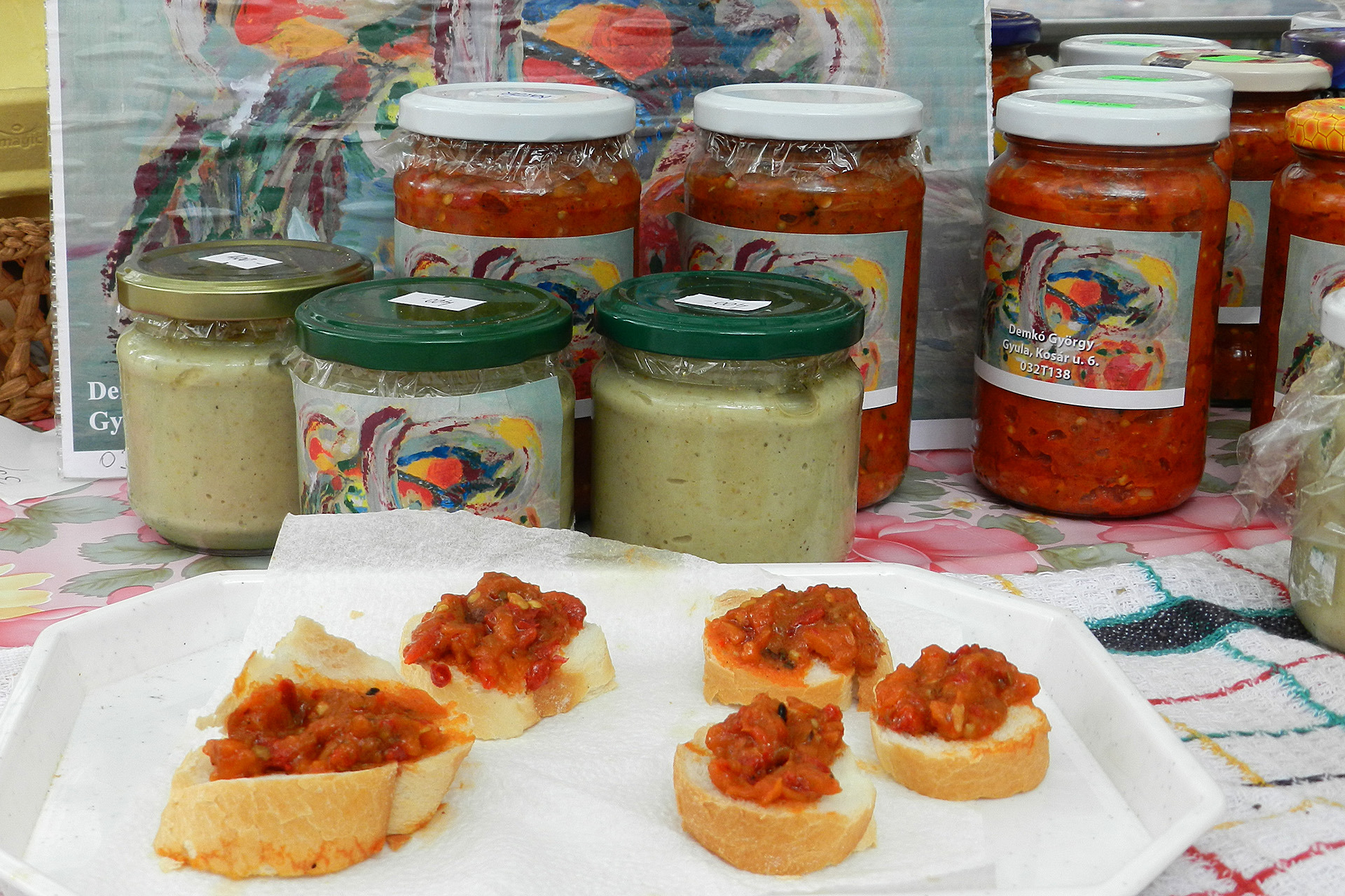 A szendvicskrémeket készítő termelő lapunknak elmondta: az ínyencségekhez saját termésű zöldségeket használ fel. Mindkét terméknek parázson sült padlizsán az alapanyaga, a zakuszkába paradicsom, paprika, vöröshagyma, fokhagyma, étolaj és lestyán is kerül, míg a hagyományos zöldségpástétom mustár, fokhagyma és étolaj hozzáadásával készül. Az árus egyedi címkét ragasztott az üvegekre, áruját az általa festett olajfestmény reprójával díszítette.