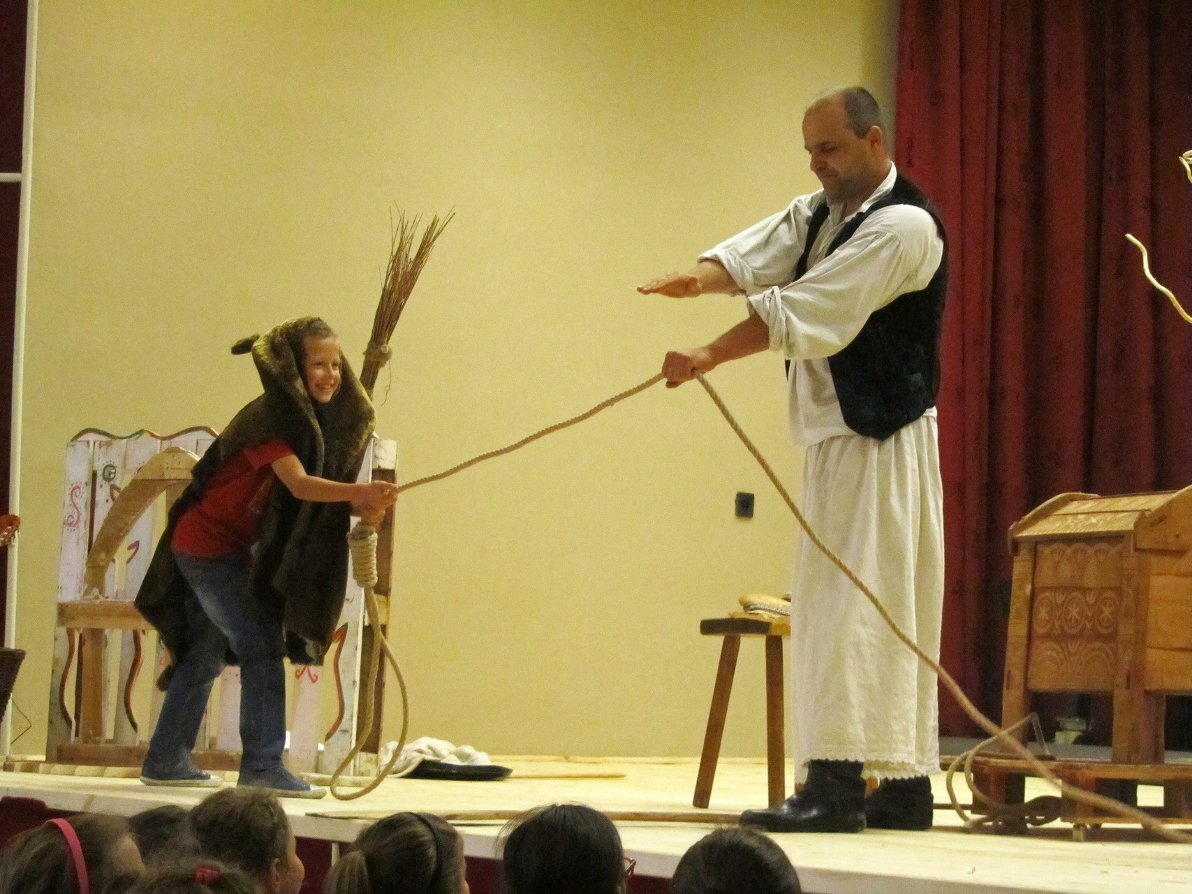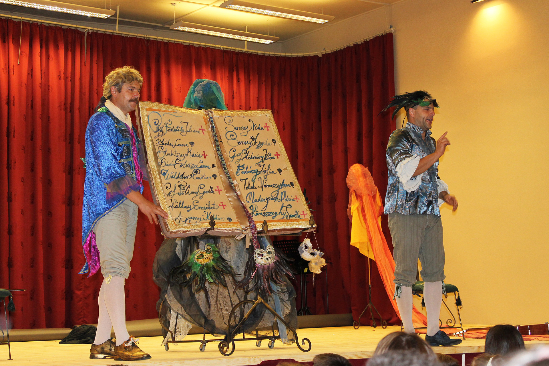Ebben a tanévben először alsósaink is részesülhettek az élményből. Nekik a magyar népmesékből összeállított Azördögbe! című előadását hozta állandó partnereivel: színésztársával, feleségével, Kiss Szilviával és „Pintyő” Mester László népzenésszel. A kicsit önfeledt nevetése a legértőbb kritika volt. Mutatva, a mesék világa még mindig elvarázsolja őket! A felsősöknél megint nagy fába vágta fejszéjét. Csokonai Vitéz Mihály Dorottya, avagy a dámák diadala a fársángon című darabja nehéz szövegével, témájával igazi kihívás volt. A művész szokásos természetességével, humorával, rögtönzéseivel áthidalta ezeket. Megint bevezette a gyerekeket egy olyan mű világába, ahol egyedül nem boldogulhattak volna. Nem úgy érezték, hogy egy érettségi tétel szinte kötelező unalma, hanem egy izgalmas történet fordulatai között járnak. Köszönet érte minden néző nevében!