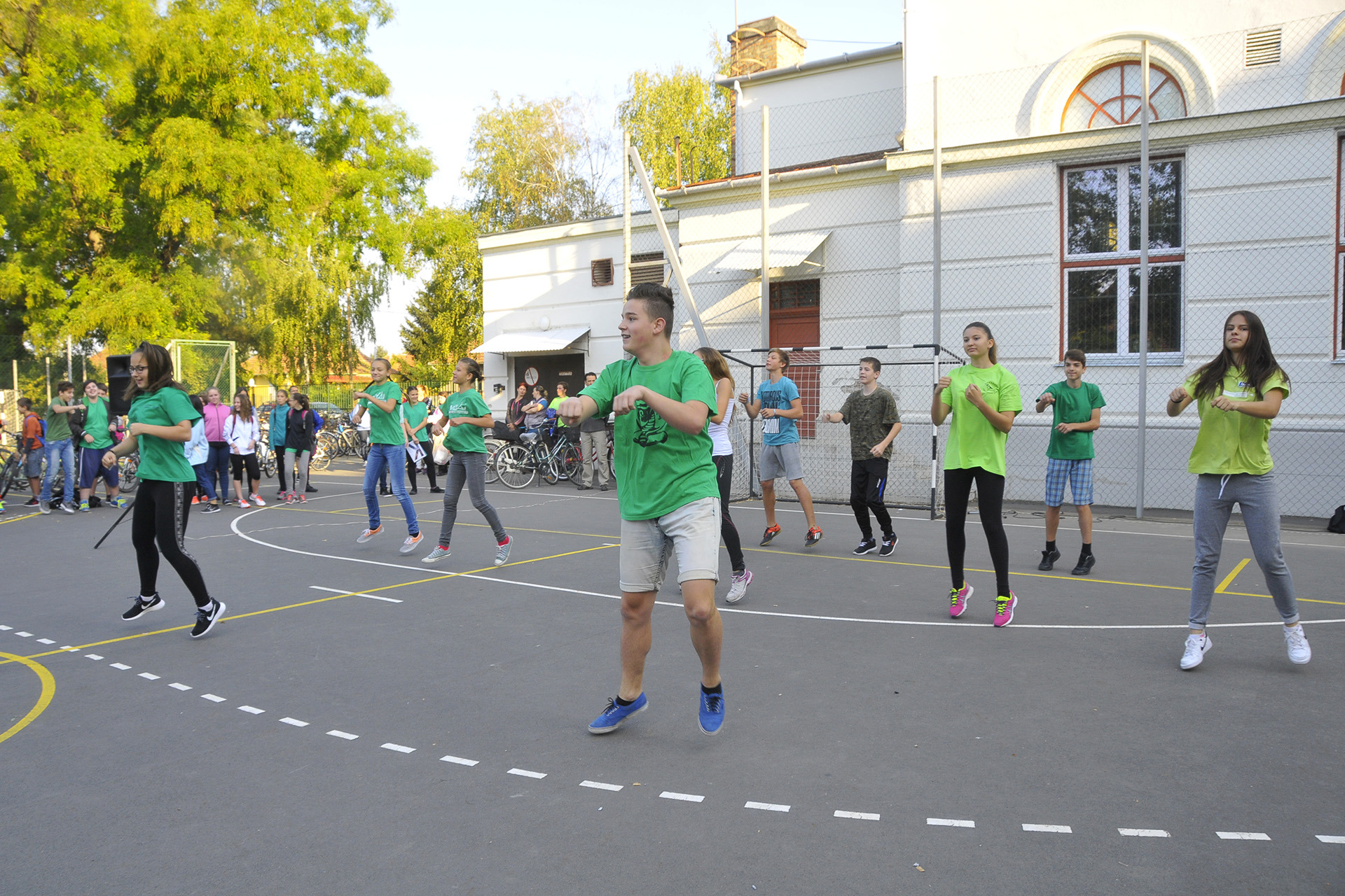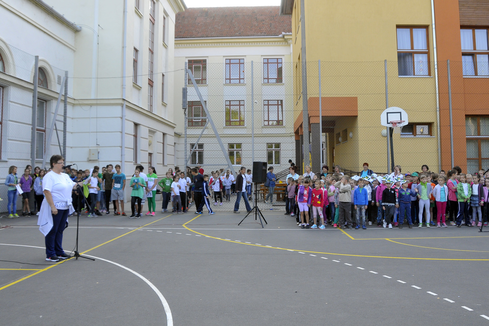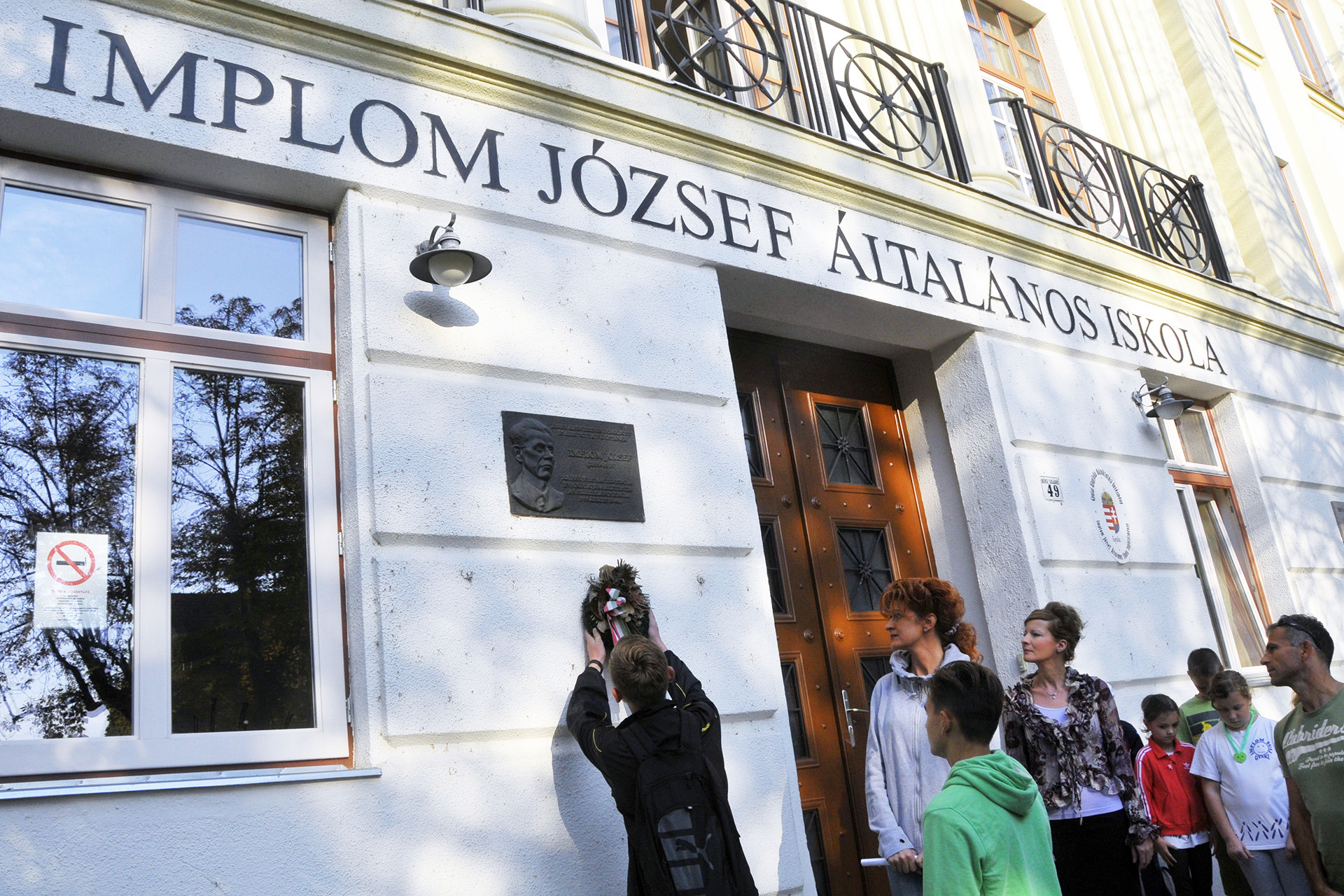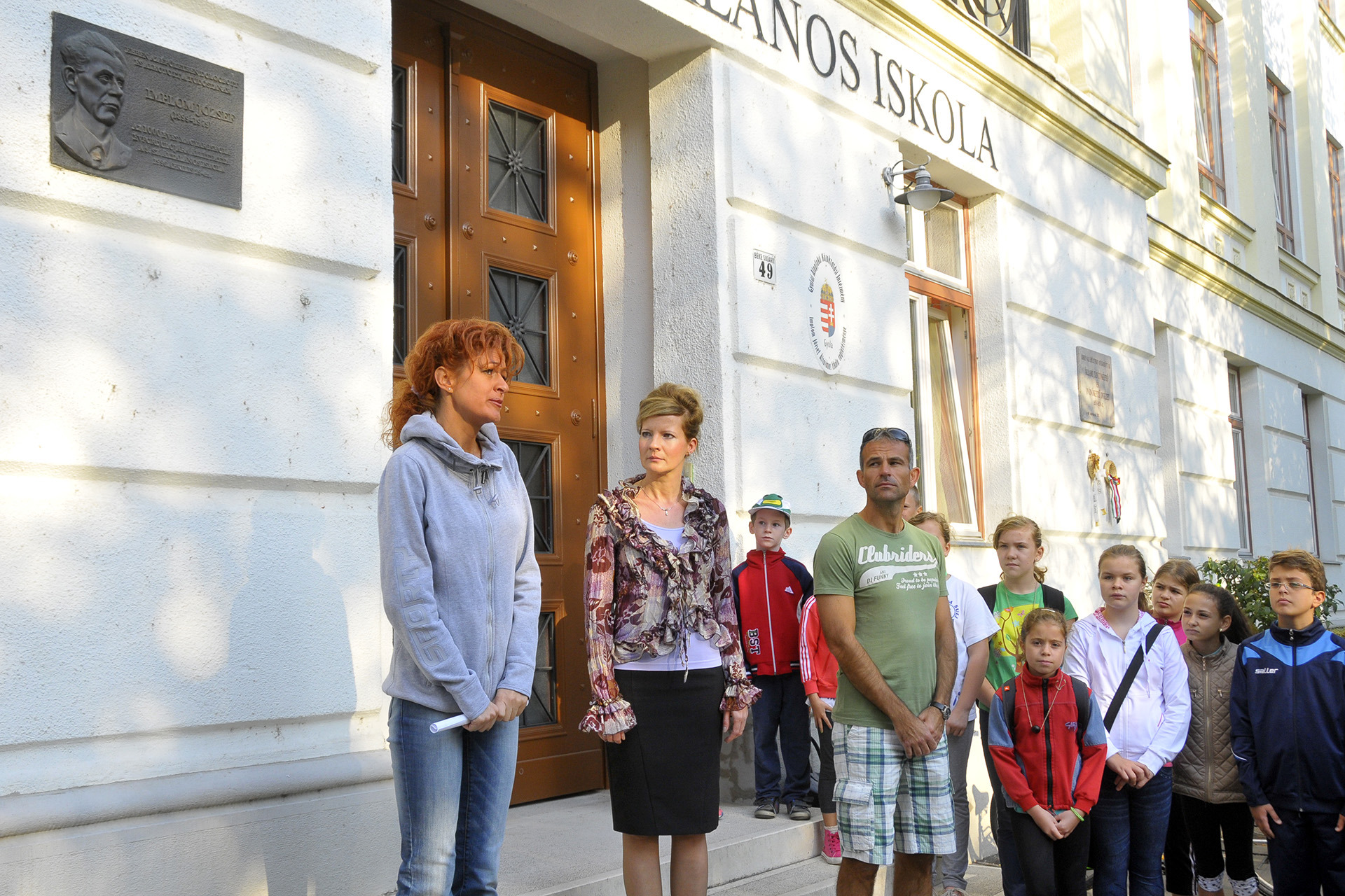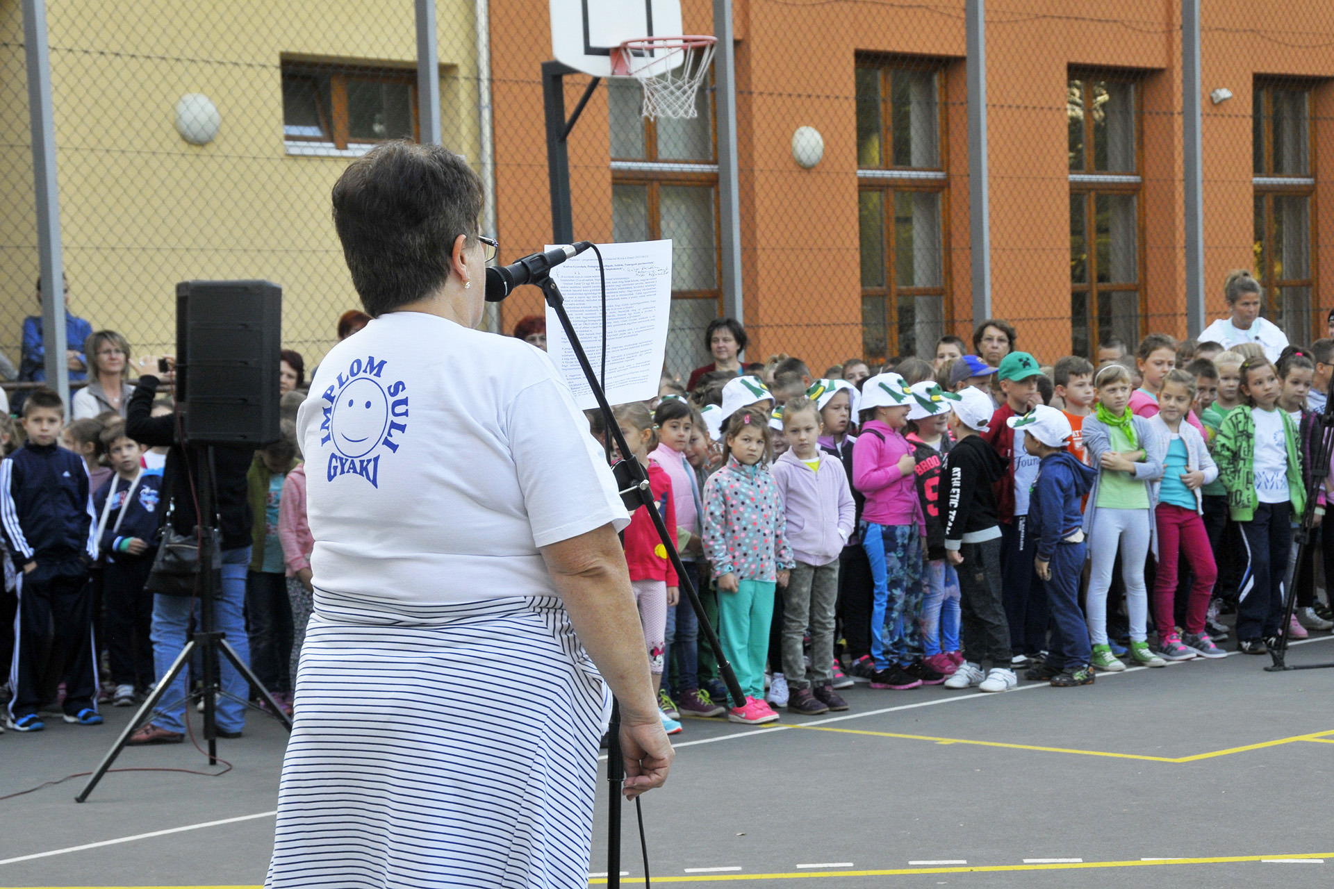 A megnyitóra a 7. b osztályosok „ökoműsorral” készültek, majd közösen melegítettek be kicsik és nagyok, végül Kertes Gabriella és Szávai Krisztina tankerület-igazgató, valamint az osztályok képviselői megkoszorúzták az oktatási intézmény homlokzatán található Implom-emléktáblát.