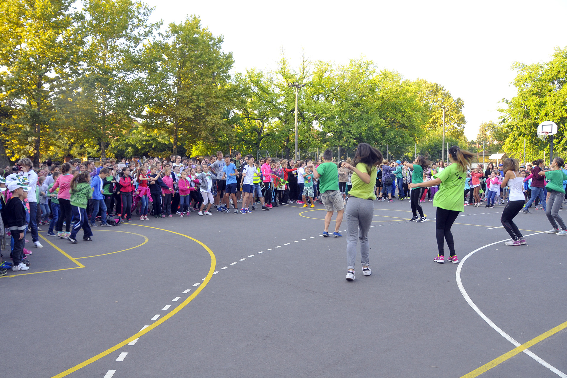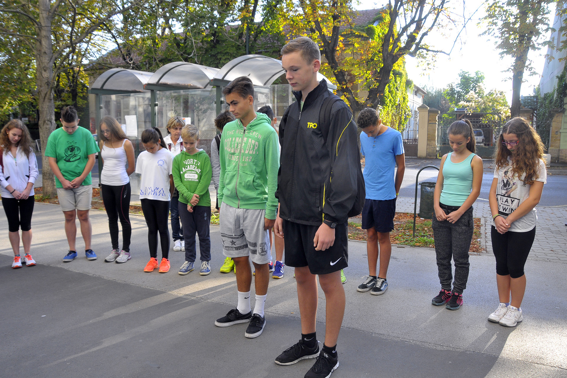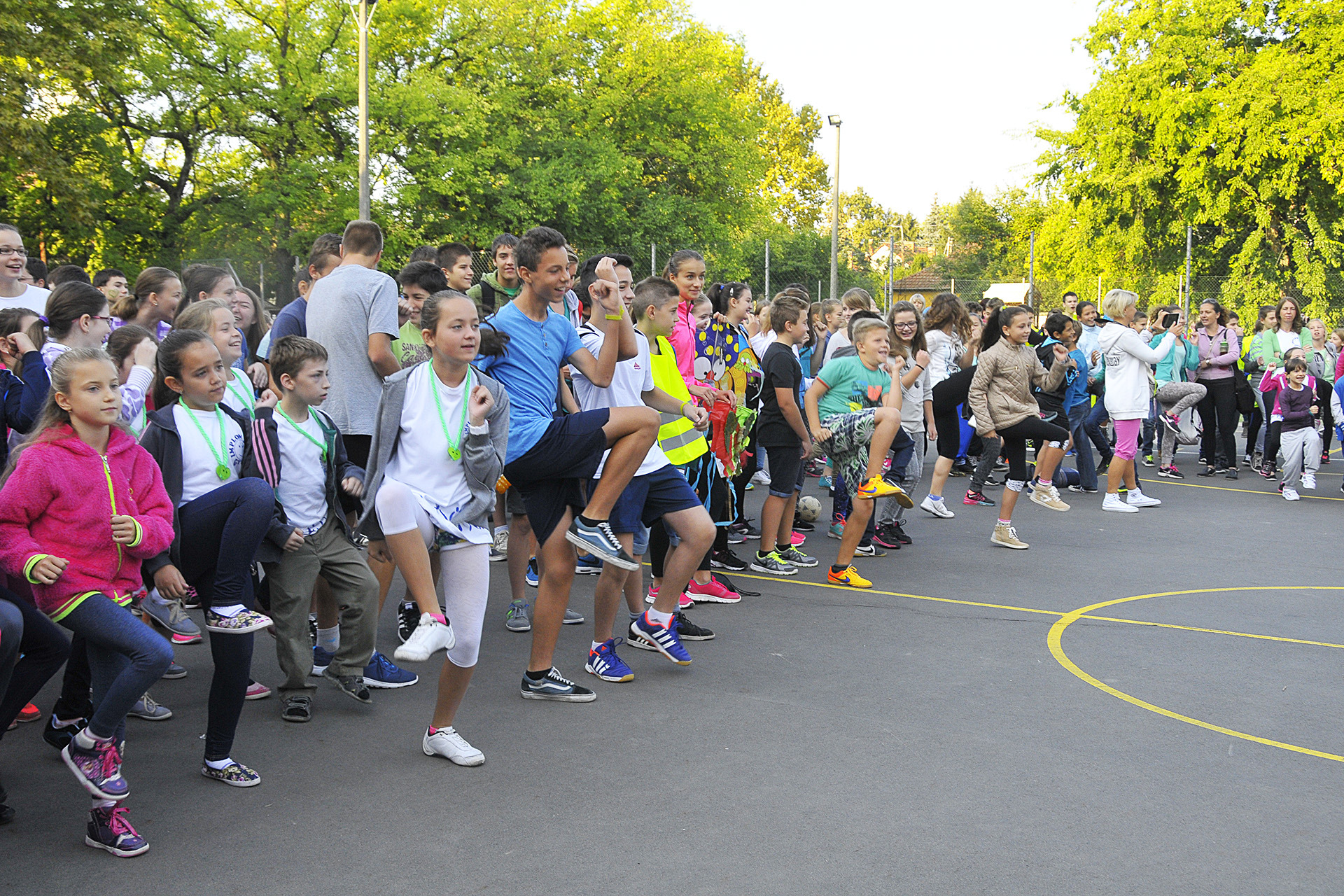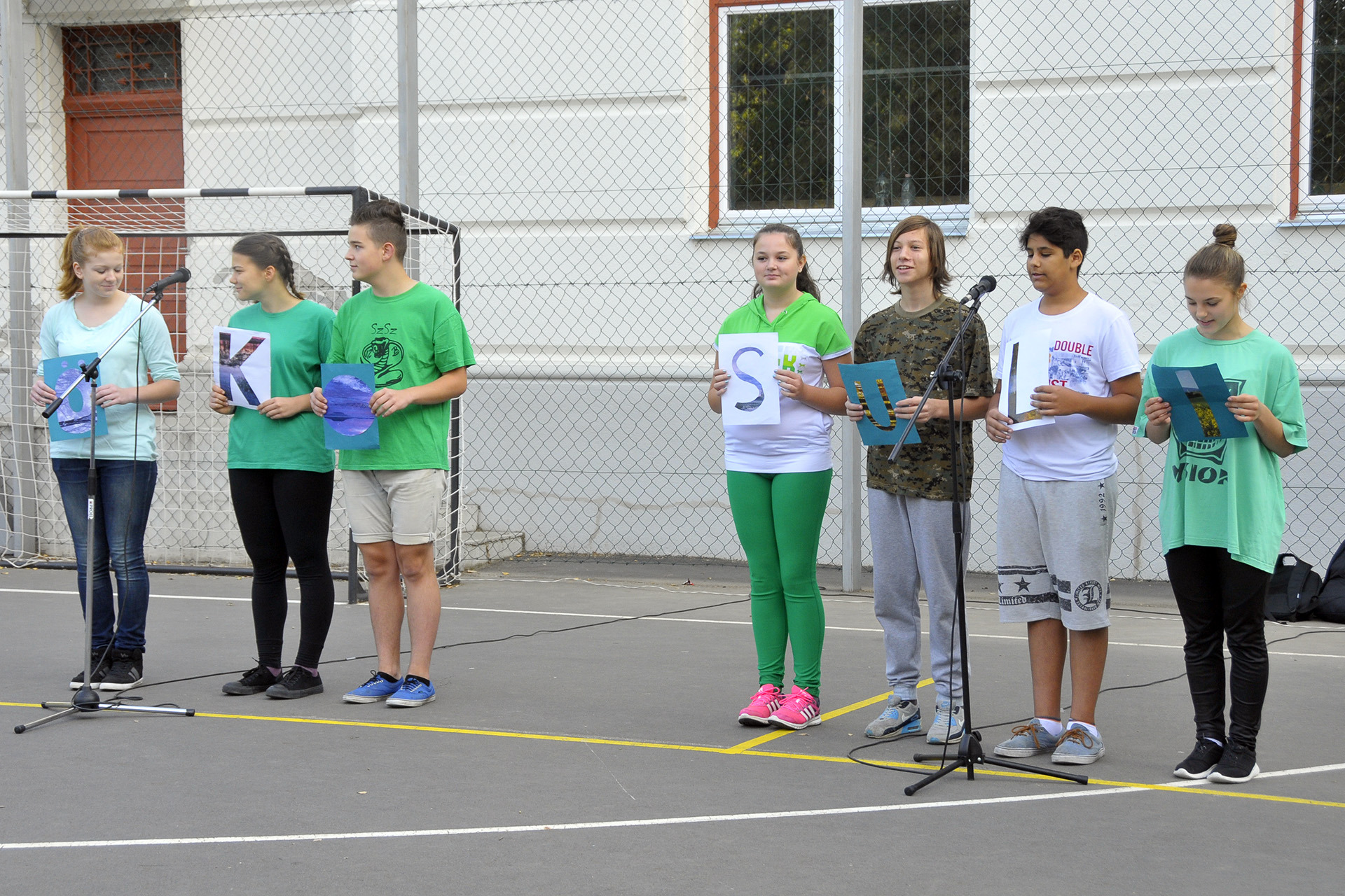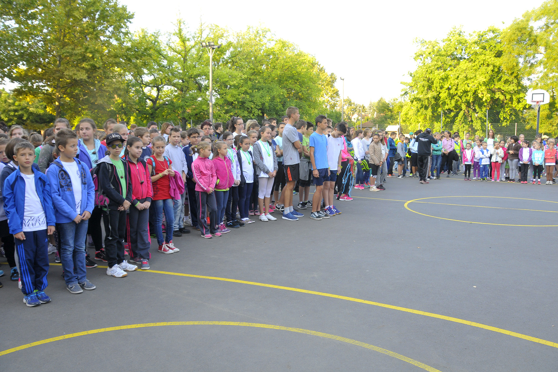 A megnyitóra a 7. b osztályosok „ökoműsorral” készültek, majd közösen melegítettek be kicsik és nagyok, végül Kertes Gabriella és Szávai Krisztina tankerület-igazgató, valamint az osztályok képviselői megkoszorúzták az oktatási intézmény homlokzatán található Implom-emléktáblát.