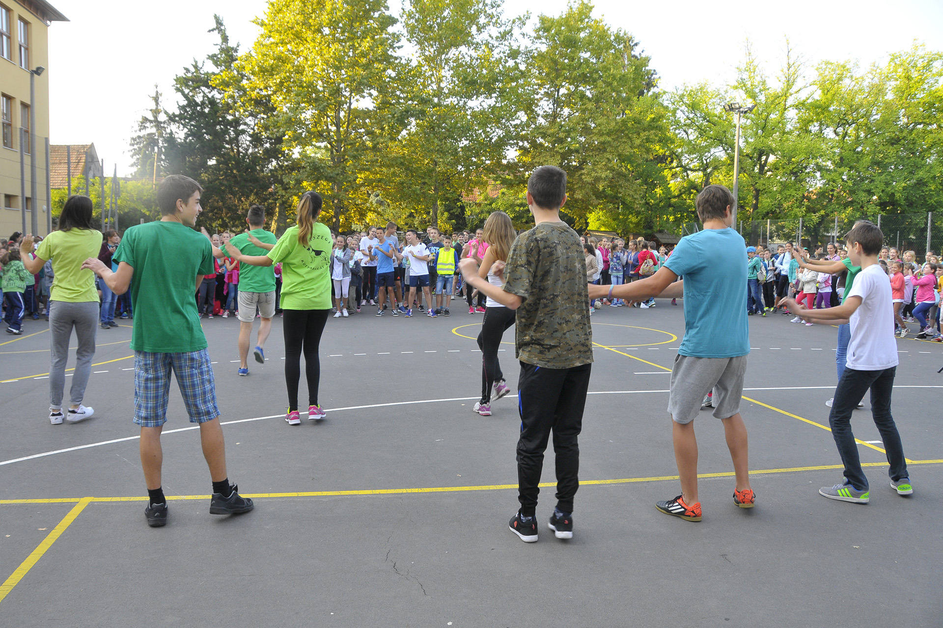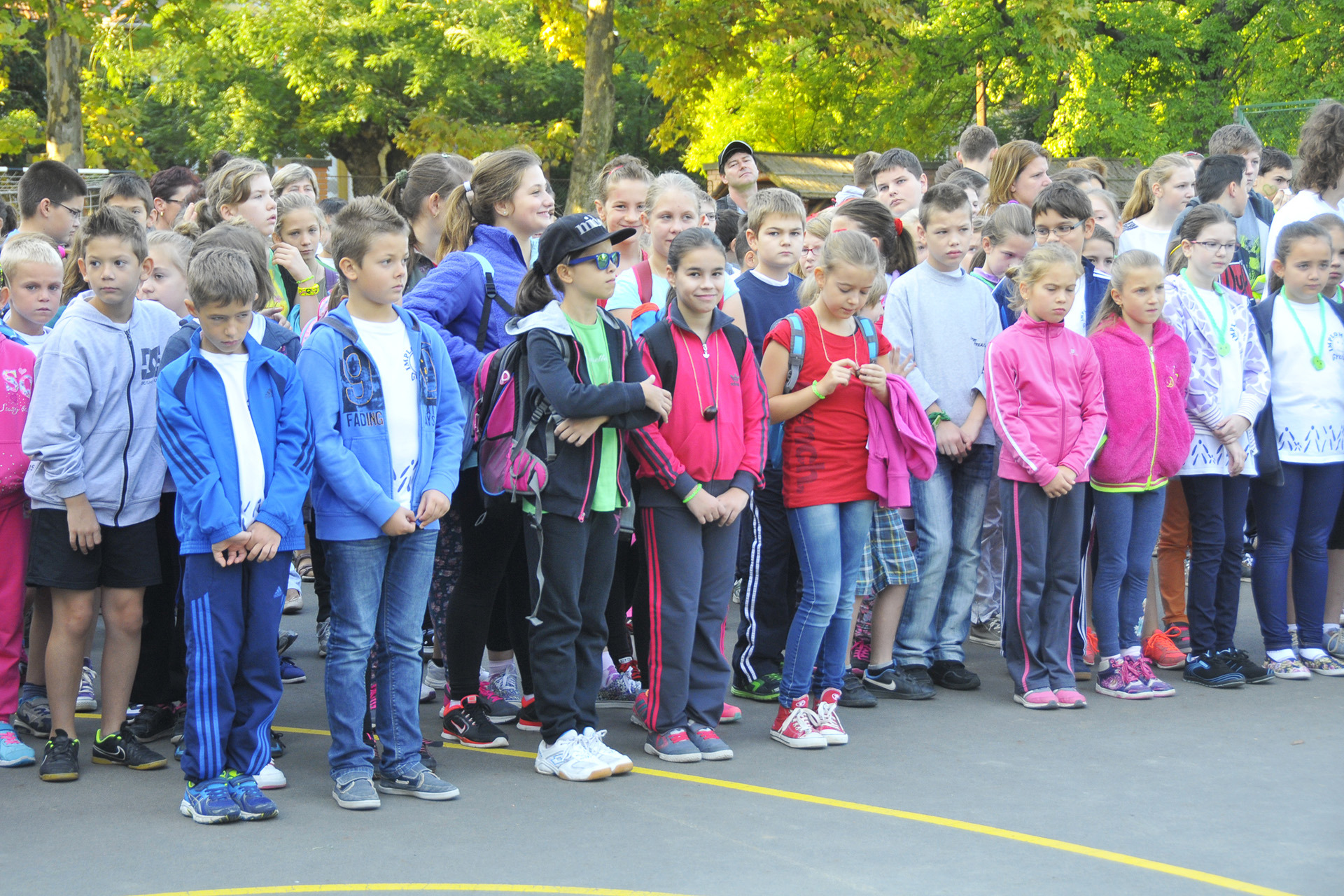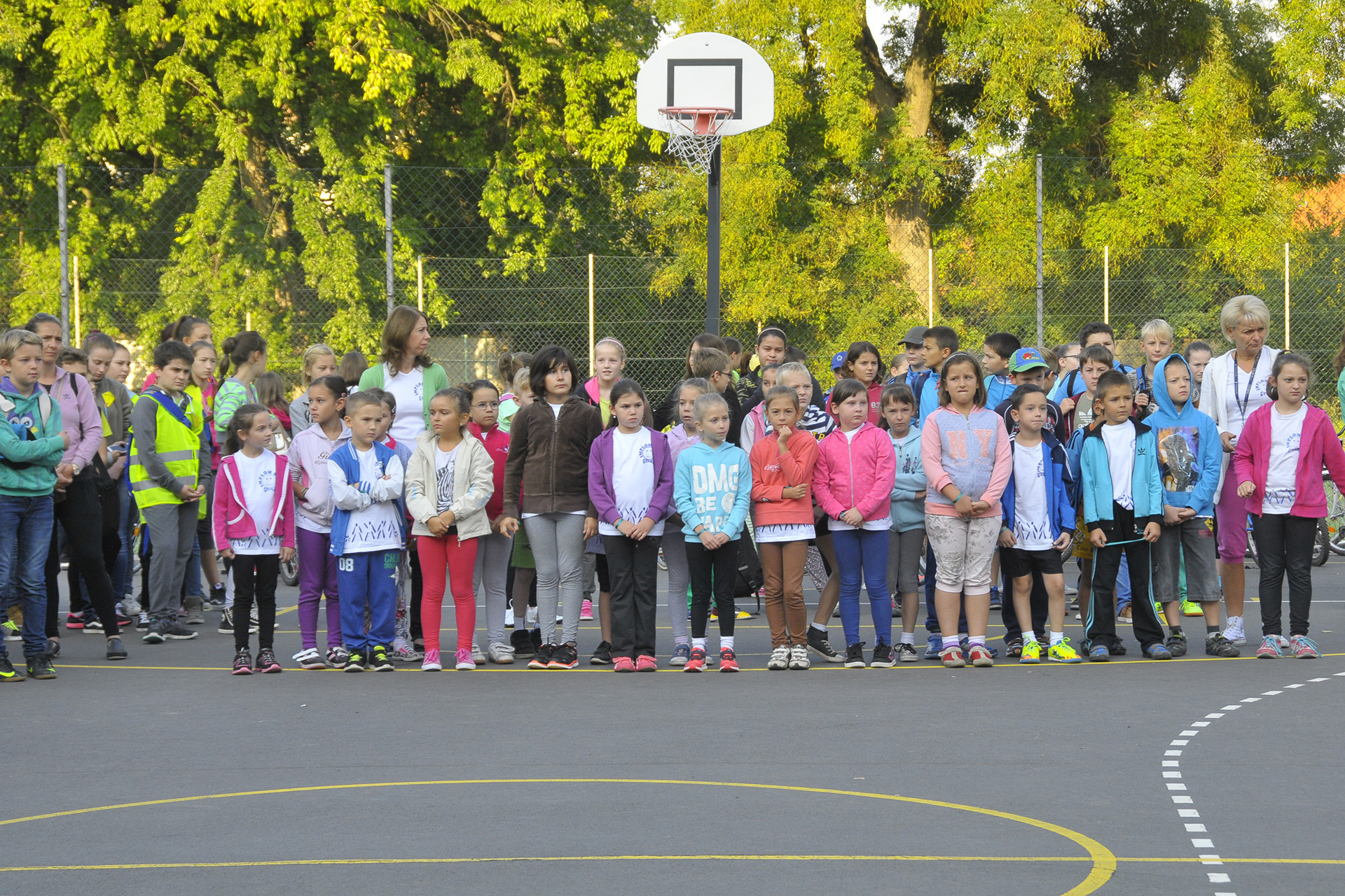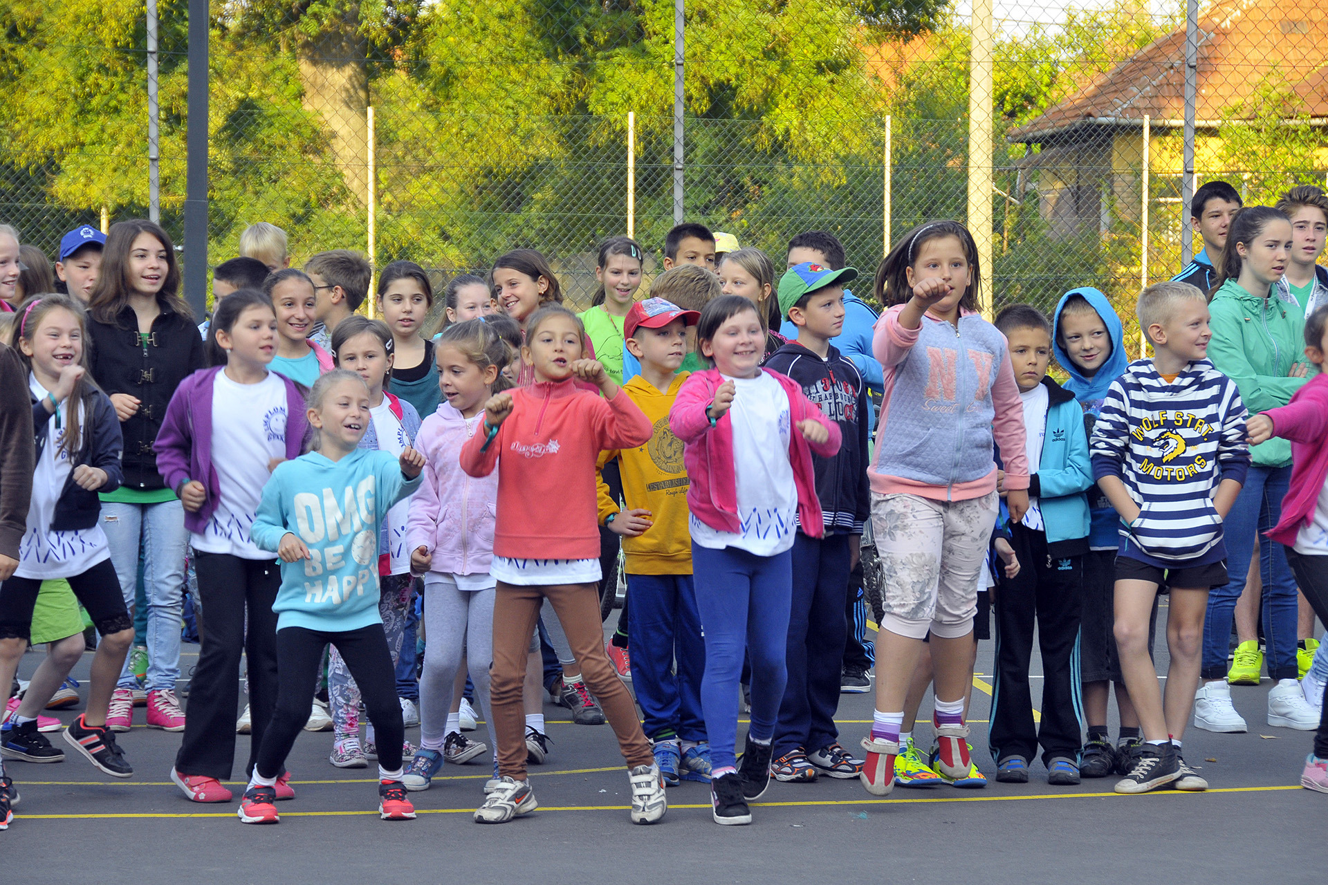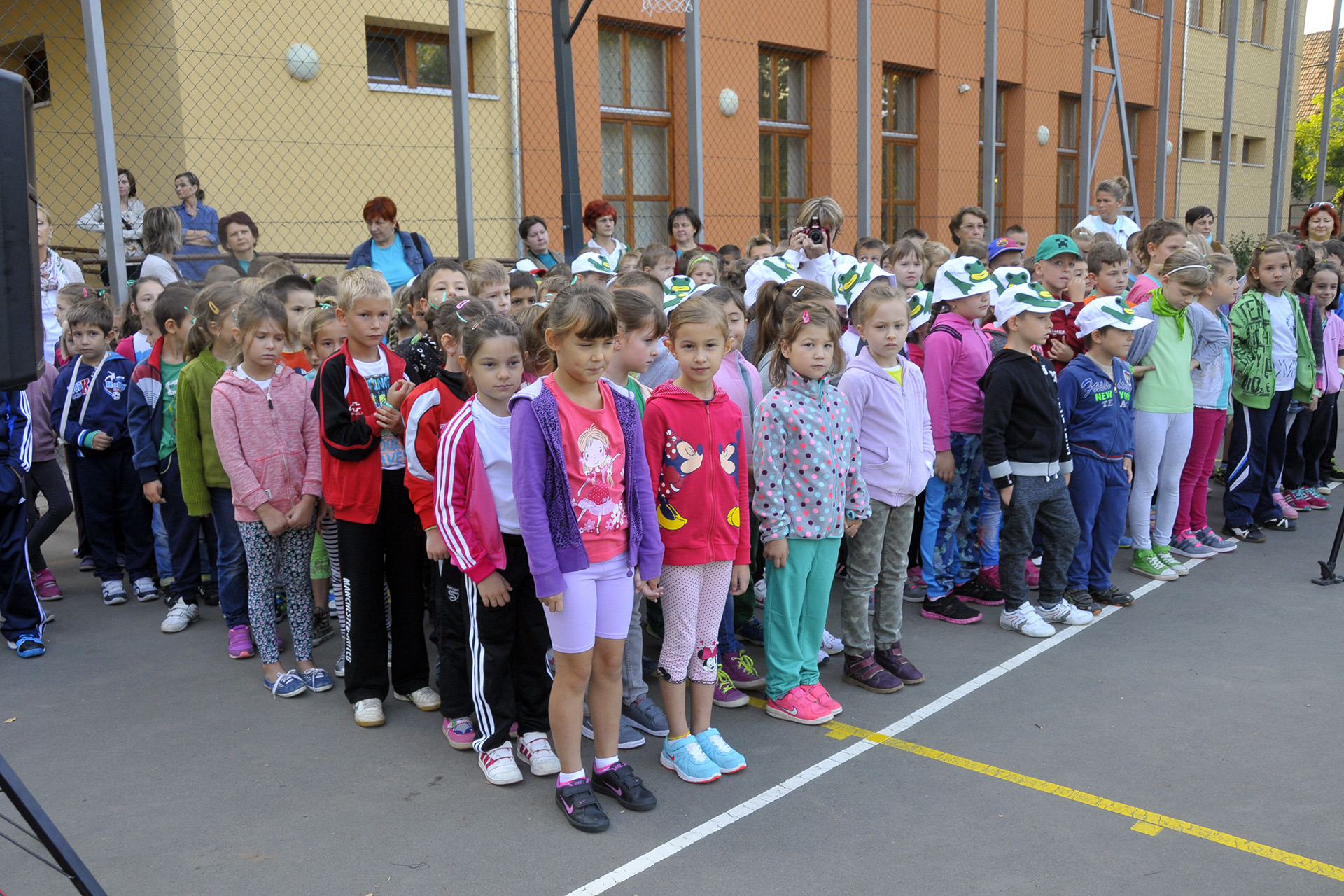 A megnyitóra a 7. b osztályosok „ökoműsorral” készültek, majd közösen melegítettek be kicsik és nagyok, végül Kertes Gabriella és Szávai Krisztina tankerület-igazgató, valamint az osztályok képviselői megkoszorúzták az oktatási intézmény homlokzatán található Implom-emléktáblát.