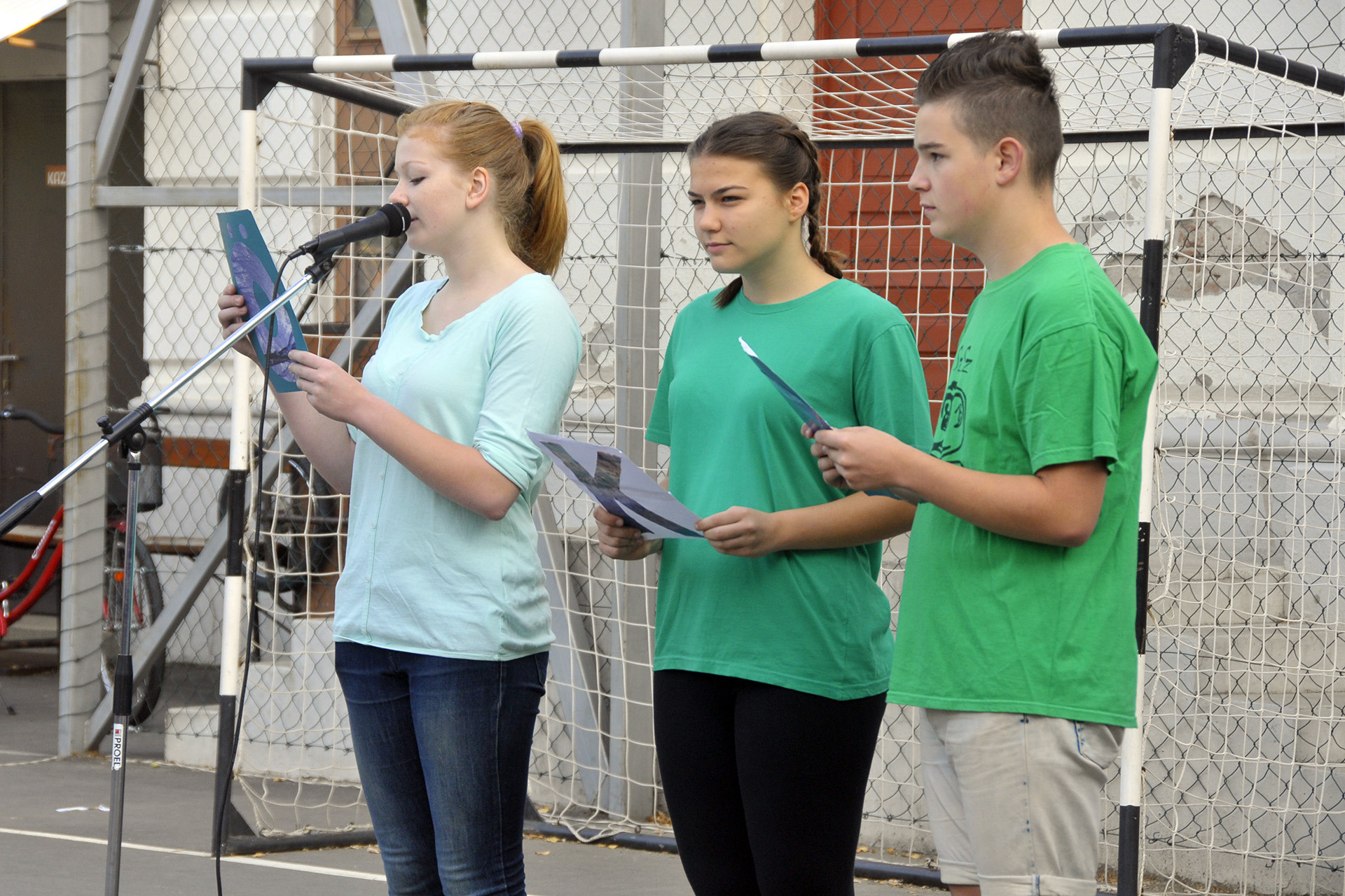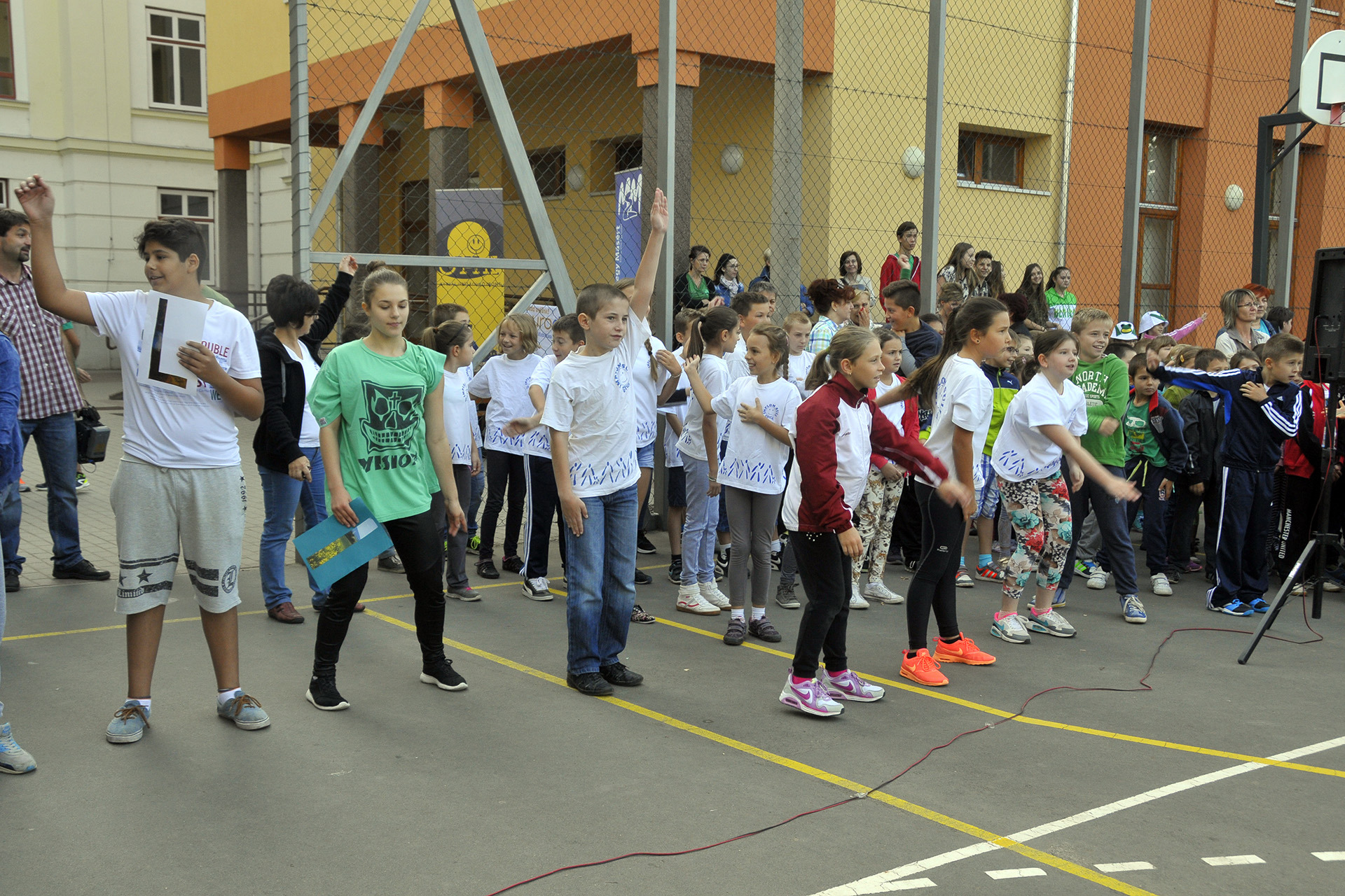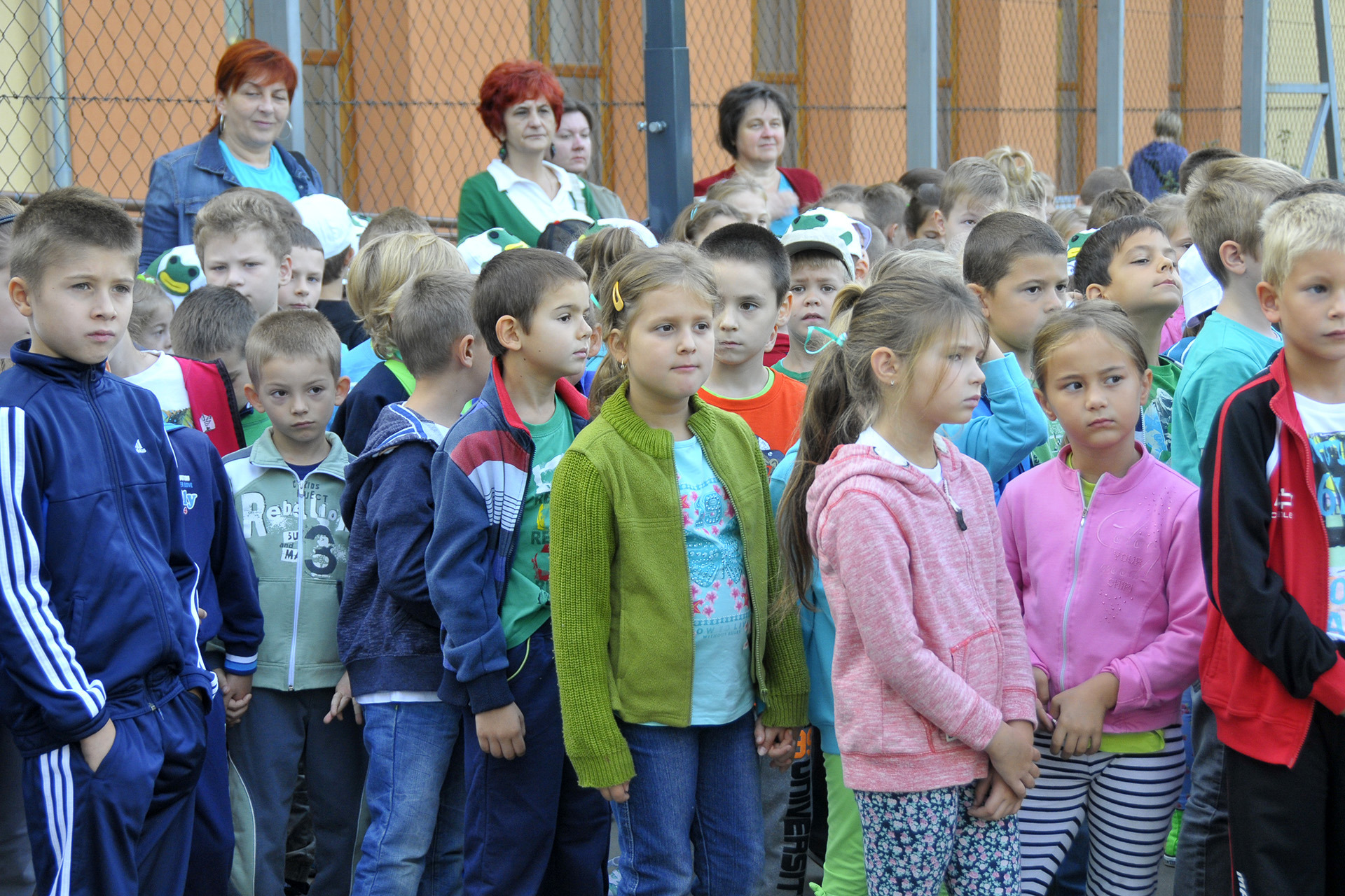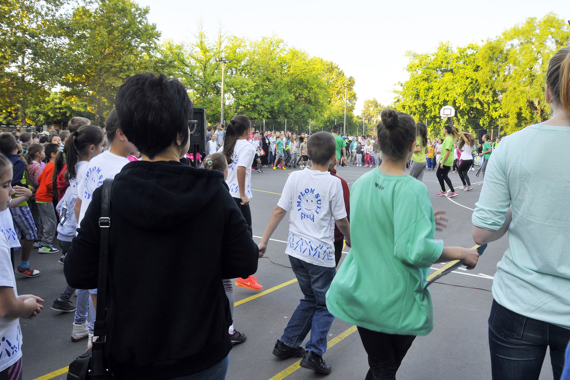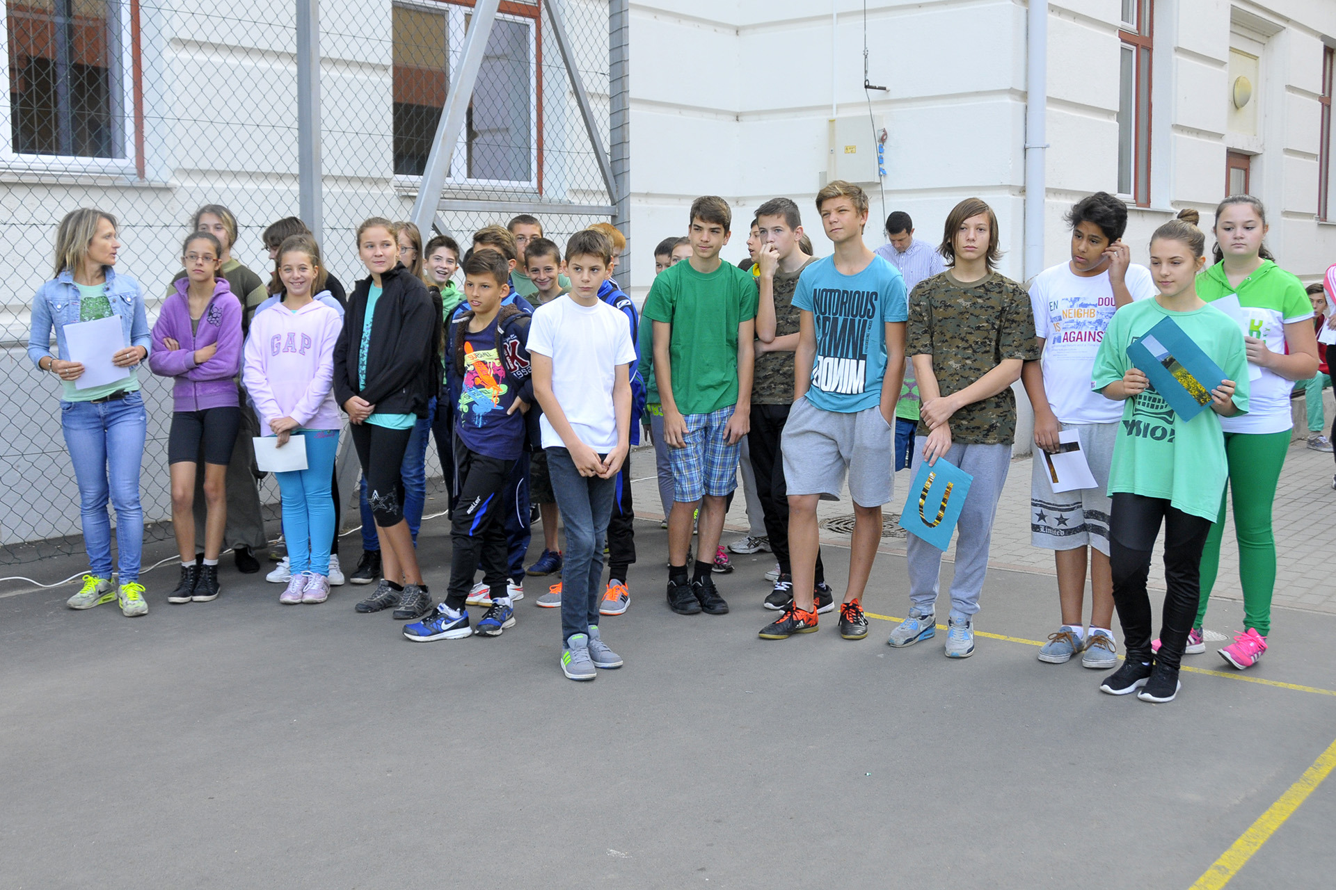 A megnyitóra a 7. b osztályosok „ökoműsorral” készültek, majd közösen melegítettek be kicsik és nagyok, végül Kertes Gabriella és Szávai Krisztina tankerület-igazgató, valamint az osztályok képviselői megkoszorúzták az oktatási intézmény homlokzatán található Implom-emléktáblát.