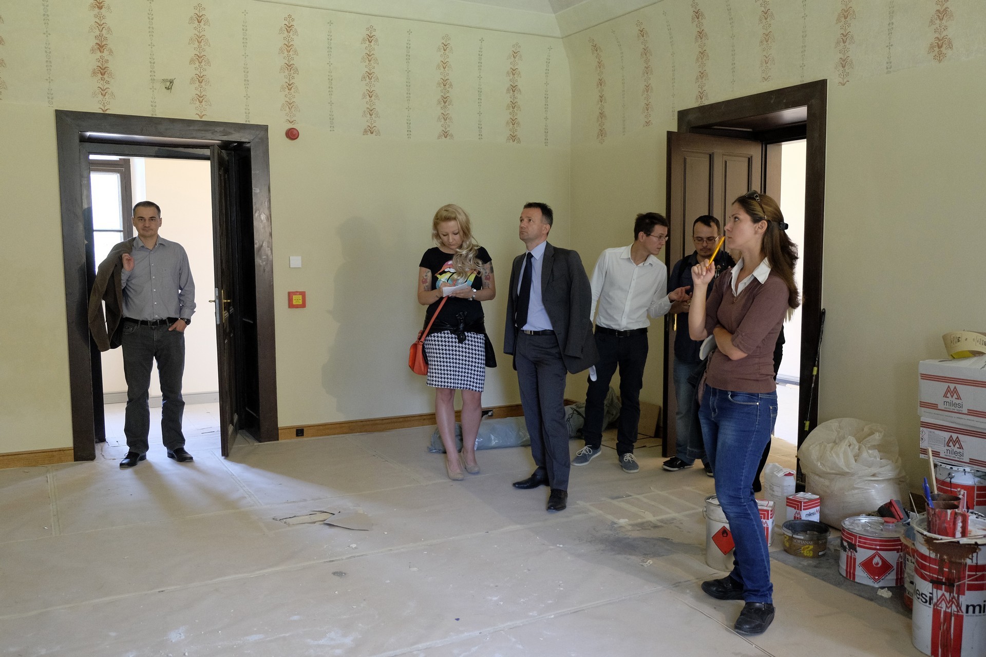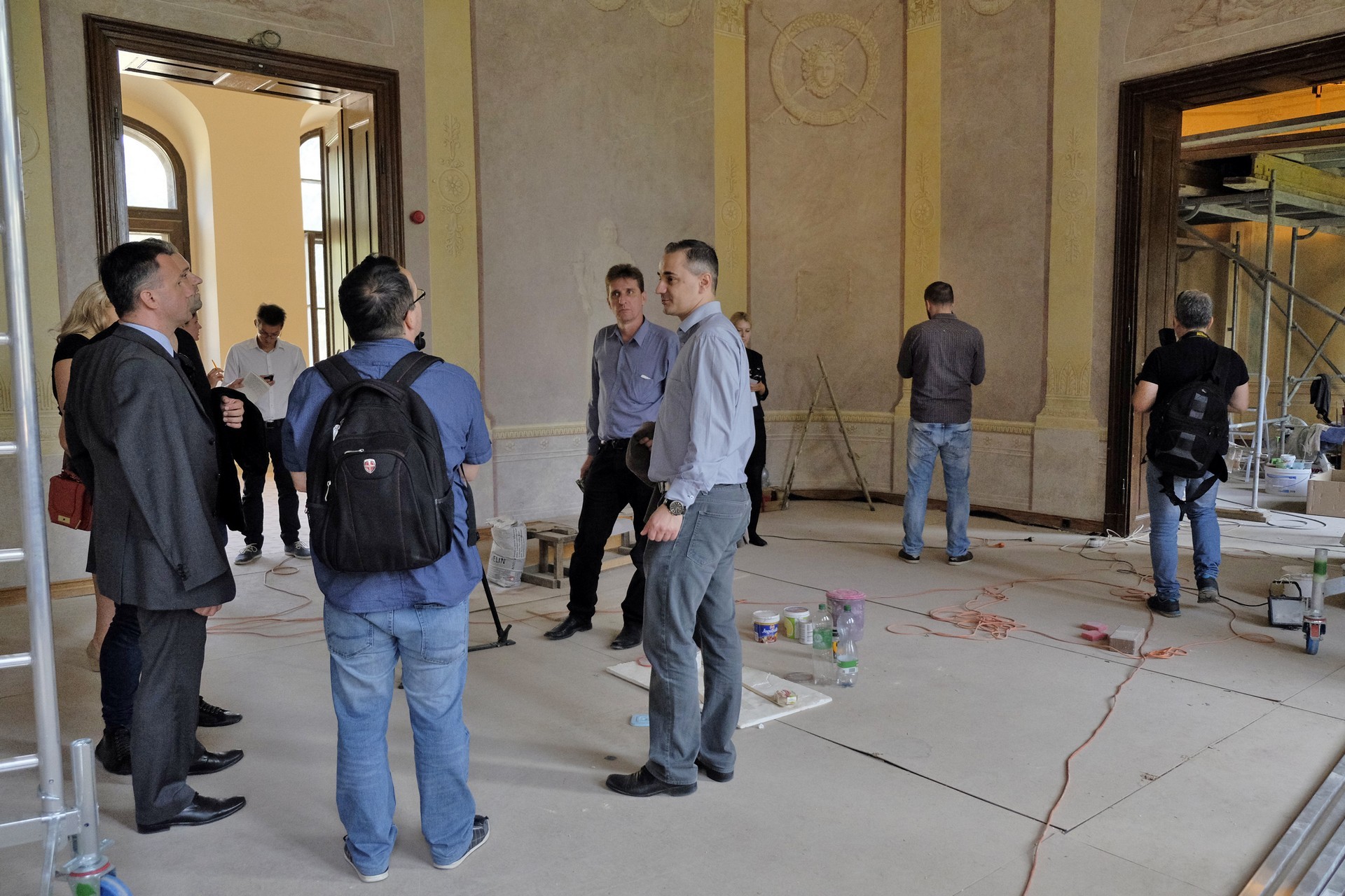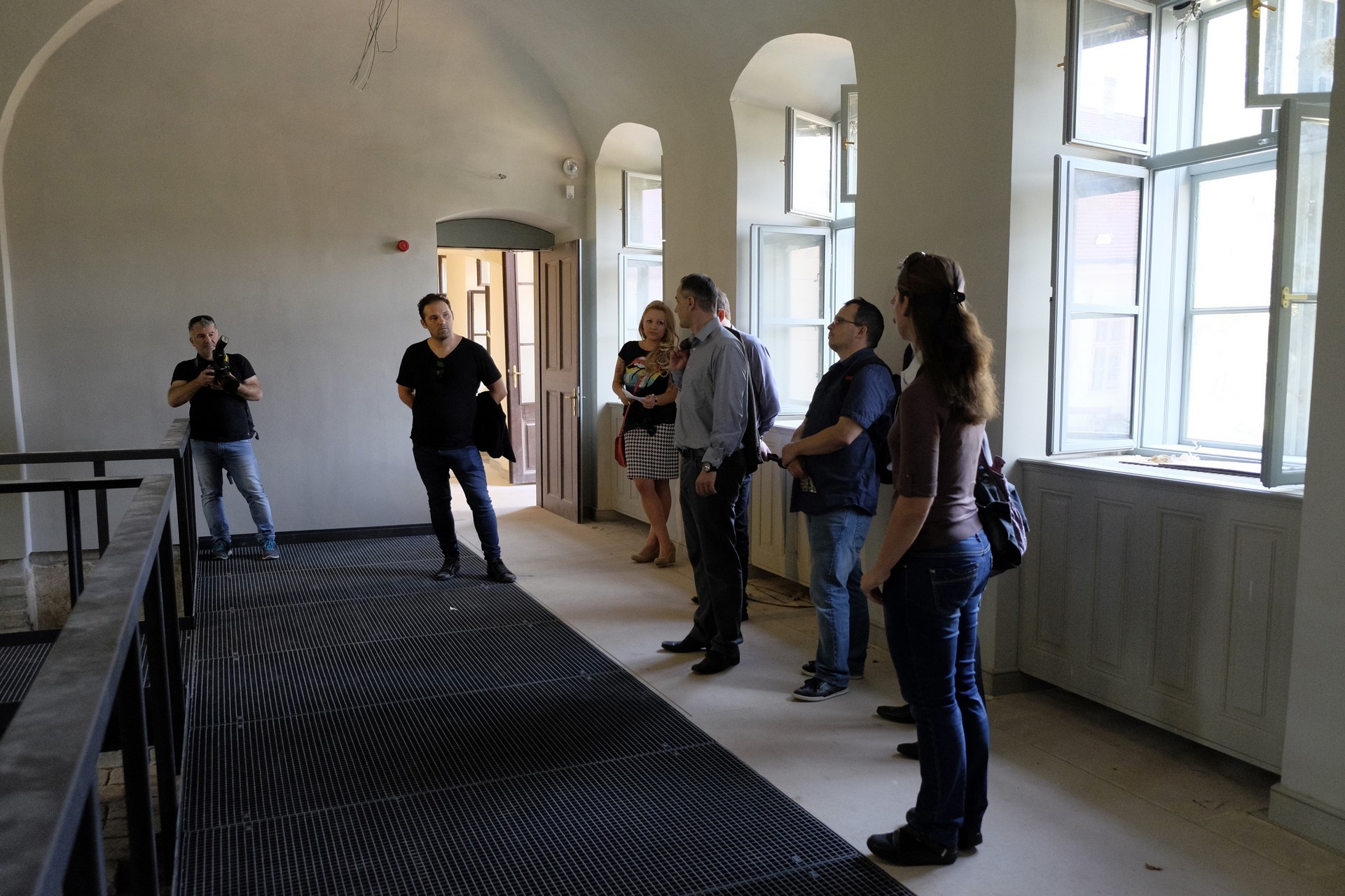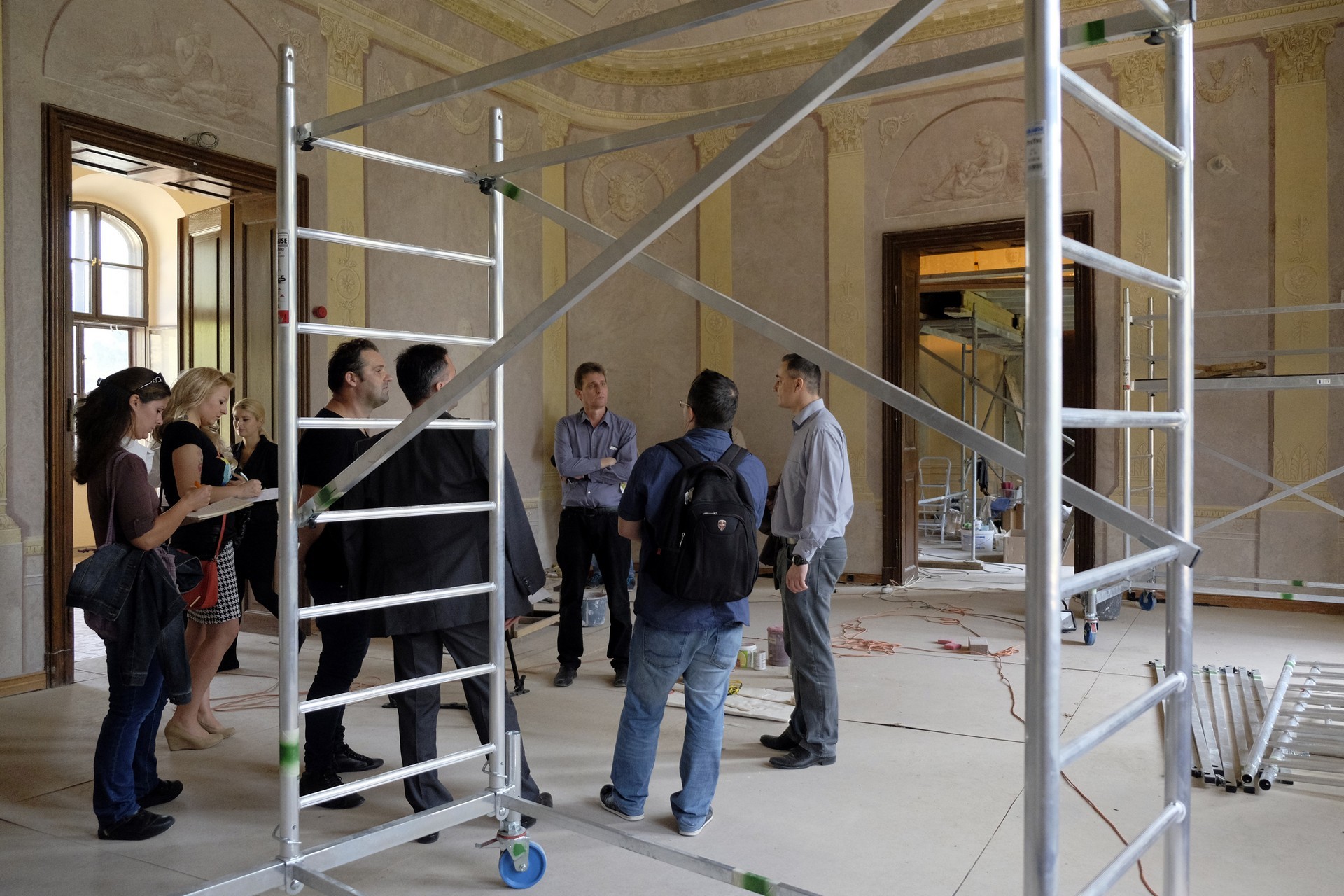 A köszöntő után a helyszín bejárását megelőzően dr. Virág Zsolt projektmenedzsertől megtudhattuk, hogy a felújítási munkálatok alapvető nehézségét valóban az épület állapota jelentette, hiszen a második világháború során annyira kifosztották azt, hogy alig maradt benne értékelhető információ, amiből munkájuk során kiindulhattak volna. Az épület eredeti képének hiteles visszaállítása érdekében annak múltjában végeztek kutatómunkát, így sikerült azt a tudásbázist összeollózniuk, ami később munkájuk alapját képezte és hozzásegítette a szakembereket a kastély turisztikai vonzerővé alakításához.