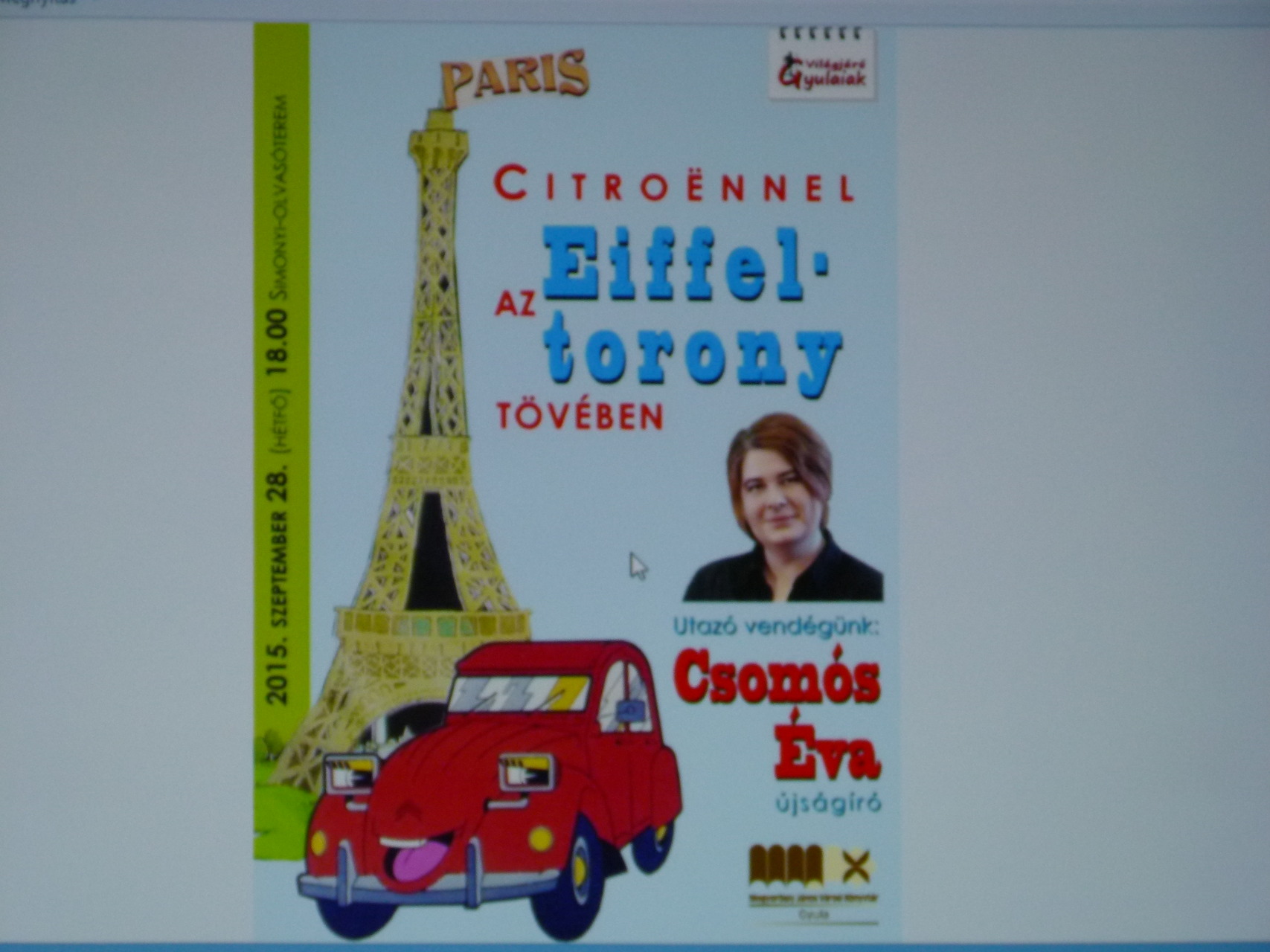 Csomós Éva képekkel gazdagon illusztrált előadásából megtudhattuk: kétszer is járt Párizsban, először 2004-ben nagy „autó szerelme”, a Citroën révén egy többfős társasággal, majd rá körülbelül egy évre barátnőjével kereste fel újra a francia fővárost.