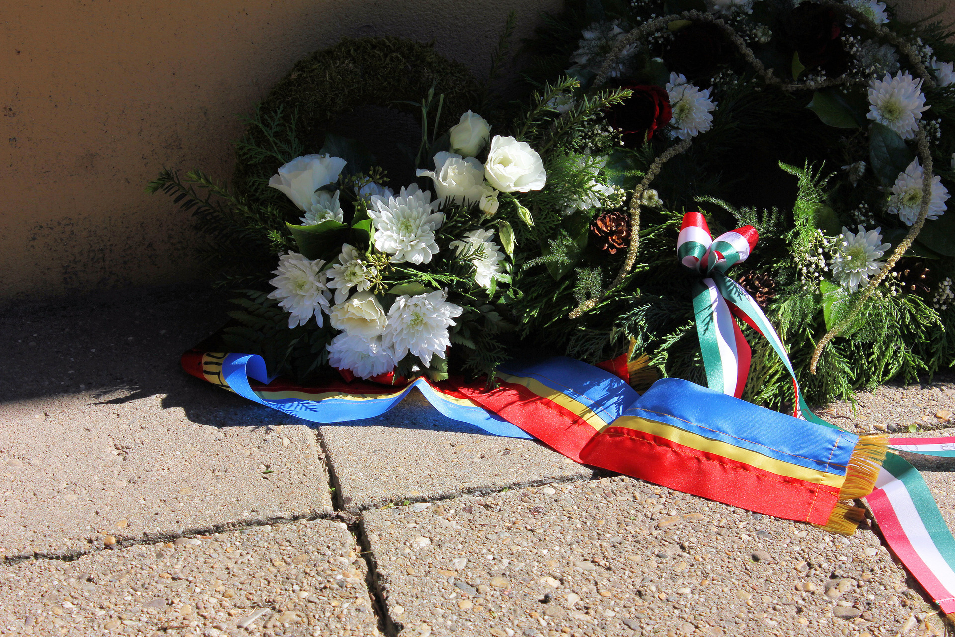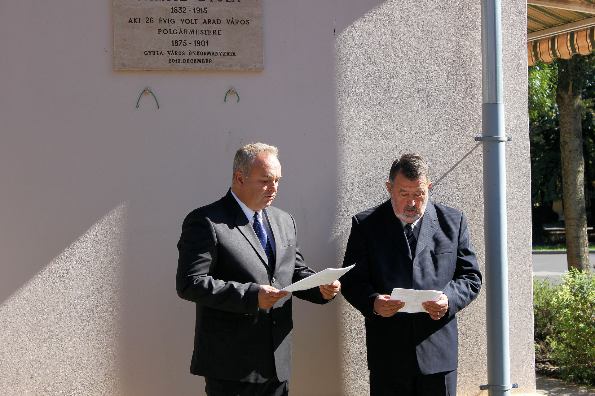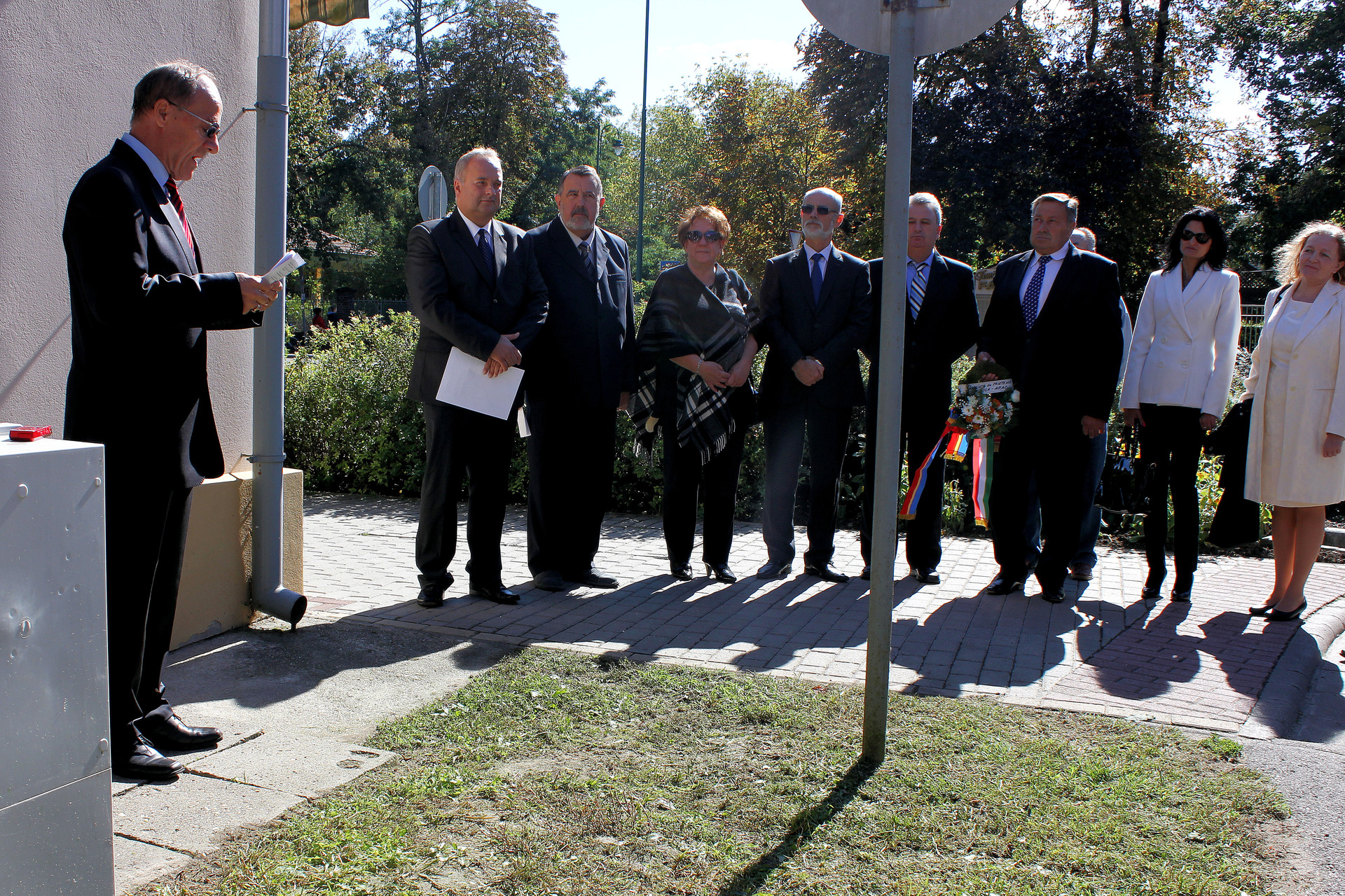 koszorúzás a gyulai Kossuth Lajos utca és a Horváth Ferenc utca sarkán álló épület előtt