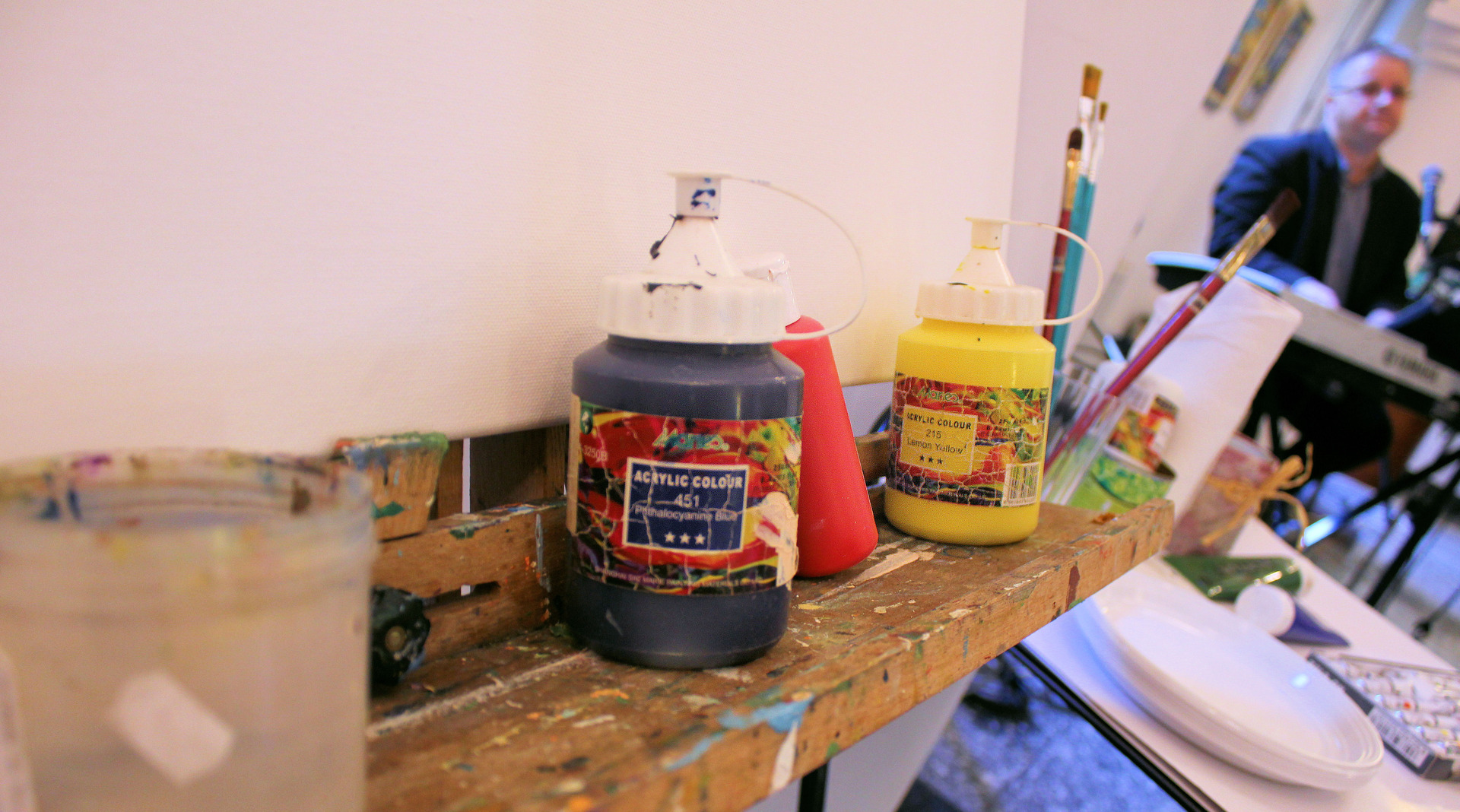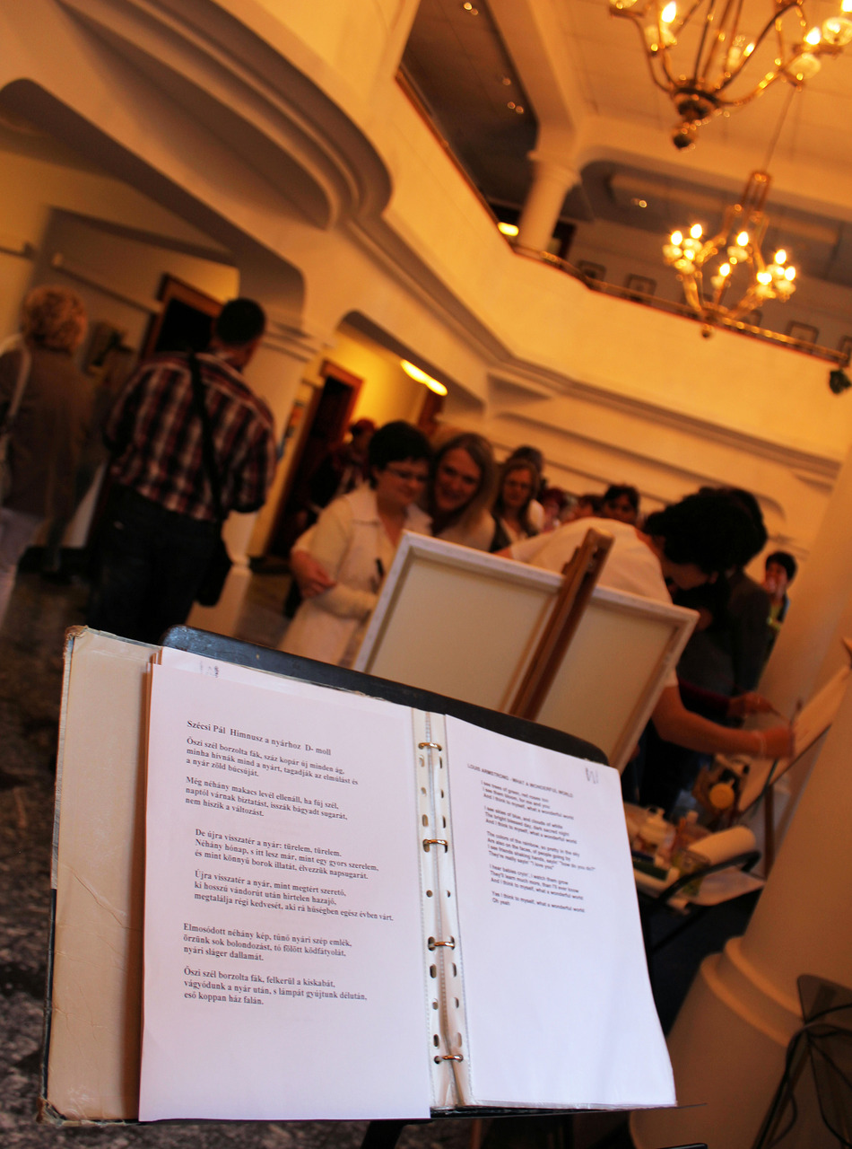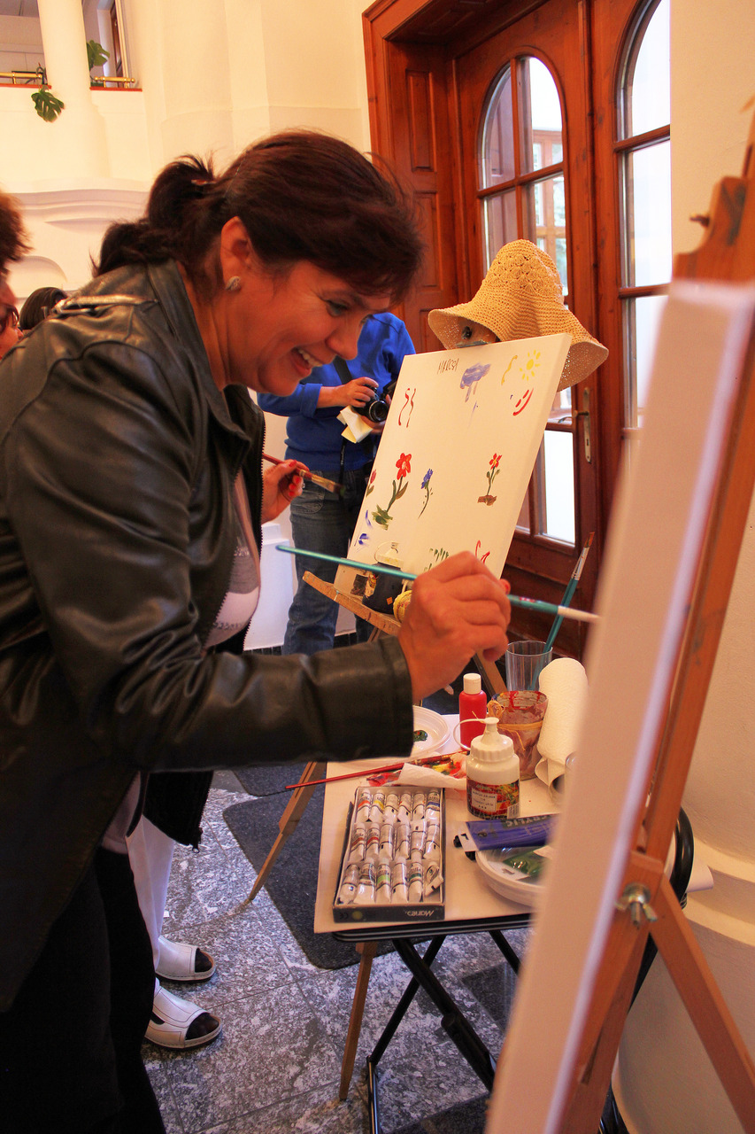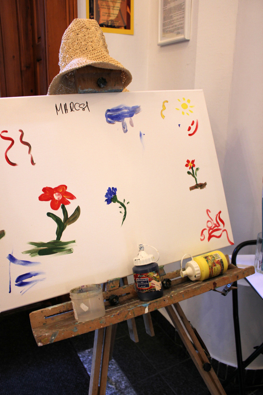 A gyulai alkotók minden érdeklődőt süteménnyel vártak egy kis baráti beszélgetésre, és ezen a napon ők maguk is feladatot adtak a látogatóknak. A vendégektől azt kérték, hogy a bejárathoz elhelyezett festővászonra az e célból előkészített eszközökkel alkossanak valami apróságot, így ennek a különleges napnak kézzel fogható, személyes emléke is marad számukra.