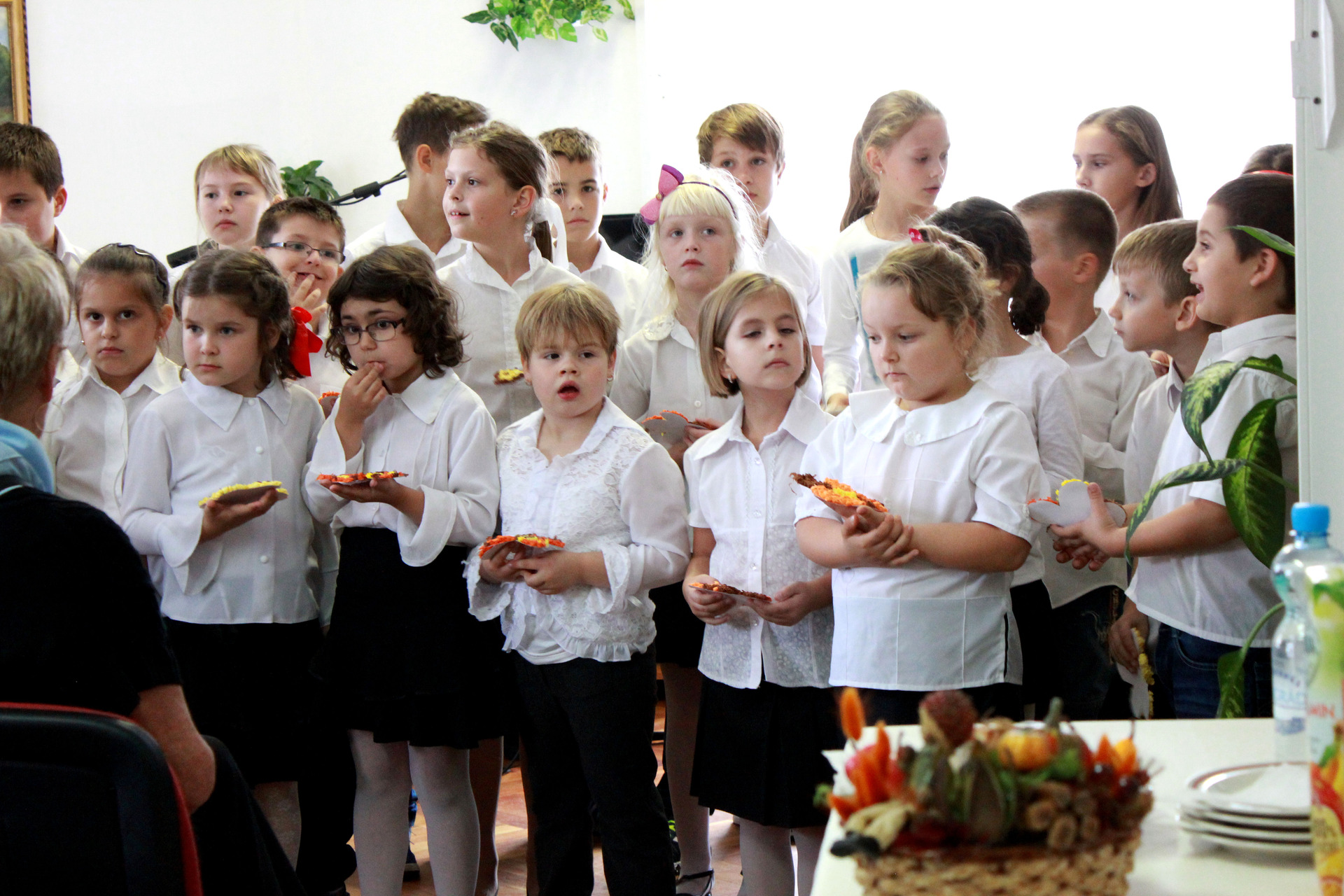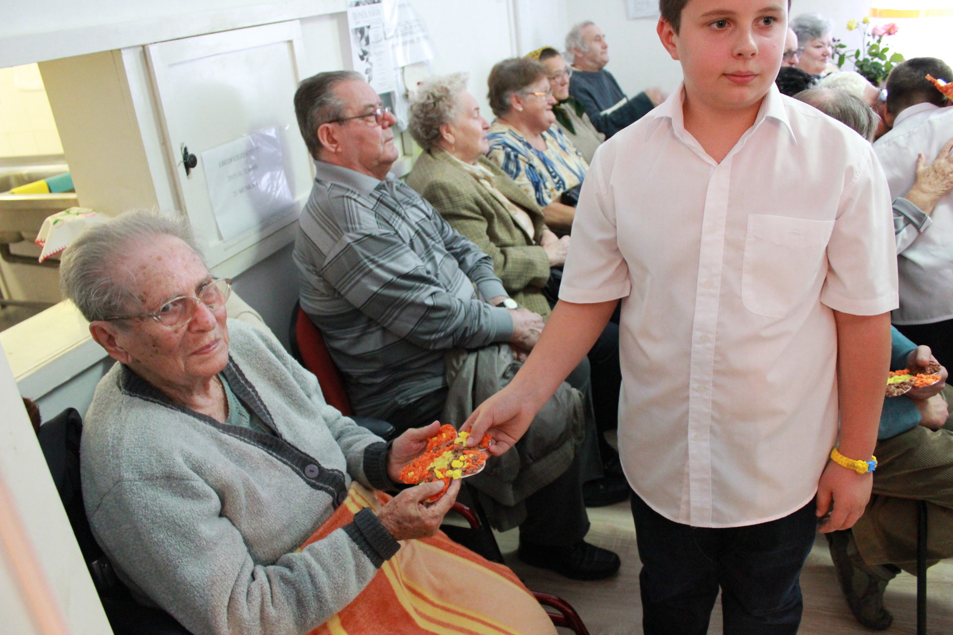 A rendezvényen elsőként a Dürer Albert általános iskola tanulói léptek fel, akik versekkel és zenével köszöntötték idős nézőiket, és műsoruk végén egy-egy saját maguk által készített színes őszi papírvirágot is átadtak a vendégeknek.