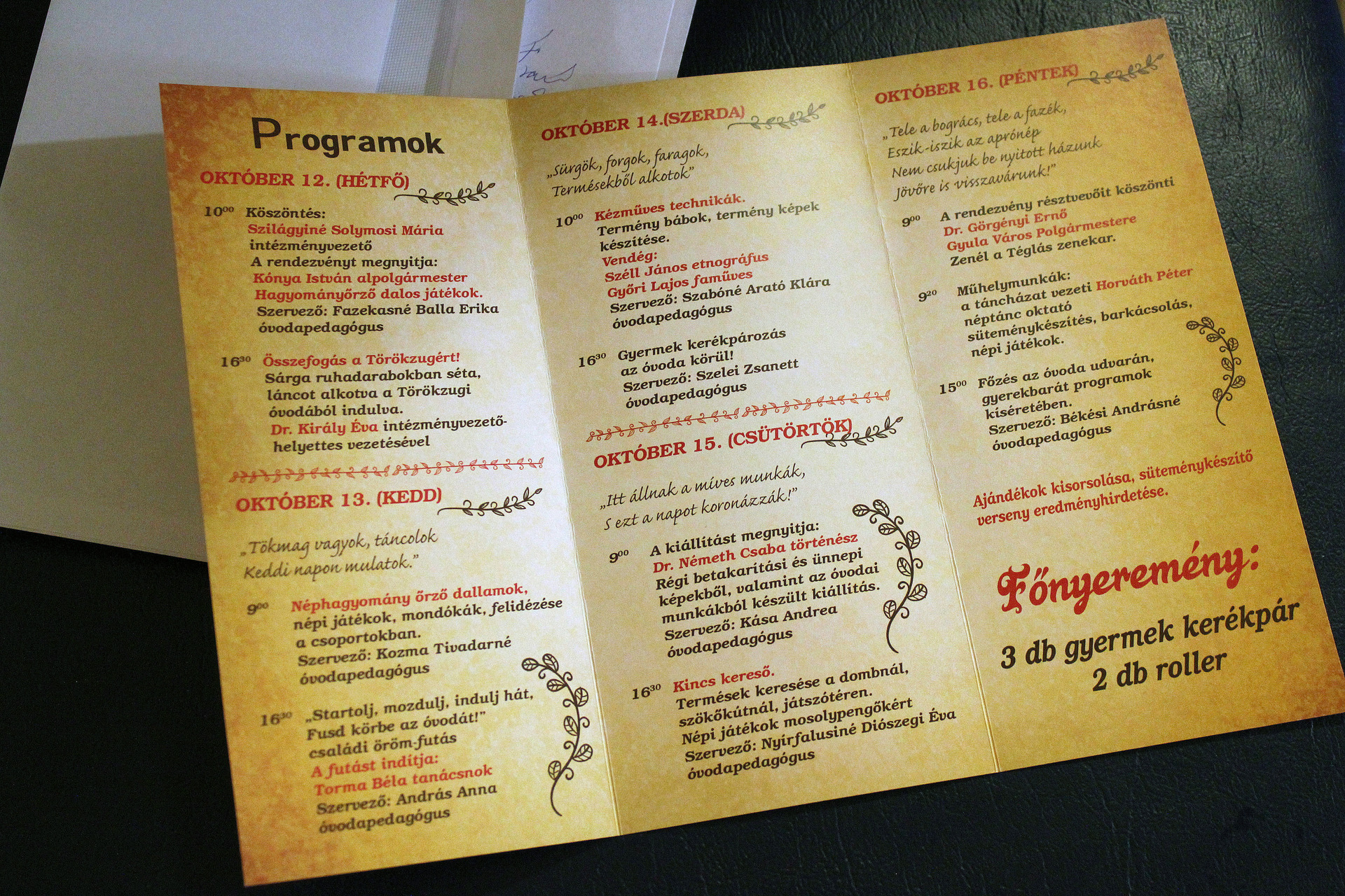A heti programkínálat hétfőn délután egy „sárga ruhás sétával” folytatódik, amit másnap reggel népi játékok és „családi örömfutás” követ az óvoda épülete körül. Szerdán új kézműves technikákkal ismerkedhetnek meg a gyerekek, majd kerékpározni indulnak. Csütörtökön régi betakarítási képekből és az óvodai munkákból lesz kiállítás, 16 órától pedig kincskeresés lesz a családi program. A pénteki napon a Téglás zenekar zenél, emellett táncház, süteménykészítés és főzés várja a rendezvényre látogatókat. A heti móka legaktívabb apróságai között a rendezvény zárónapján három gyermekkerékpárt és két rollert sorsolnak majd ki a szervezők.