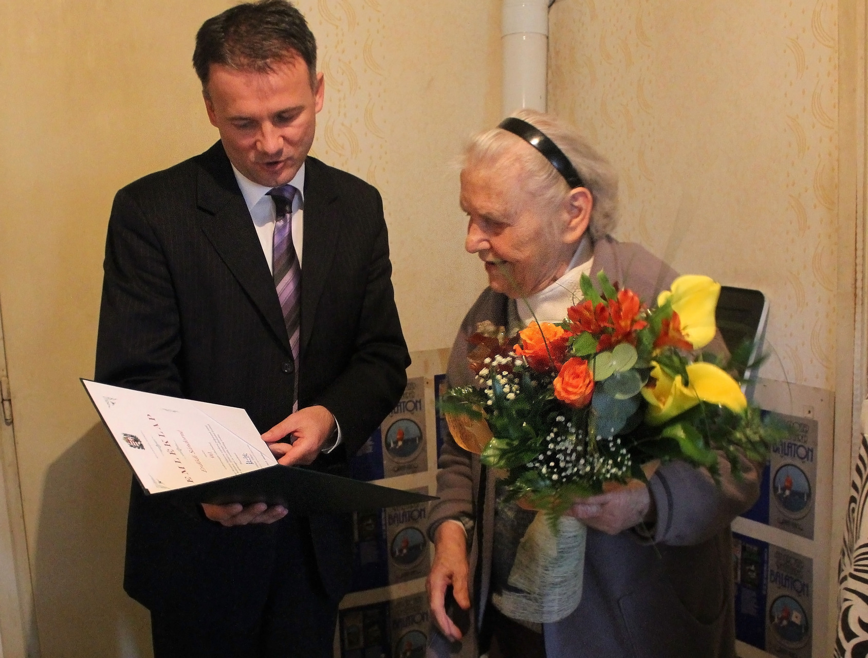 Erdődi Sándornét tortával, virágcsokorral és a miniszterelnök által aláírt emléklappal köszöntötték