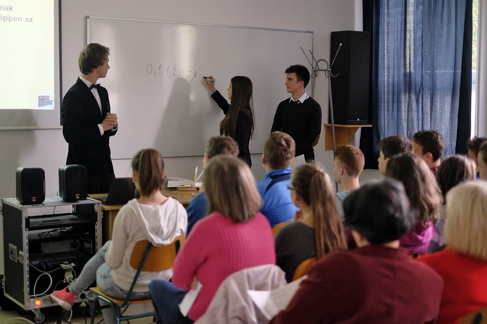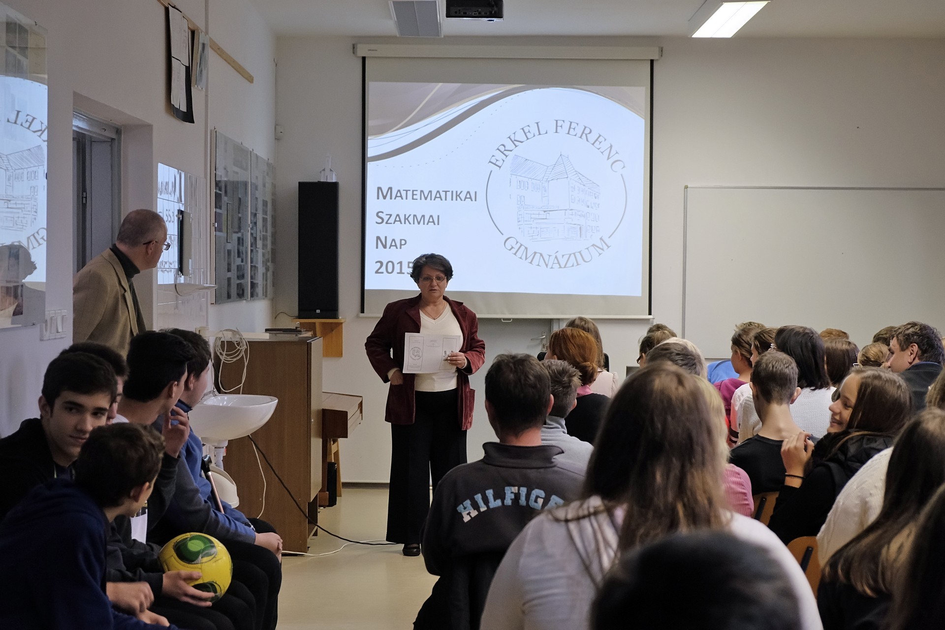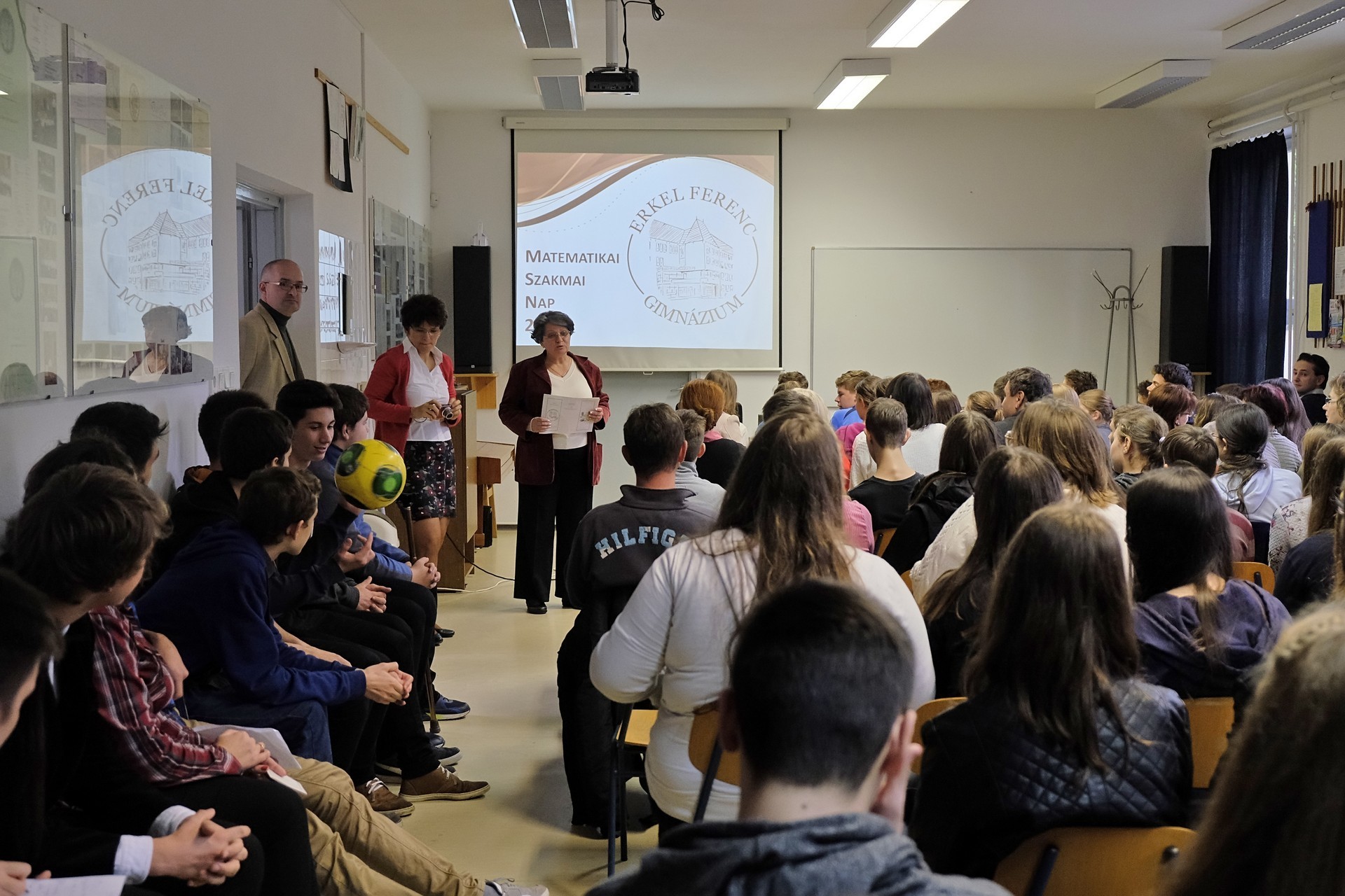 Az Erkel Ferenc Gimnázium első matematikai szakmai napjának első részében az intézmény jó képességű matematika tagozatos tanulói nyolc rövid, ám annál dinamikusabb prezentációban tárták fel az élet számos területén tett matematikai megfigyeléseiket, illetve a tudományágban már meglévő tézisek újra- és továbbgondolt kutatásaik során szerzett tapasztalataikat.