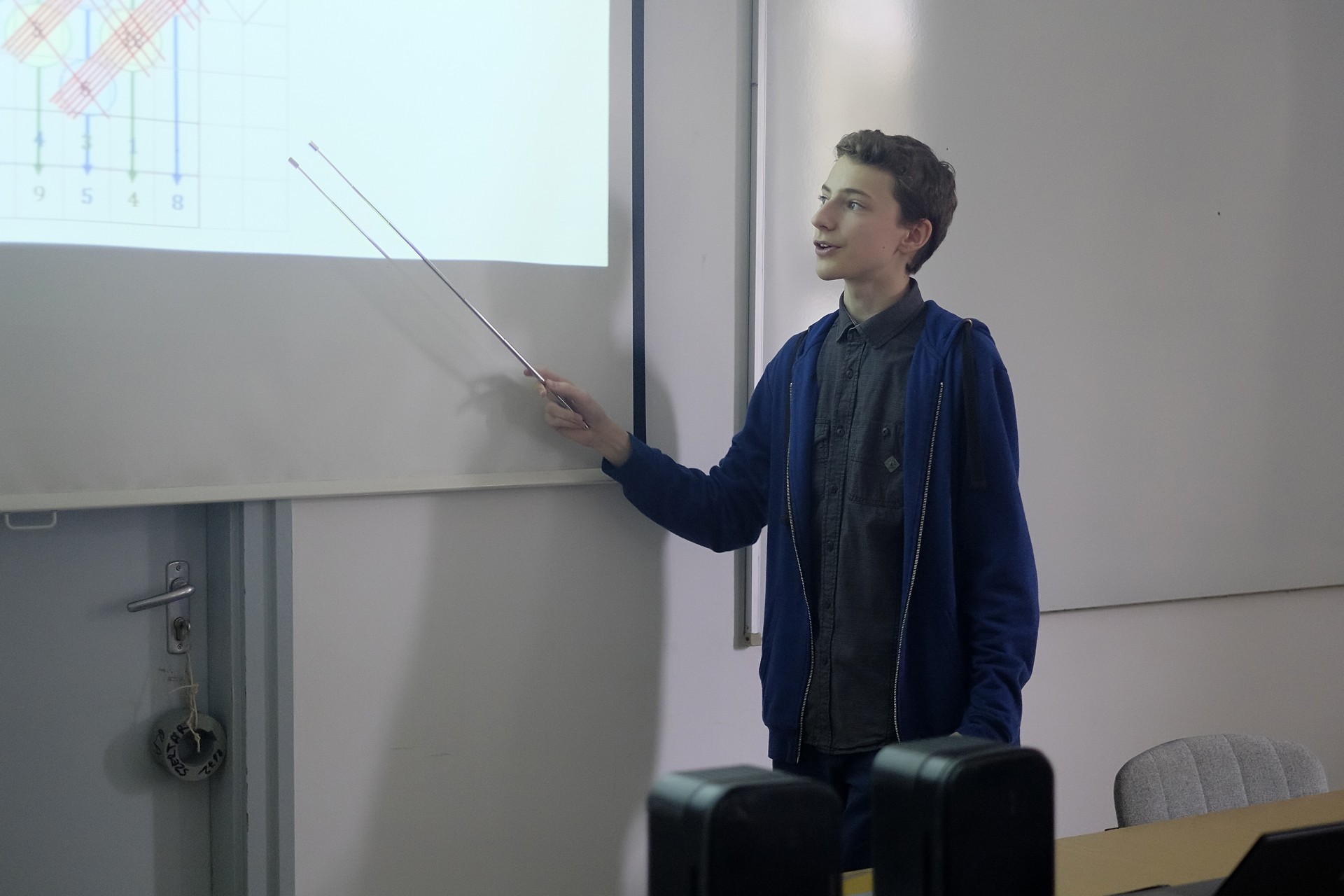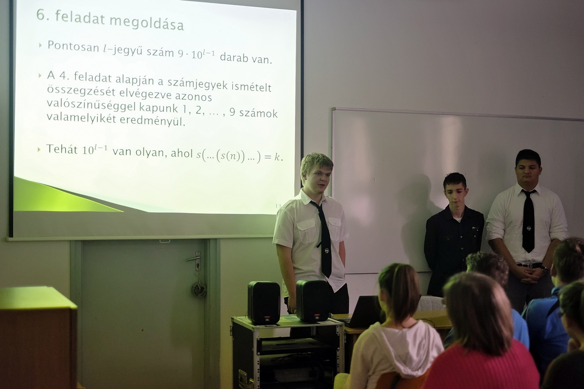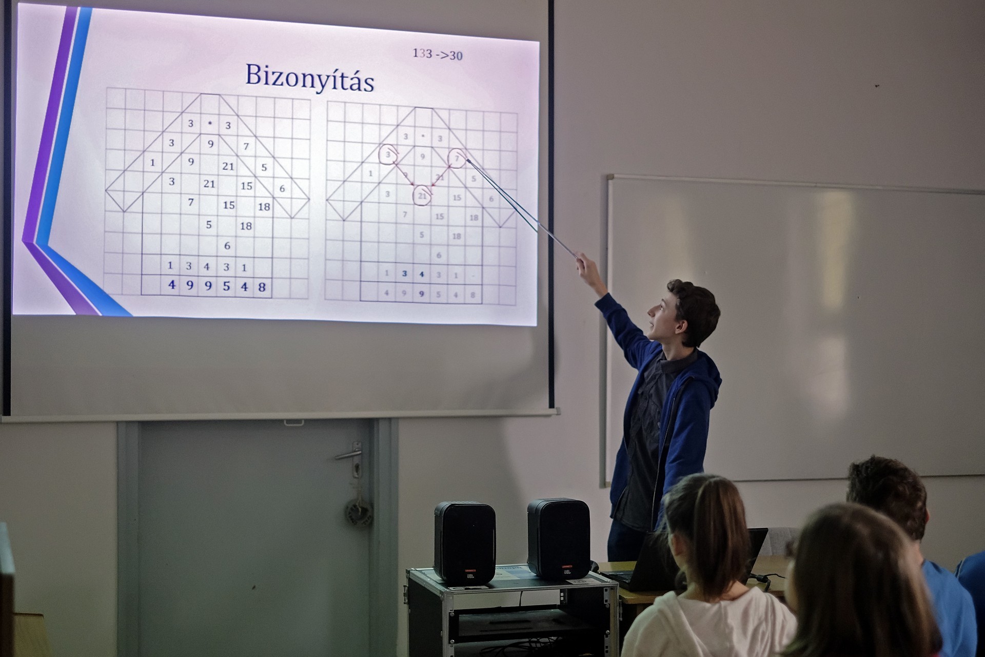 Szó esett a geogebra tudományáról, egy másik tanuló fejszámolási trükköket mutatott be, a blokk zárásaként pedig egy sor humorral telített gyakorlati megmutatkozásban rejlő matematikai példatárt vonultattak fel a tanulók. Őket követően Borbola Gábor, a Szent István Egyetem oktatója tartott előadást, akinek fő kutatási területe a síkbeli goligonok problémakörének általánosítása tetszőleges véges dimenziószámban, számtani sorozattól eltérő oldalhossz sorozattal, illetve derékszögtől eltérő irányokban.