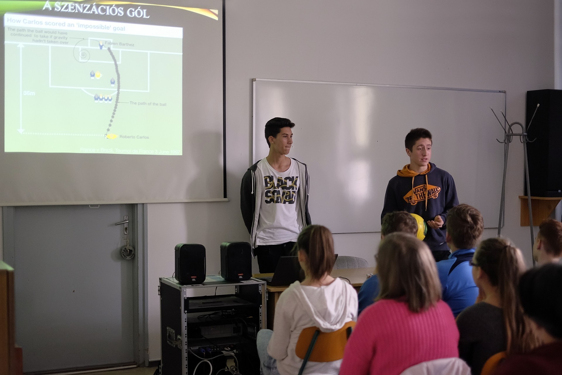 Arra pedig, hogy a matematikusok nem csak csapott vállú, szemüveges filoszok lehetnek, a 10 éve focizó páros, Sebestyén János és Juhász Norbert volt a tökéletes bizonyíték, akik A csodálatos csavar címet viselő előadásukban annak a 13 évvel ezelőtti, fizika törvényeit megcáfoló gólnak eredtek a nyomába, aminek rúgásával Roberto Carlos futballtörténelmet írt. Maga az emlékezetes attrakció azonban egy átmeneti technikai baki okán sajnos nem volt látható, de nagyon profi megoldással, amíg egyikük az akadály elhárításán ügyködött, a duó másik tagja szellemes információáradattal tartotta szóval a közönséget. Az előadásra vonatkozóan elmondta: „Ez nem hasznos, csak érdekes”, hiszen a jól sikerült rúgás eredményeként Magnus-hatás jött létre és a labda a gravitációtól eltekintve haladt.