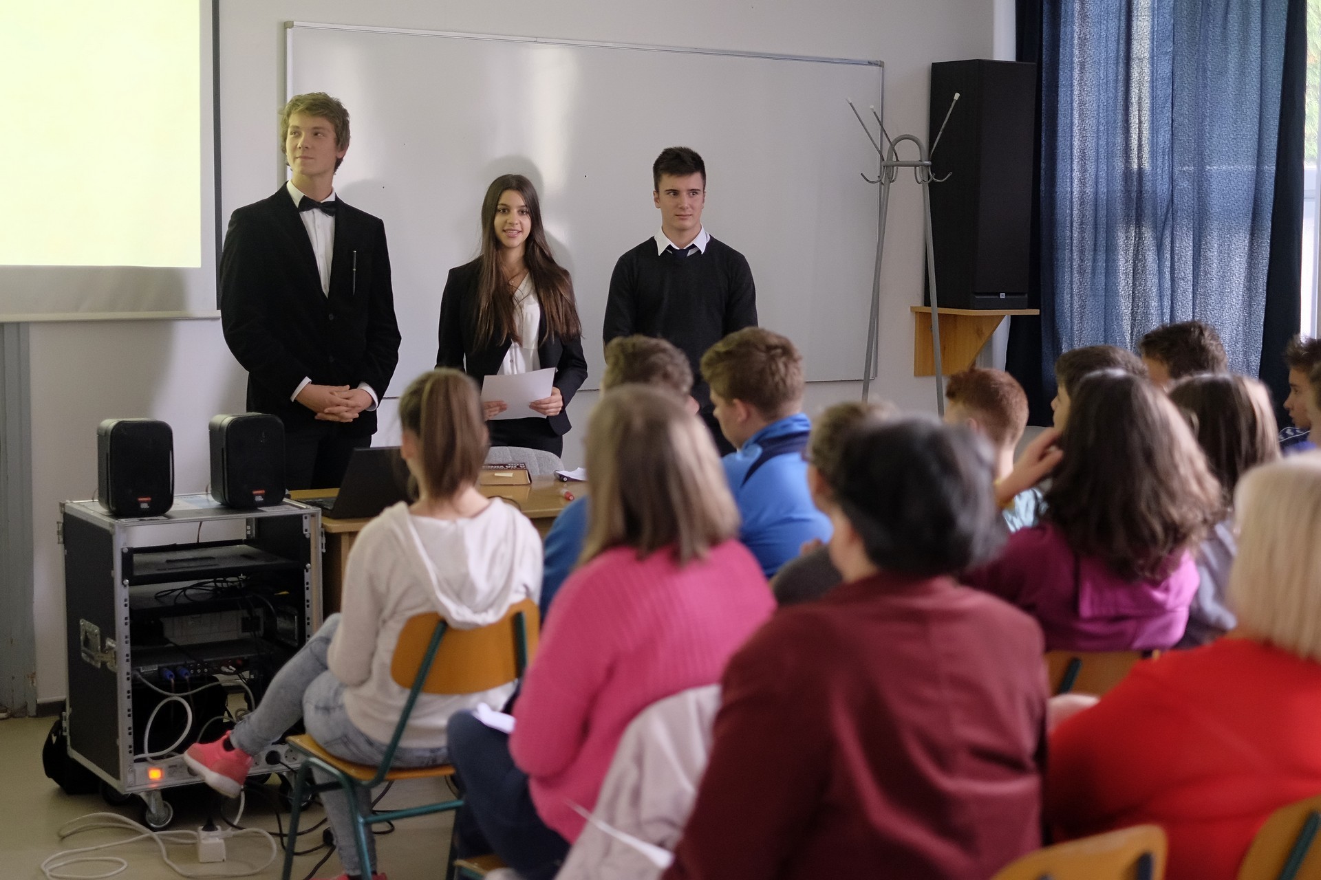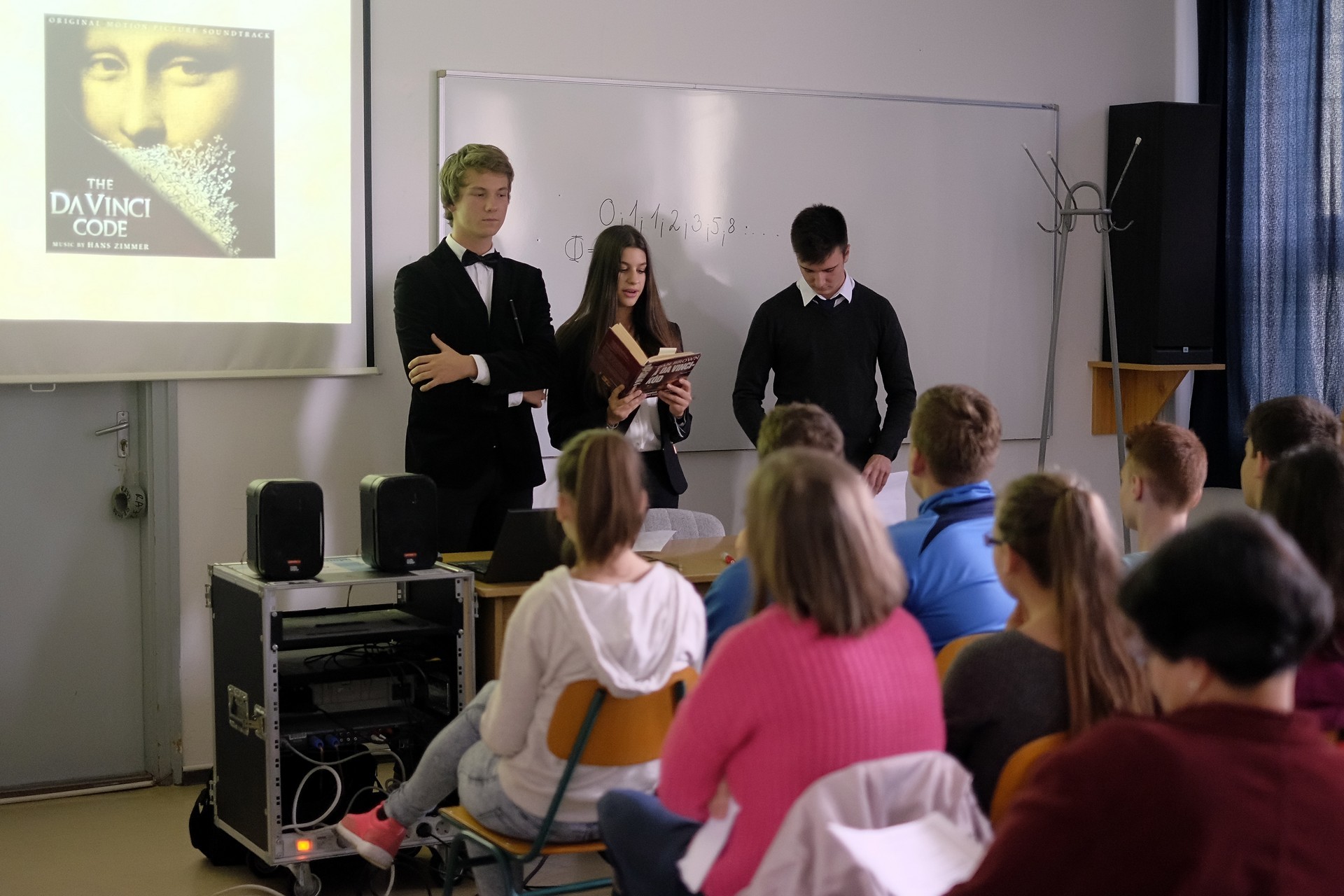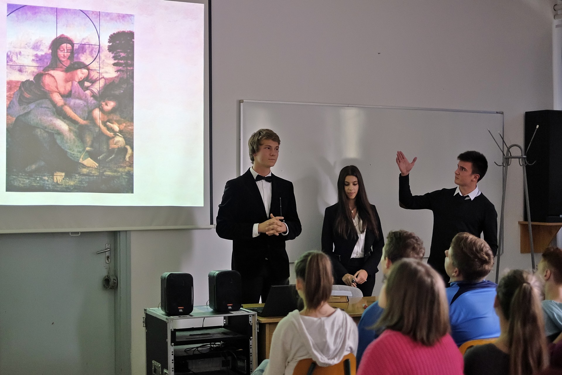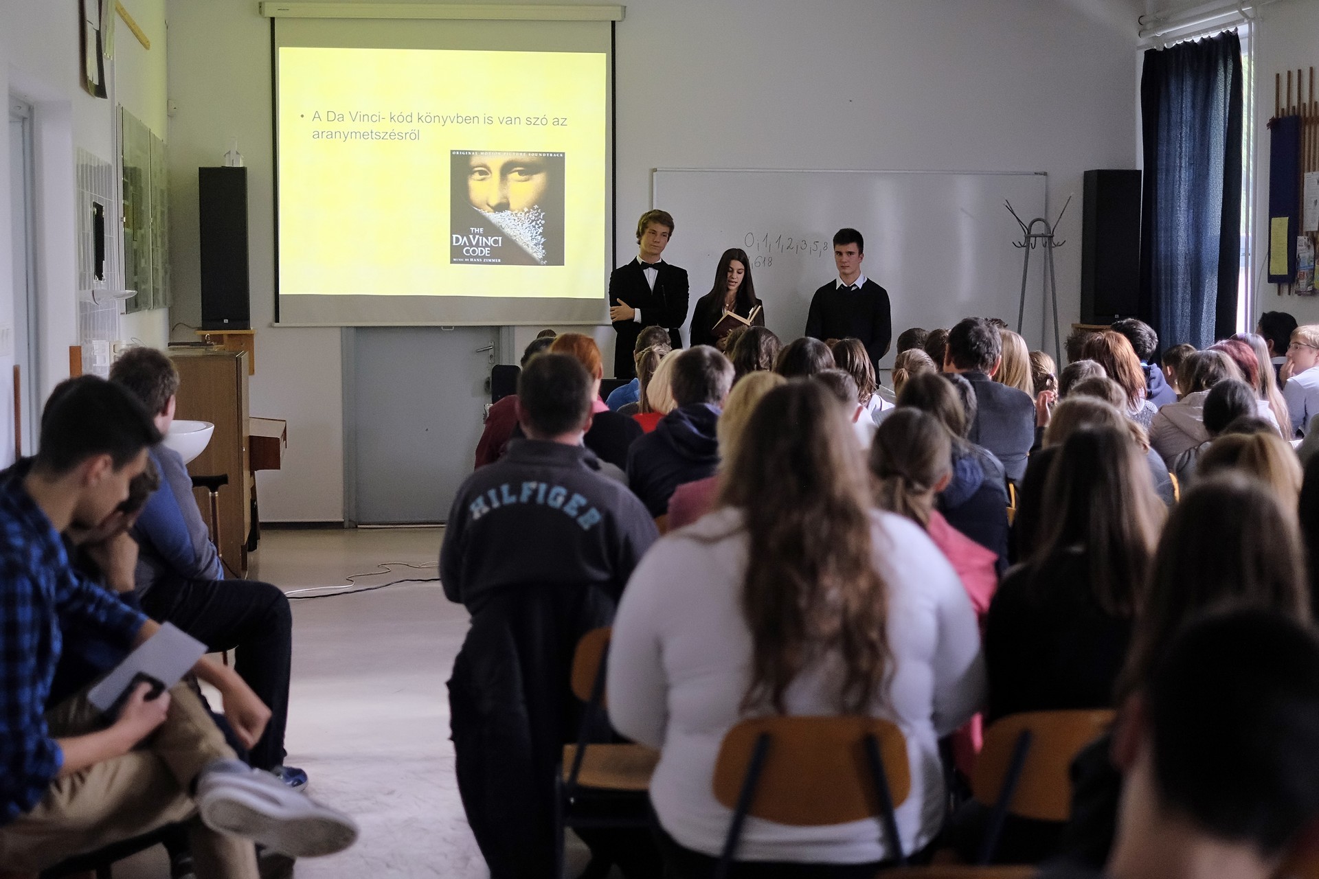 A futball-labdával érkező, előadásukat könnyedén megtartó fiúkat a 11/B. osztály annál elegánsabb három tanulója váltotta, akik kellő komolysággal az Aranymetszés misztikumába avatták be a jelenlévőket. Az ünnepélyes felvezető, csakúgy mint a csokornyakkendő a téma komolysága iránt érzett tisztelet és a prezentáció része volt. Előadásukból kiderült, hogy aranymetszés a zenében, az építészetben, a képzőművészetben éppúgy felfedezhető, mint az emberi testben. Példaként elmondták, hogy a Mona Lisa készítésénél Da Vinci szándékosan alkalmazott matematikai módszereket, majd a természetben fellelhető aranymetszéseket egy videó lejátszásával illusztrálták.
