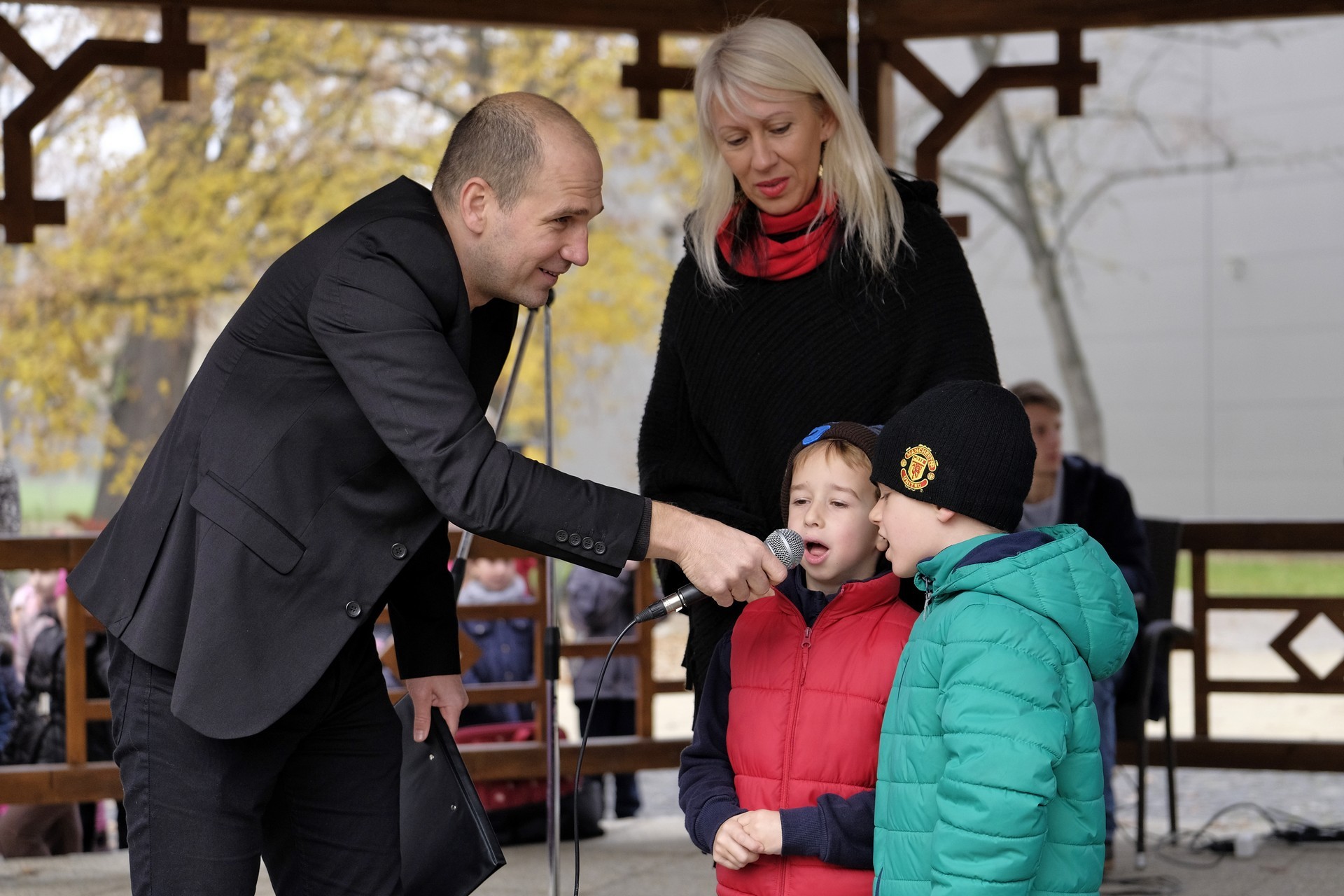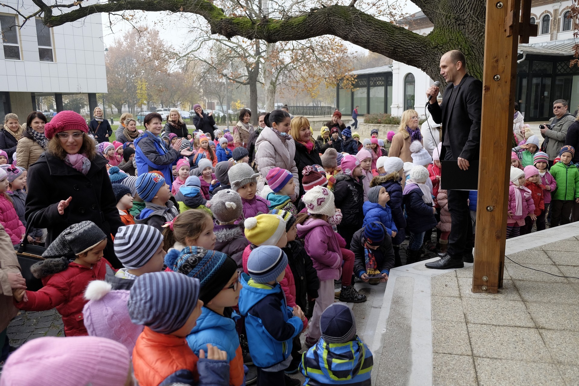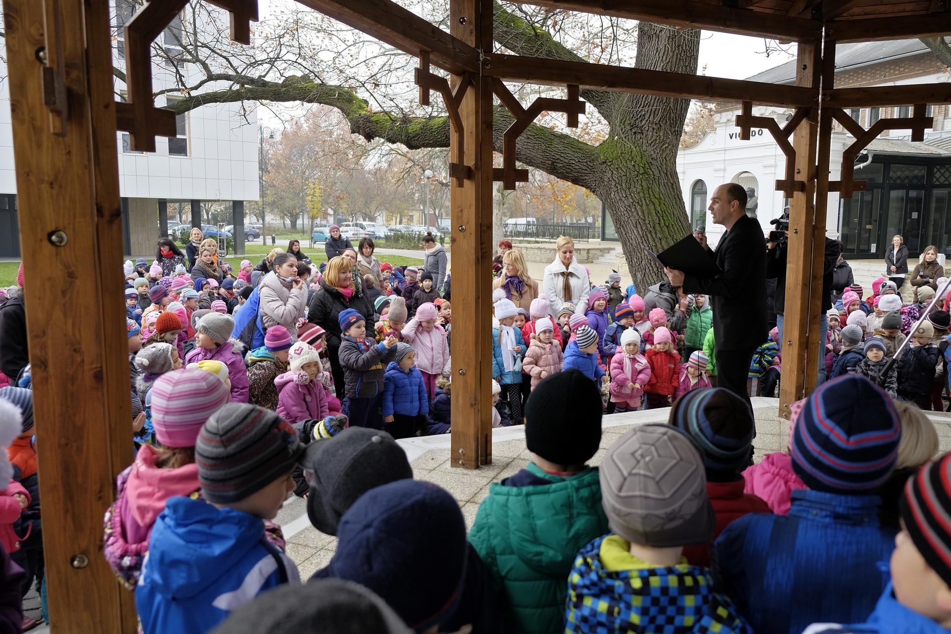 A Göndöcs-kertben megrendezett csoportos szavaláson az óvodások még percekkel a kezdés előtt is lelkesen gyakorolták a verseiket. A költeményt végül Beszterczey Attila gyulai színművésszel közösen adták elő a Vigadó melletti zenepavilonban és környékén.
