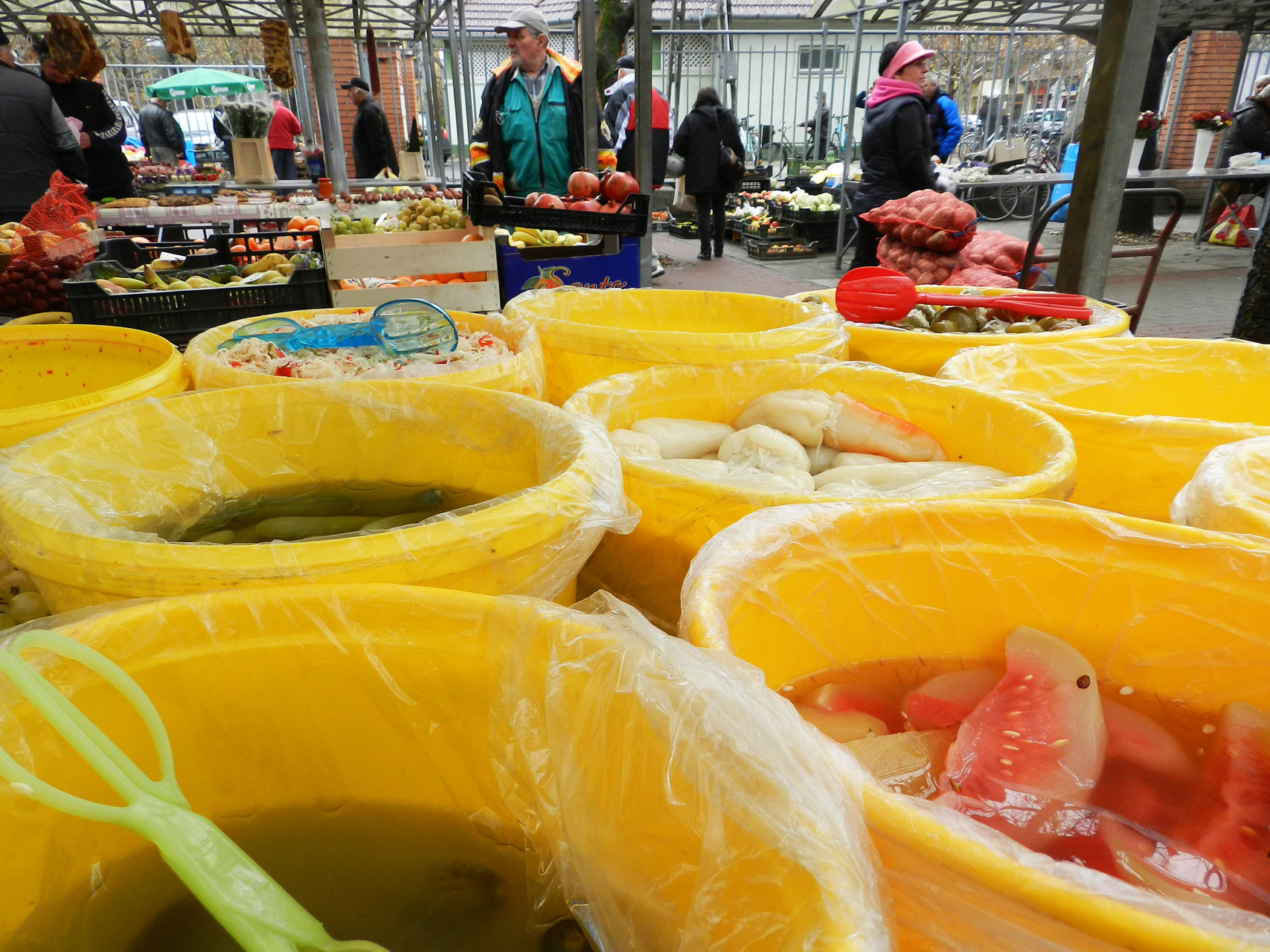 A választék idén is széles: savanyú káposztát, vegyes vágottat, ecetes uborkát és hegyes erős paprikát, céklát, dinnyét, almapaprikát és töltött paprikát is kínáltak az elárusítóasztaloknál.