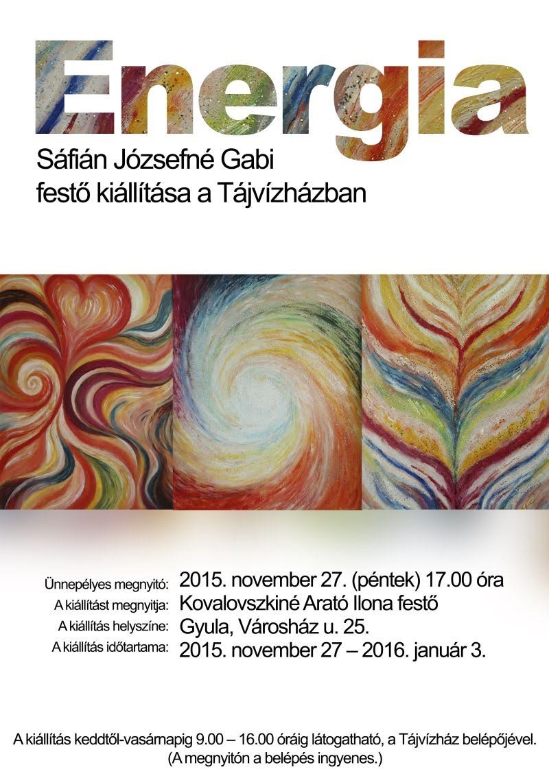 Energia címmel mutatja be munkáit Sáfián Józsefné festő a gyulai Tájvízházban. A tárlatot november 27-én, pénteken 17 órakor Kovalovszkiné Arató Ilona nyitja meg. A kiállítás január 3-ig látogatható a Körös-vidéki Vízügyi Igazgatóság bemutatóházában (Városház utca 25.) keddtől vasárnapig 9–16 óráig.