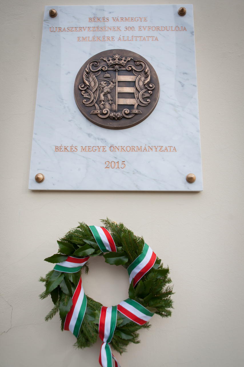 Az újraszervezés „fizikális” nyoma az a Bánfi Gábor szobrász-restaurátor által készített emléktábla, amit a megyeháza falán dr. Turi-Kovács Béla országgyűlési képviselő, az Országgyűlés korelnöke és Zalai Mihály, a megyei önkormányzat elnöke avatott fel. Az ünneplők ezután Békésen, a Kecskeméti Gábor Kulturális Központban vettek részt egy kiállítás megnyitóján. A tárlatot korábban a Munkácsy Mihály Múzeumban már láthatták az érdeklődők. „A Szent Koronába visszakebelezett Békés megye török utáni helyreállításának háromszázadik évfordulója” alkalmából összeállított kiállítást az ünnepség alkalmából költöztették ideiglenesen Békésre.