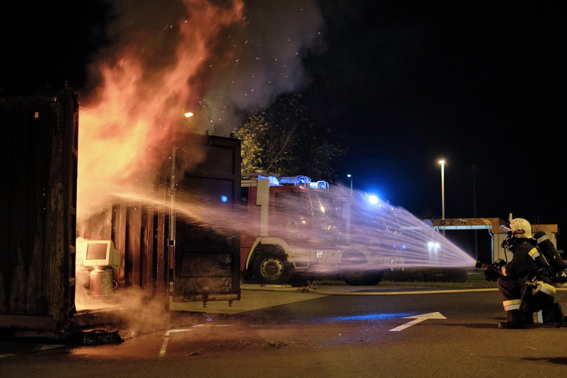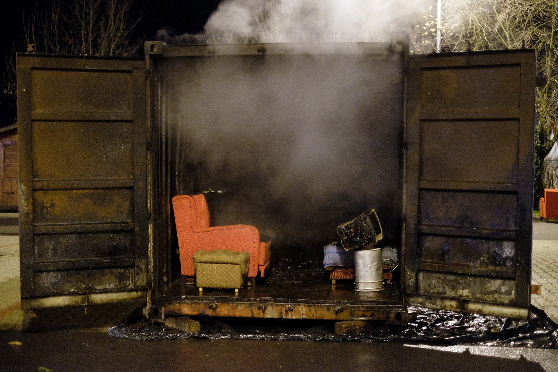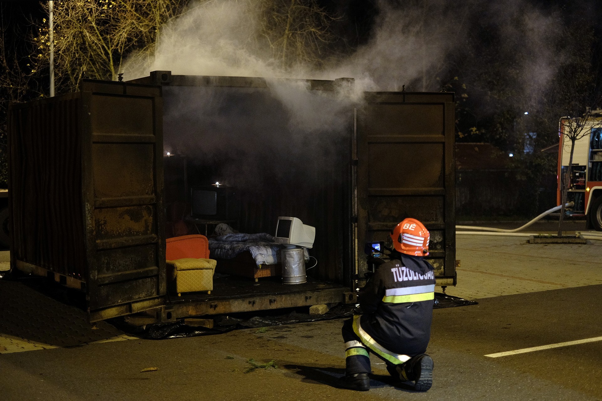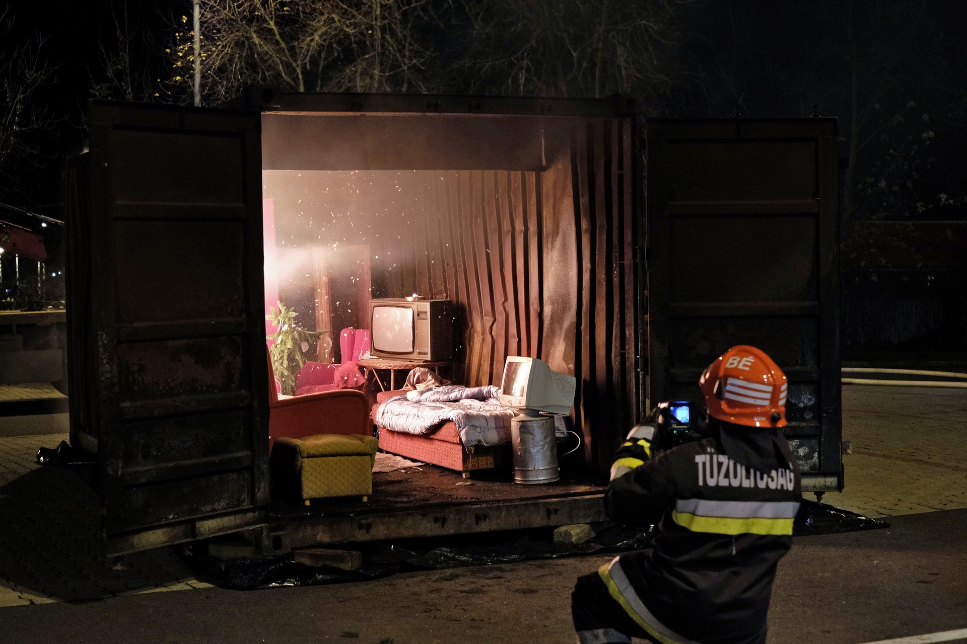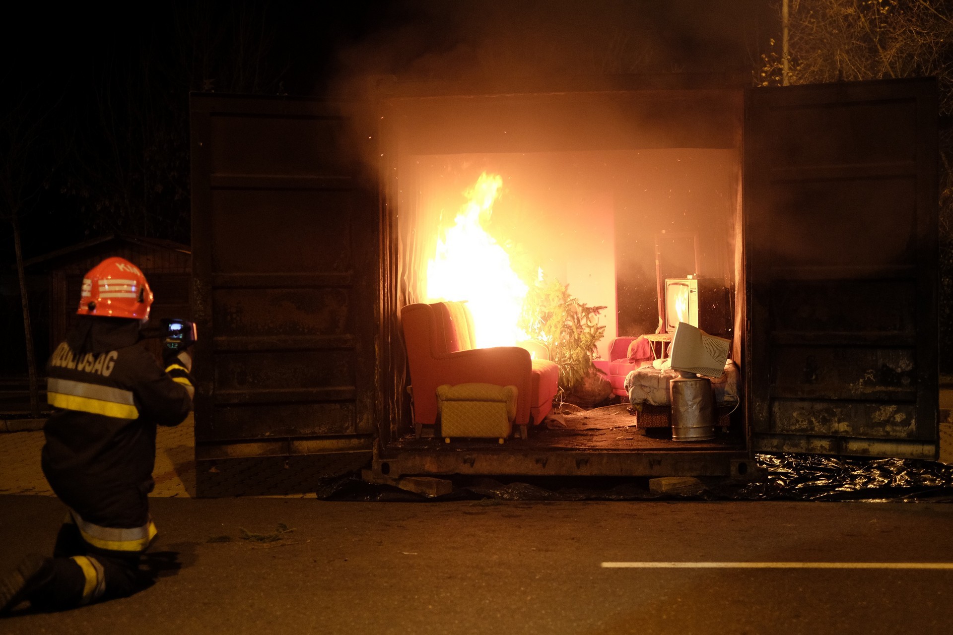 tűzszimuláció gyulán. A konténerben berendezett nappali percek alatt lángra kapott