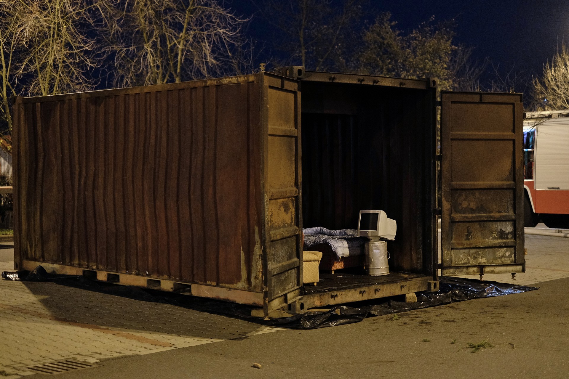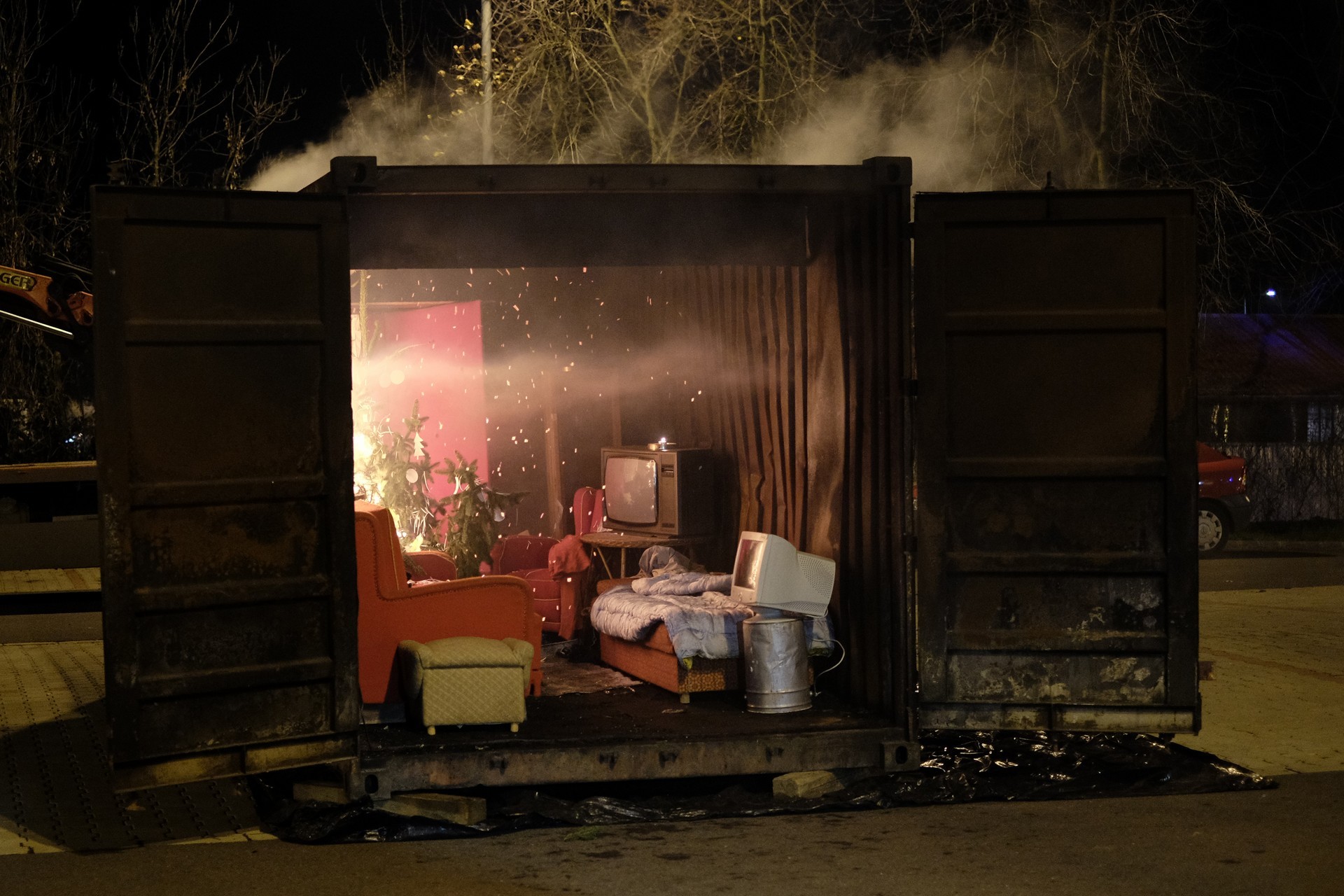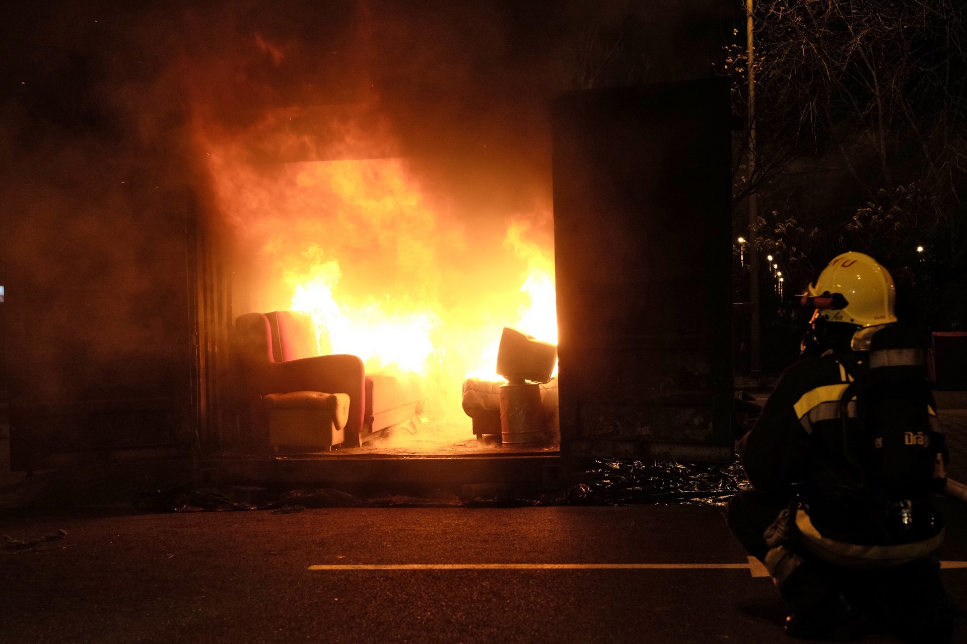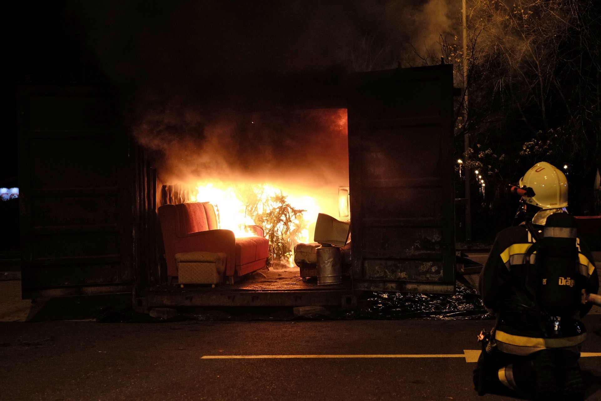 tűzszimuláció gyulán. A konténerben berendezett nappali percek alatt lángra kapott