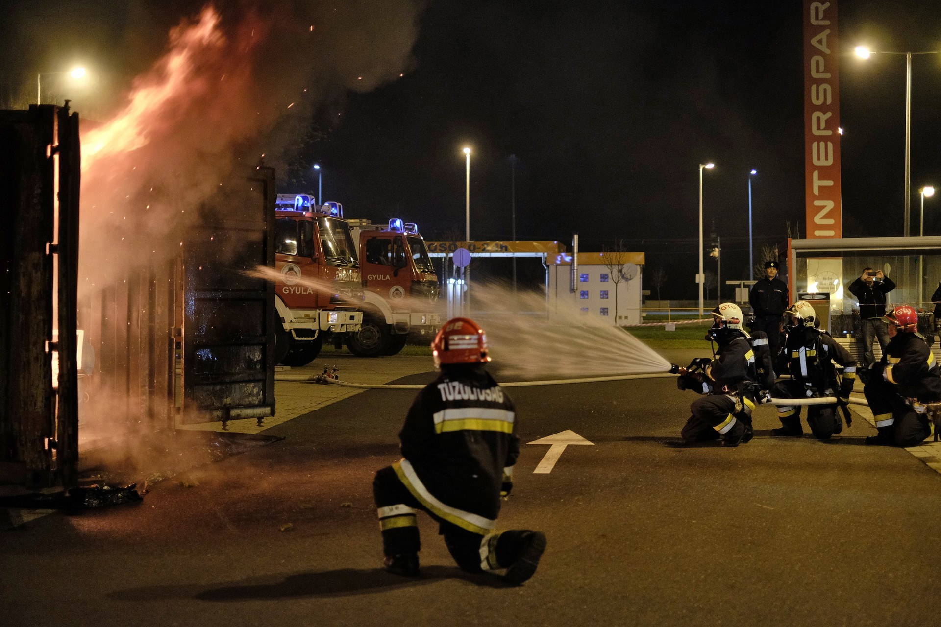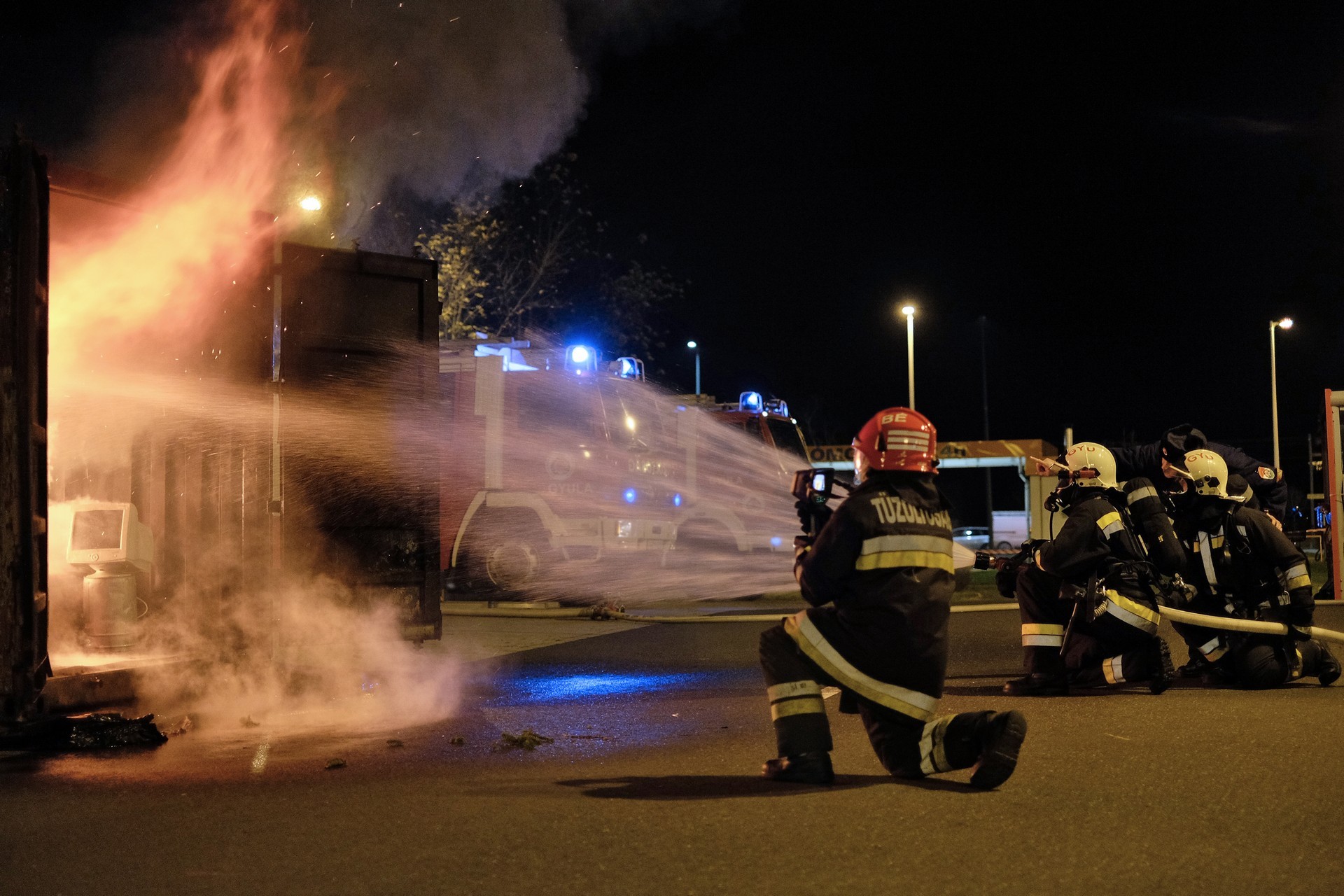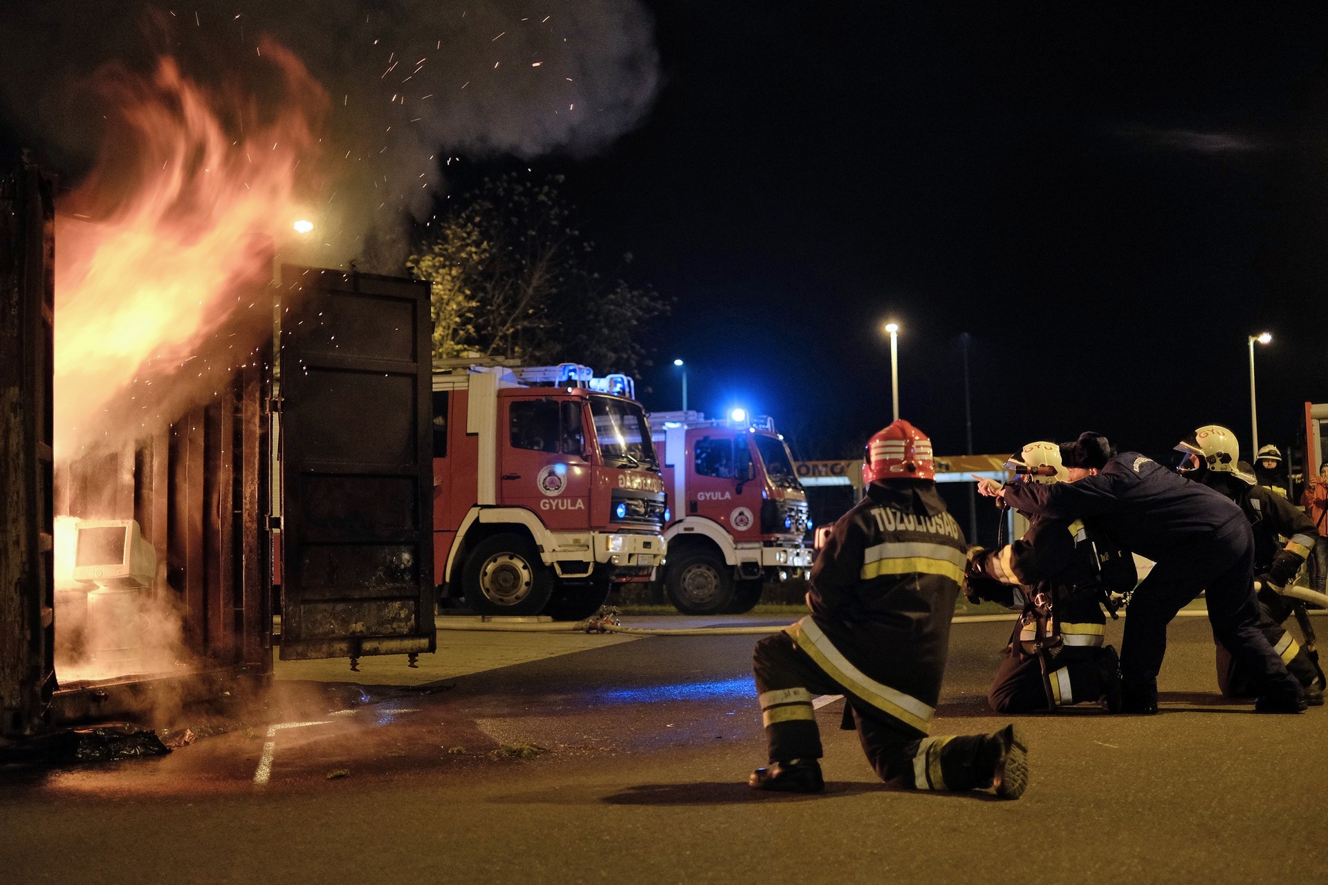 A látványos bemutató alatt azt is megtudhattuk, hogy a bemutató szobában a tűz kialakulásának egyes fázisaiban milyen magas volt a hőmérséklet. Így kiderült, hogy a tűz belobbanásakor 1000 Celsius-fokot is mértek a szakemberek a konténerben. A lángokban álló ál-szobát végül a gyulai tűzoltóság emberei oltották el, szinte másodpercek alatt.