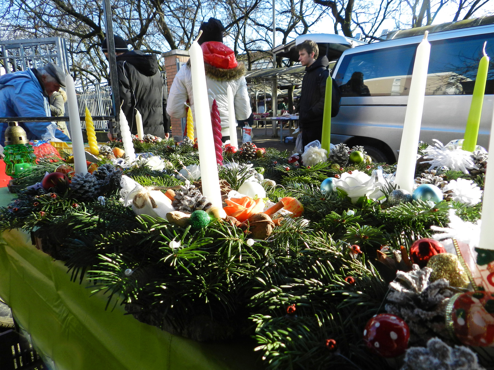 Adventi koszorúkat 1300–2700 forintért találtunk az elárusítóasztaloknál. Asztali díszből többfélét is kínáltak a vásárlóknak, a fenyőalapúak 950–1200 forintba kerültek a mécsessel, míg a nagyobb gyertyával díszített ünnepi tárgyakat 1200–2600 forintért árulták. A kisebb, tobozalapú, kifejezetten temetőbe szánt díszek 400 forintért kaphatók a piacon.