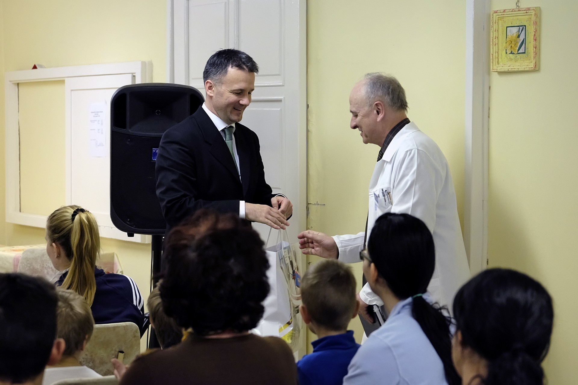 A polgármester az osztályon fekvő mintegy negyven apróságnak egy nagy puttony szaloncukrot is hozott, de a műsor végén kiosztott csomagokban narancsot és almát is kaptak a gyógyulófélben levő gyerekek.