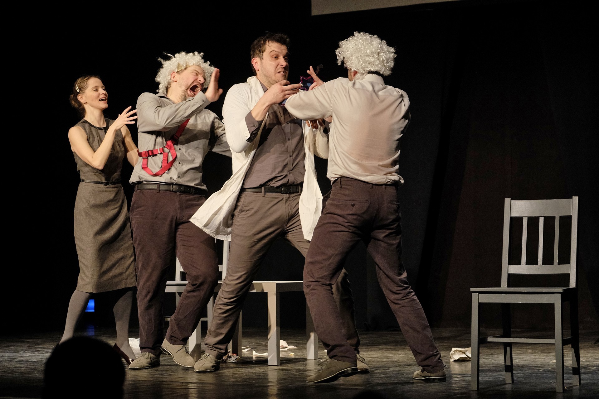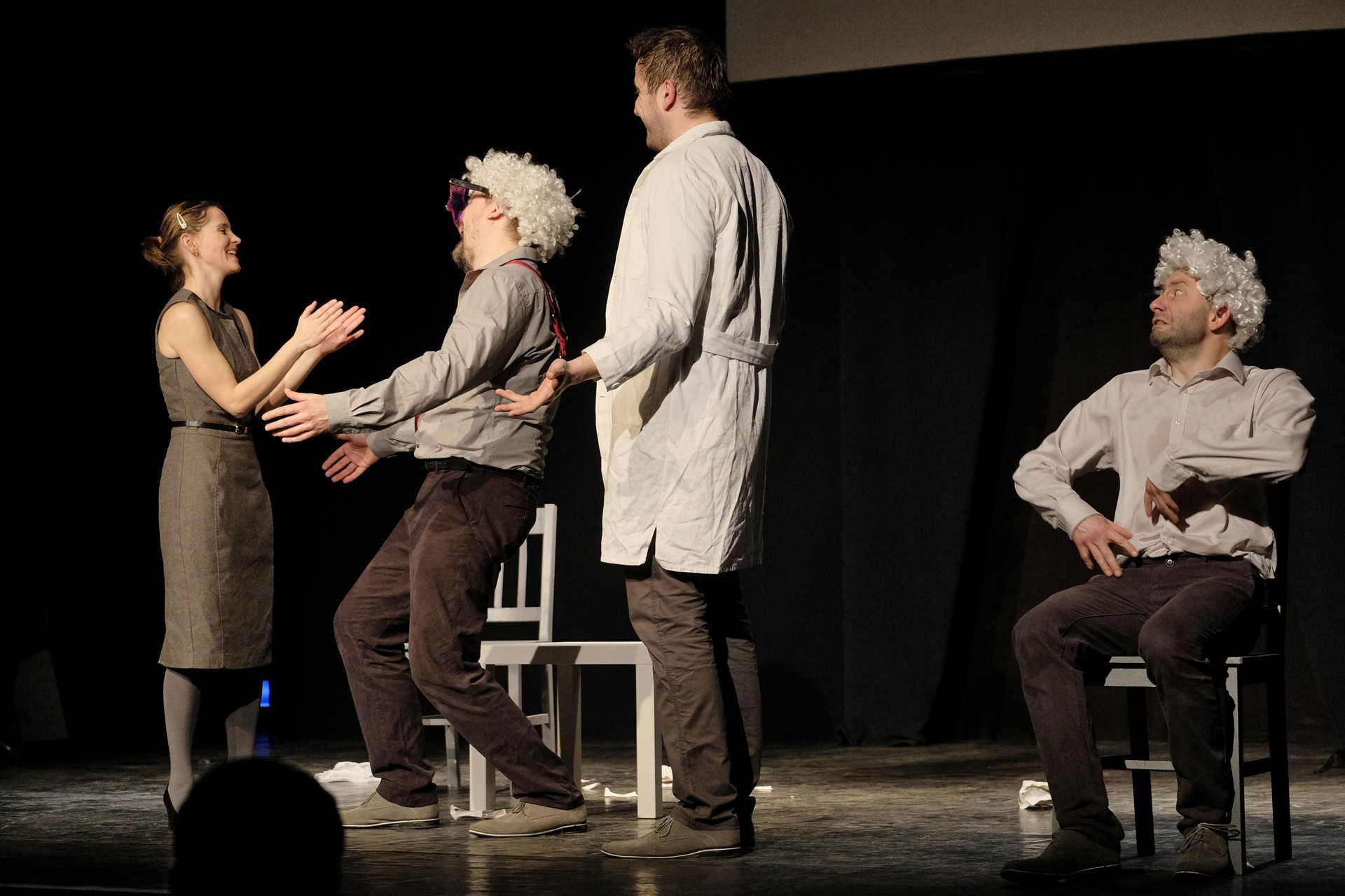 A Stefanovics Angéla Madonna számánál elszálló mikroportja ugyan tönkretette azt a jelenetet, pedig az első nyíltszíni taps helye ott lehetett volna. Illetve bármikor, amikor ez a négy kiváló színész kaméleonszerűen csak átváltozott. A külsejét tekintve 14 évesnek tűnő művésznő, szerepei szerinti kétségbeesett küzdéssel, bámulatosan feszítette abszurddá a helyzeteket, a futballkarrierről álmodó 40-es karakterében Mészáros Béla megejtően sírnivaló volt, míg orvosi megnyilvánulása a vele szemben ülő, kétségbeesett pacienst játszó Keszég Lászlóval együtt adott bizonyságot a színészi játék tökéletességéről. A legerősebb – végletekig feszített – jelenet a gyerekként Bánki Gergellyel otthon tanuló szülők esetét pedig valamilyen módon már mindenki átélte, így ezen a ponton térdét csapkodva dőlt hétrét a nevetéstől a közönség.