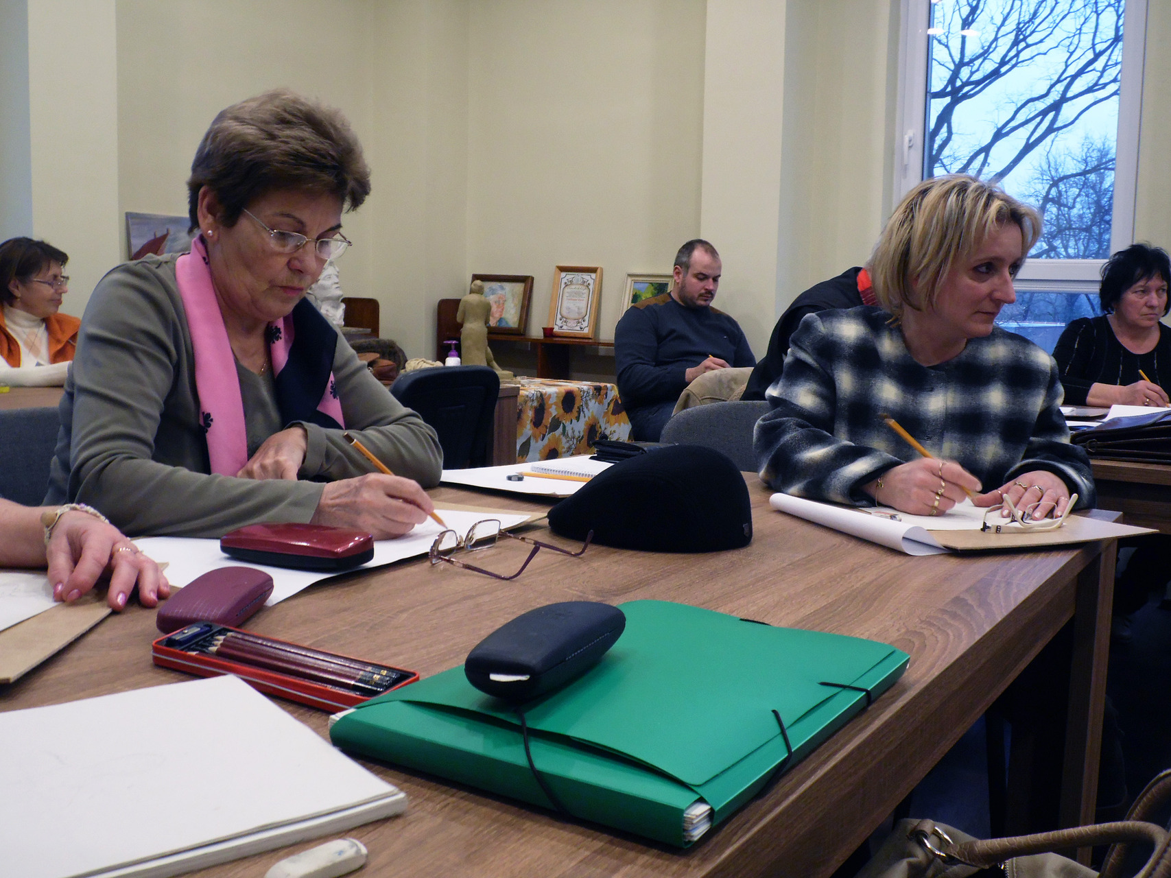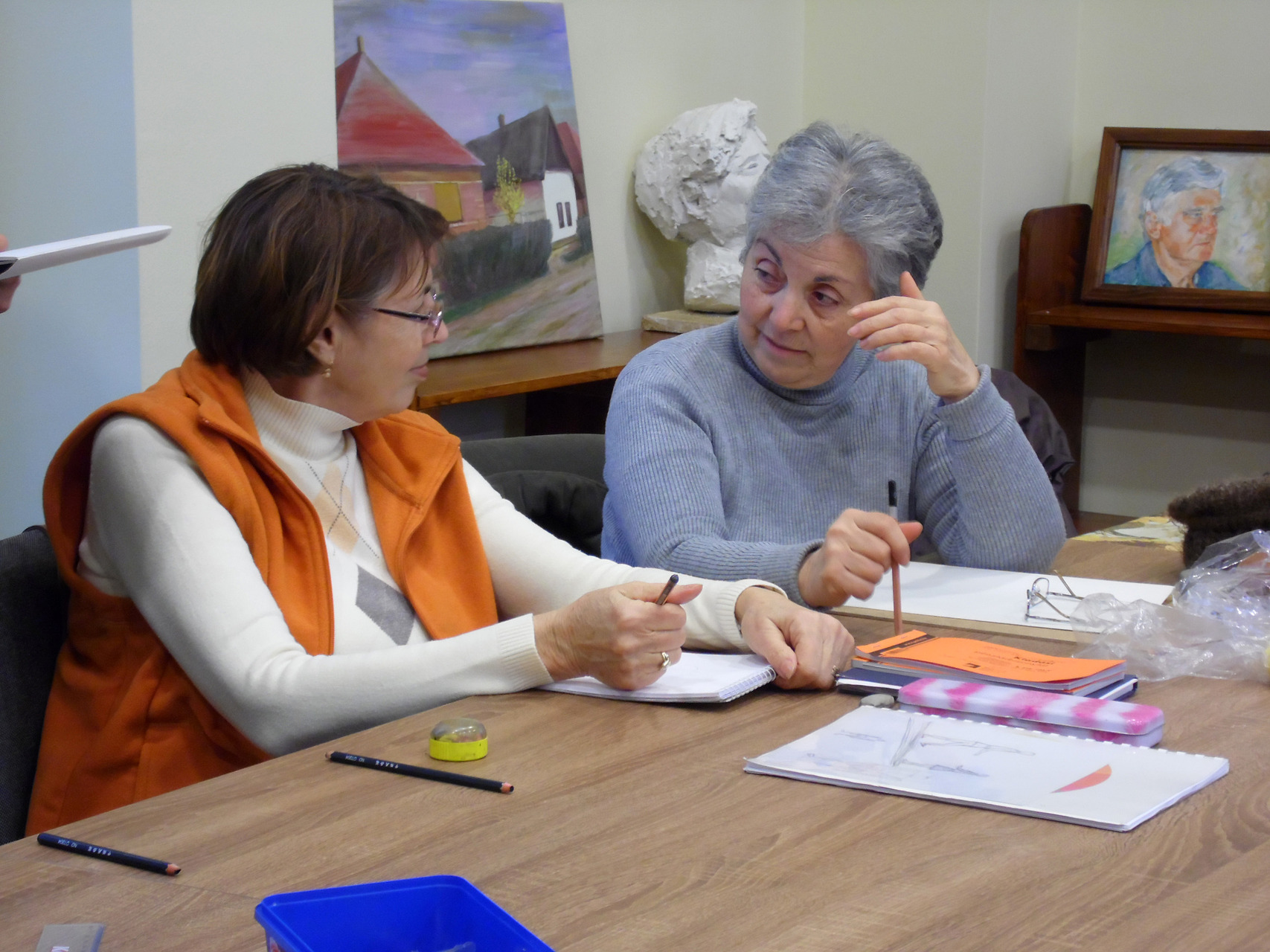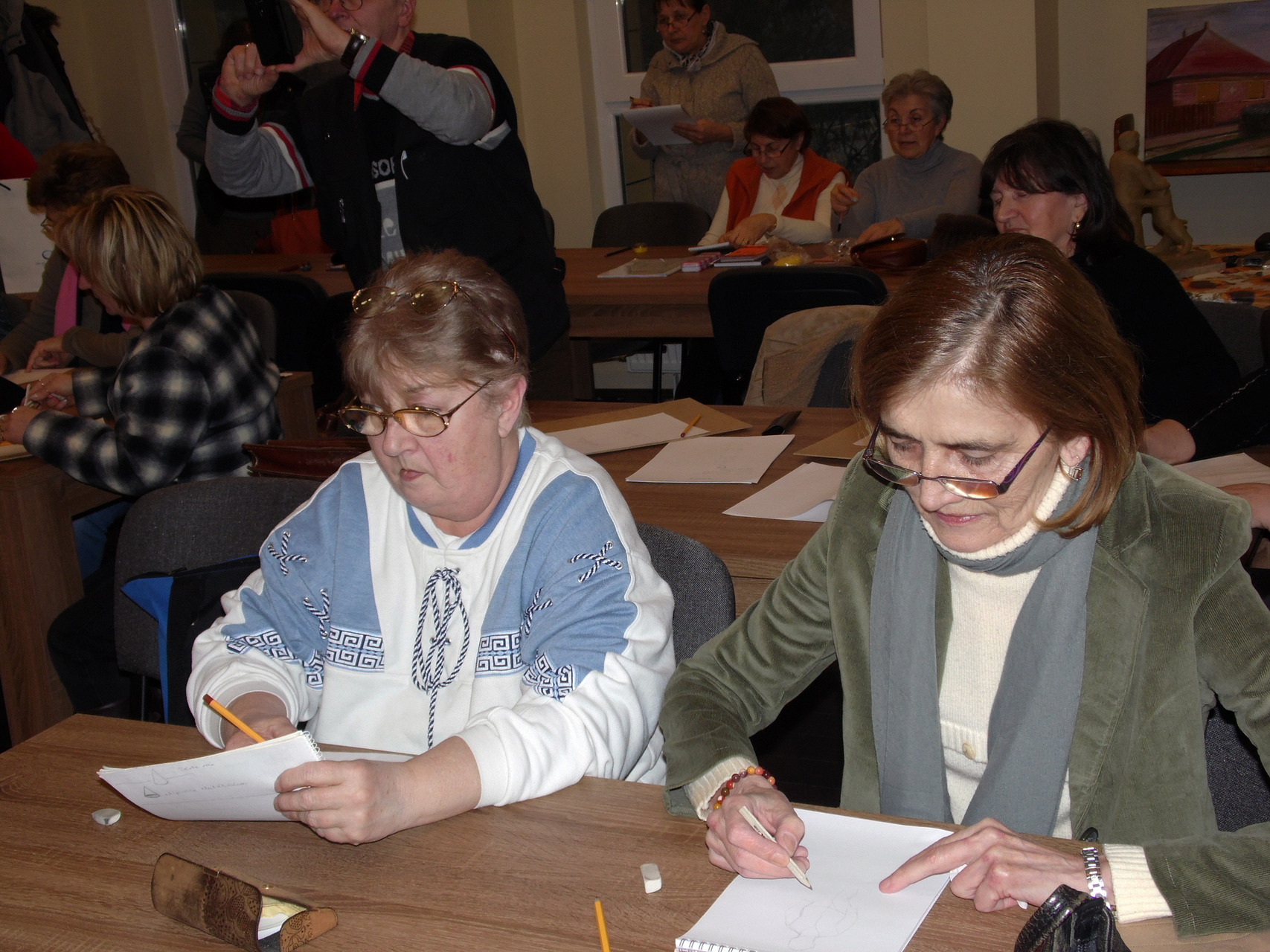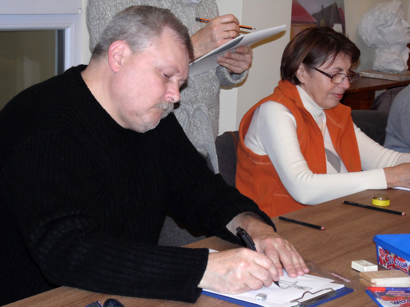 A korábbi foglalkozásokon volt már szó az egyszerűsítésről, a geometriai ábrákról, a tér más-más meghatározásáról, végeztek képelemzéseket, foglalkoztak a perspektívával, ottjártunkkor pedig épp Szőke Sándor szobrász- és képzőművész segítette a résztvevők munkáját. A gyulai alkotóművész két alkalommal is a szabadegyetem vendége volt, először a művészeti anatómiáról tartott előadást, majd a gyakorlatban mutatott rá az alkotók rajzaiban jelentkező hibákra.