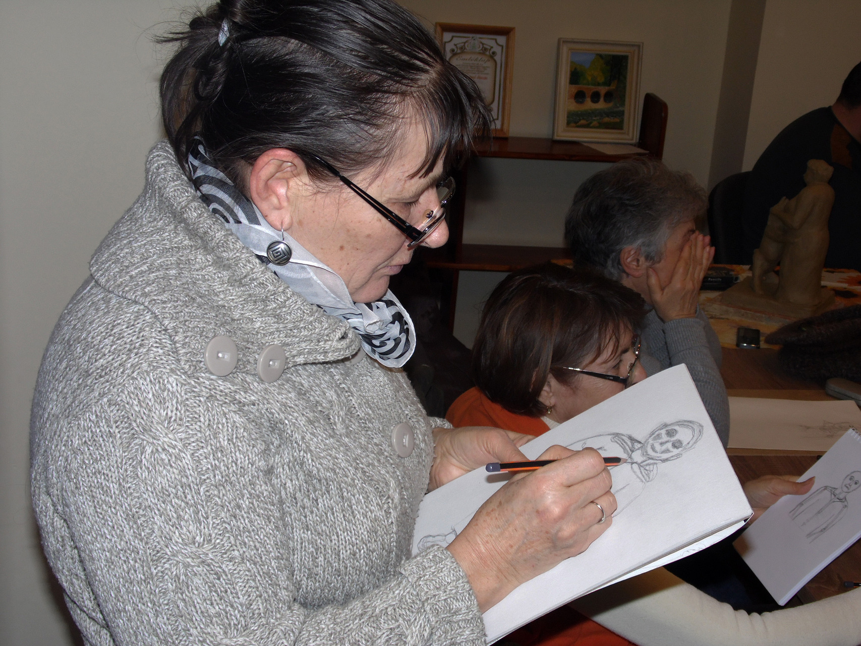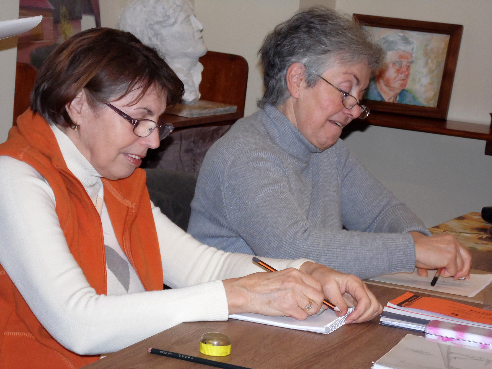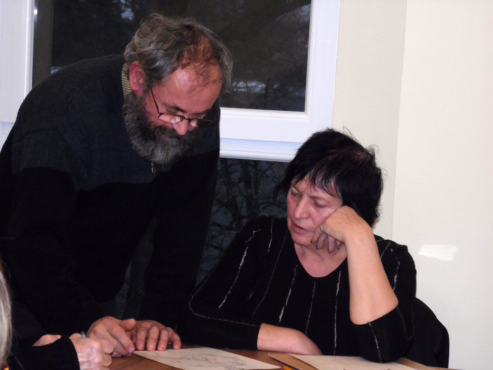 A korábbi foglalkozásokon volt már szó az egyszerűsítésről, a geometriai ábrákról, a tér más-más meghatározásáról, végeztek képelemzéseket, foglalkoztak a perspektívával, ottjártunkkor pedig épp Szőke Sándor szobrász- és képzőművész segítette a résztvevők munkáját. A gyulai alkotóművész két alkalommal is a szabadegyetem vendége volt, először a művészeti anatómiáról tartott előadást, majd a gyakorlatban mutatott rá az alkotók rajzaiban jelentkező hibákra.
