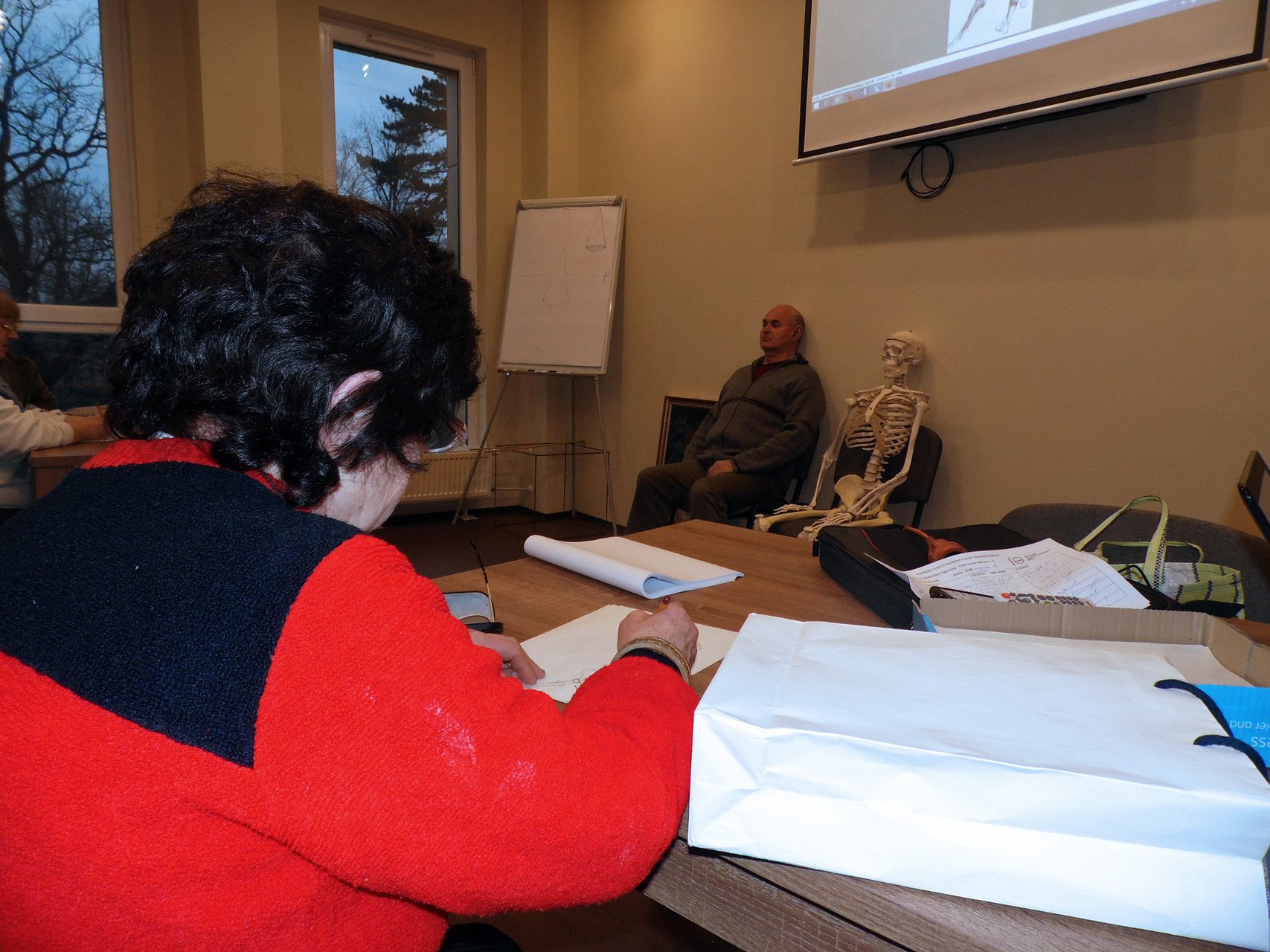– Múlt alkalommal az elméleti foglalkozáson azt fejtegettem, hogy mi az anatómia szerepe a képzőművészetben, illetve példákat hoztam arra vonatkozóan, hogy milyen ábrázolások születtek korábban ezügyben, egészen Leonardoig visszamenően, valamint arra is kitértünk, hogy meddig tanulmány és mikortól emelkedik művészi rangra egy rajz. Olyan ez, mint az autóvezetés – von hétköznapi párhuzamot Szőke Sándor –, fontos egyszer mélyebben megismerni, és később, anélkül, hogy tudatosan alkalmazná az ember, hasznos ismeret marad.
