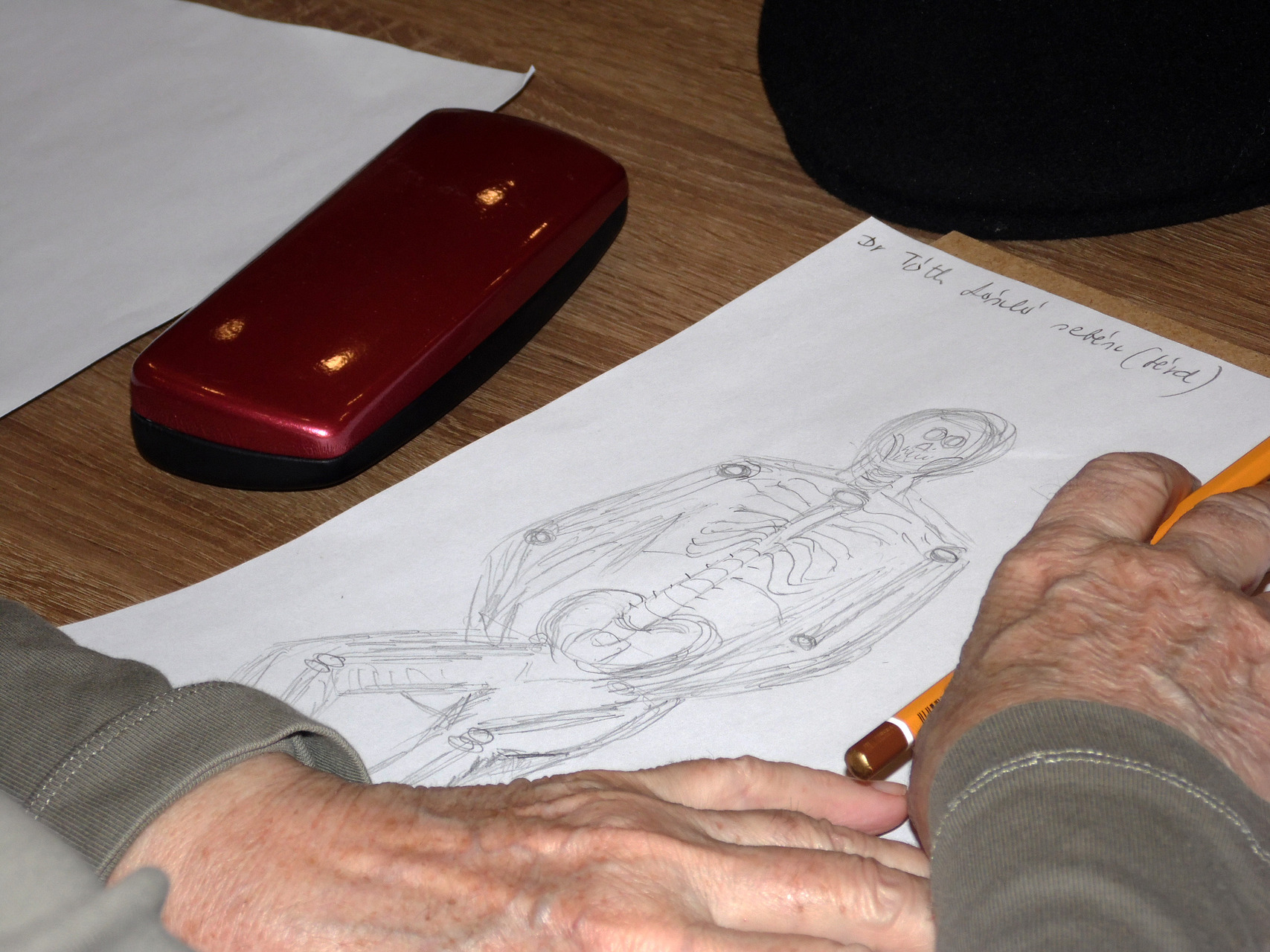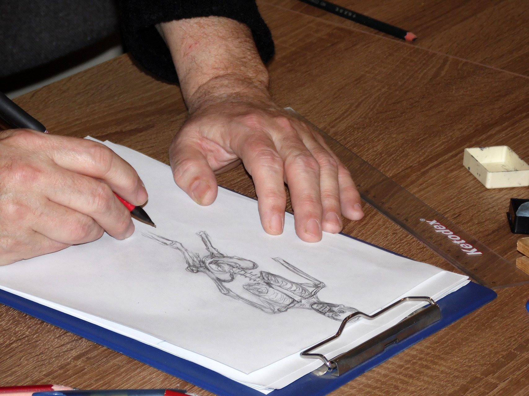 A képzések során a mintegy 30 rendszeresen járó alkotónak egy óra áll rendelkezésére ahhoz, hogy az épp aktuális témát papírra rajzolja. Ebben az esetben a csupasz csontozat, valamint a beburkolt csontozatú modell egymás melletti ábrázolása a feladat.