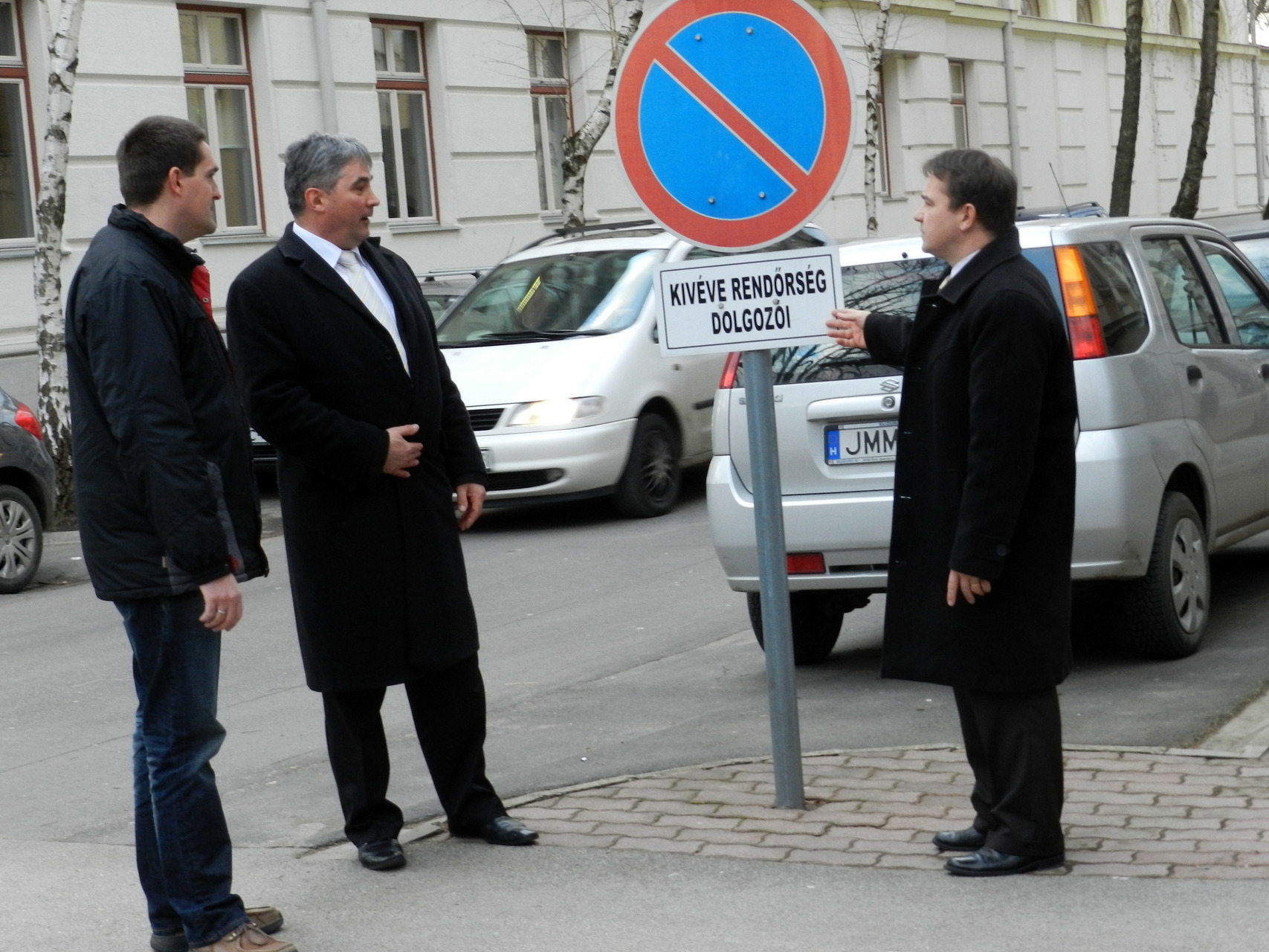 A Várakozni tilos tábla helyére a Behajtani tilos tábla kerül a Bacsó Béla utcában. Képünkön (balról jobbra): Serfőző Tamás, Kolysza Zoltán és Kónya István