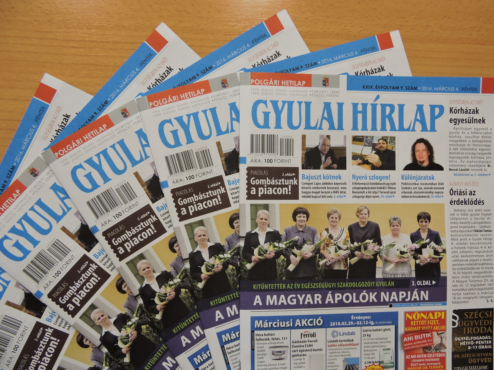 A XXIX. évfolyam 9. számában beszámolunk arról, hogy a gyulai és a békéscsabai kórház egyesülésével az ország negyedik legnagyobb egészségügyi intézménye jön létre. A szakemberek azt ígérik, hogy Békés megyében javul majd a betegellátás minősége és biztonsága. Óriási az érdeklődés a gyulaiaknak felkínált „tesztüzemes” kastélybejárás iránt. Fábián Tamás kommunikációs vezető elmondta, hogy néhány óra leforgása alatt ezernél is több regisztráló volt. A magyar ápolók napján egészségügyi dolgozókat tüntettek ki a Pándy kórházban. Nyerő szlogent írt Erdődi Ferenc Vilmos kisvárosi intermédia-művész. Súr Enikő ezúttal gombászni ment a gyulai piacra. A Gyulai Hírlapból azt is megtudhatják, hogy nem csak tűzoltásban, hanem fekvenyomásban is jók a gyulai lánglovagok. Az állásbörze rovatunkat ezen a héten se veszítsék szem elől, van benne álláslehetőség bőven. A rendőrségi hírekben prostitúcióról és kábítószerről is olvashatnak. Bajuszt köt az önkormányzat a MÁV-val című tudósításunkban részletesen beszámolunk a képviselő-testület interpellációs órájáról. Gyulán tanácskozott a Magyar Olimpiai Bizottság, illetve a Kárpát-medence legjobb helyesírói is nálunk mérték össze tudásukat. A Hangár rovatunkban szólunk a Dirty Slippers új lemezéről. Természetesen írunk a Körös Táncegyüttes jubileumi műsoráról. Olvasóinkat bevisszük a csordultig telt Mogyoróssy könyvtárba, ahol – nem mellesleg – olvasókör szerveződik. A csatlakozni vágyókat március 17-én várják a bibliotékába. József Dezső emlékkiállítás nyílik március 10-én a Kohán Képtárban. Ezen a héten Morgósnak keresünk gazdit a Gyulai Állatvédő Egyesülettel közösen. Érmekről, győzelmekről és vereségről is olvashatnak a sportoldalon. Szalai Ilona dietetikusunk ezúttal a csipkebogyóról ír nagyon jókat. Pomázi Ferenc kertészünk pedig tündérkertekről álmodik. Oláh Szabolcs jegyzetének a Különjáratok címet adta, s igaz, hogy buszokról ír benne, de nem arról beszél. Nagyon úgy tűnik, hogy esernyővel jön a tavasz, a Gyulai Hírlap mellett legyen önöknél is egy a jövő héten.